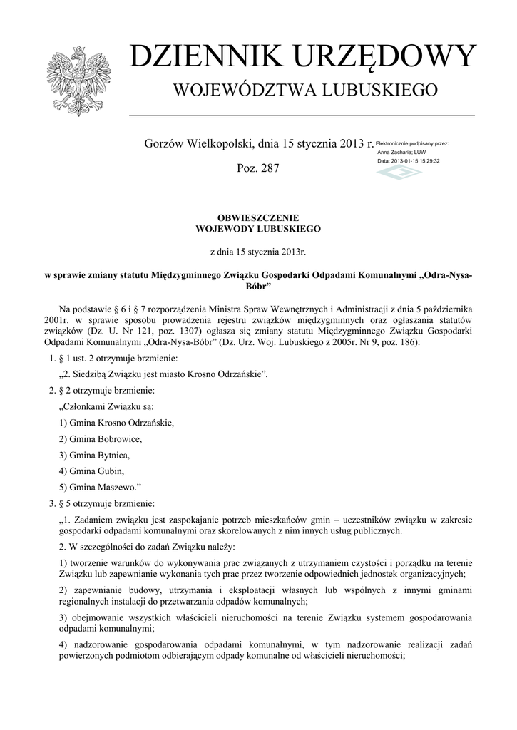 DZIENNIK URZĘDOWY WOJEWÓDZTWA LUBUSKIEGO Gorzów Wielkopolski, dnia 15 stycznia 2013 r. Elektronicznie podpisany przez: Anna Zacharia; LUW Poz. 287 Data: 2013-01-15 15:29:32 OBWIESZCZENIE WOJEWODY LUBUSKIEGO z dnia 15 stycznia 2013r. w sprawie zmiany statutu Międzygminnego Związku Gospodarki Odpadami Komunalnymi „Odra-NysaBóbr” Na podstawie § 6 i § 7 rozporządzenia Ministra Spraw Wewnętrznych i Administracji z dnia 5 października 2001r. w sprawie sposobu prowadzenia rejestru związków międzygminnych oraz ogłaszania statutów związków (Dz. U. Nr 121, poz. 1307) ogłasza się zmiany statutu Międzygminnego Związku Gospodarki Odpadami Komunalnymi „Odra-Nysa-Bóbr” (Dz. Urz. Woj. Lubuskiego z 2005r. Nr 9, poz. 186): 1. § 1 ust. 2 otrzymuje brzmienie: „2. Siedzibą Związku jest miasto Krosno Odrzańskie”. 2. § 2 otrzymuje brzmienie: „Członkami Związku są: 1) Gmina Krosno Odrzańskie, 2) Gmina Bobrowice, 3) Gmina Bytnica, 4) Gmina Gubin, 5) Gmina Maszewo.” 3. § 5 otrzymuje brzmienie: „1. Zadaniem związku jest zaspokajanie potrzeb mieszkańców gmin – uczestników związku w zakresie gospodarki odpadami komunalnymi oraz skorelowanych z nim innych usług publicznych. 2. W szczególności do zadań Związku należy: 1) tworzenie warunków do wykonywania prac związanych z utrzymaniem czystości i porządku na terenie Związku lub zapewnianie wykonania tych prac przez tworzenie odpowiednich jednostek organizacyjnych; 2) zapewnianie budowy, utrzymania i eksploatacji własnych lub wspólnych z innymi gminami regionalnych instalacji do przetwarzania odpadów komunalnych; 3) obejmowanie wszystkich właścicieli nieruchomości na terenie Związku systemem gospodarowania odpadami komunalnymi; 4) nadzorowanie gospodarowania odpadami komunalnymi, w tym nadzorowanie realizacji zadań powierzonych podmiotom odbierającym odpady komunalne od właścicieli nieruchomości; Dziennik Urzędowy Województwa Lubuskiego –2– Poz. 287 5) ustanowienie selektywnego zbierania odpadów komunalnych obejmującego co najmniej następujące frakcje odpadów: papieru, metalu, tworzywa sztucznego, szkła i opakowań wielomateriałowych oraz odpadów komunalnych ulegających biodegradacji, w tym odpadów opakowaniowych ulegających biodegradacji; 6) tworzenie punktów selektywnego zbierania odpadów komunalnych w sposób zapewniający łatwy dostęp dla wszystkich mieszkańców Związku, w tym wskazanie miejsca, w których mogą być prowadzone zbiórki zużytego sprzętu elektrycznego i elektronicznego pochodzącego z gospodarstw domowych; 7) zapewnienie osiągnięcia odpowiednich poziomów recyklingu i przygotowania do ponownego użycia następujących frakcji odpadów komunalnych: papieru, metali, tworzyw sztucznych i szkła; 8) zapewnienie osiągnięcia odpowiednich poziomów recyklingu, przygotowania do ponownego użycia i odzysku innymi metodami innych niż niebezpieczne odpadów budowlanych i rozbiórkowych; 9) zapewnienie odpowiedniego ograniczenia masy odpadów komunalnych ulegających biodegradacji przekazanych do składowania; 10) prowadzenie działań informacyjnych i edukacyjnych w zakresie prawidłowego gospodarowania odpadami komunalnymi, w szczególności w zakresie selektywnego zbierania odpadów komunalnych; 11) udostępnianie na stronie internetowej Związku oraz w sposób zwyczajowo przyjęty informacje o: a) podmiotach odbierających odpady komunalne od właścicieli nieruchomości z terenu Związku, zawierające firmę, oznaczenie siedziby i adres albo imię, nazwisko i adres podmiotu odbierającego odpady komunalne od właścicieli nieruchomości, b) miejscach zagospodarowania przez podmioty odbierające odpady komunalne od właścicieli nieruchomości z terenu danej gminy zmieszanych odpadów komunalnych, odpadów zielonych oraz pozostałości z sortowania odpadów komunalnych przeznaczonych do składowania, c) osiągniętych przez Związek oraz podmioty odbierające odpady komunalne od właścicieli nieruchomości, które nie działają na podstawie umowy na odbieranie odpadów komunalnych od właścicieli nieruchomości i nie świadczą takiej usługi w trybie zamówienia z wolnej ręki, w danym roku kalendarzowym wymaganych poziomach recyklingu, przygotowania do ponownego użycia i odzysku innymi metodami oraz ograniczenia masy odpadów komunalnych ulegających biodegradacji przekazywanych do składowania, d) punktach selektywnego zbierania odpadów komunalnych, zawierające firmę, oznaczenie siedziby i adres albo imię, nazwisko i adres prowadzącego punkt selektywnego zbierania odpadów komunalnych, adresy punktów selektywnego zbierania odpadów komunalnych na terenie Związku, wraz ze wskazaniem godzin przyjmowania odpadów, e) podmiotach zbierających zużyty sprzęt elektryczny i elektroniczny pochodzący z gospodarstw domowych, o których mowa w ustawie z dnia 29 lipca 2005r. o zużytym sprzęcie elektrycznym i elektronicznym (Dz. U. Nr 180, poz. 1495, z późn. zm.), zawierające firmę, oznaczenie siedziby i adres albo imię, nazwisko i adres zbierającego zużyty sprzęt elektryczny i elektroniczny, adresy punktów zbierania zużytego sprzętu elektrycznego i elektronicznego na terenie Związku; 12) dokonanie corocznej analizy stanu gospodarki odpadami komunalnymi, w celu weryfikacji możliwości technicznych i organizacyjnych Związku w zakresie gospodarowania odpadami komunalnymi, w tym: a) możliwości przetwarzania zmieszanych odpadów komunalnych, odpadów zielonych oraz pozostałości z sortowania odpadów komunalnych przeznaczonych do składowania, b) potrzeb inwestycyjnych związanych z gospodarowaniem odpadami komunalnymi, c) kosztów poniesionych w związku z odbieraniem, odzyskiem, recyklingiem i unieszkodliwianiem odpadów komunalnych, d) liczby mieszkańców, e) liczby właścicieli nieruchomości, którzy nie są zobowiązani do ponoszenia opłat za gospodarowanie, którzy nie zawarli stosownej umowy, w imieniu których Związek 