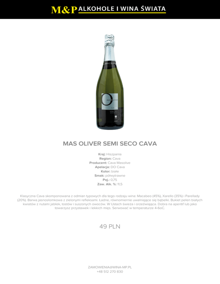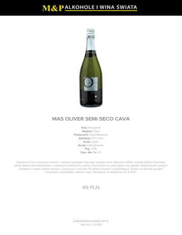 MAS OLIVER SEMI SECO CAVA Kraj: Hiszpania Region: Cava Producent: Cava Masolive Apelacja: DO Cava Kolor: białe Smak: półwytrawne Poj.: 0,75 Zaw. Alk. %: 11,5 Klasyczna Cava skomponowana z odmian typowych dla tego rodzaju wina: Macabeo (45%), Xarello (35%) i Parellady (20%). Barwa jasnosłomkowa z zielonymi refleksami. Ładne, równomiernie uwalniające się bąbelki. Bukiet pełen białych kwiatów z nutami jabłek, tostów i suszonych owoców. W Ustach świeża i orzeźwiająca. Dobra na aperitif lub jako towarzysz przystawek i lekkich mięs. Serwować w temperaturze 4-6oC. 49 PLN [email protected] +48 512 270 830