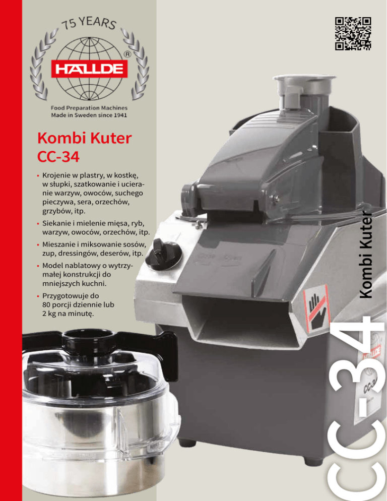 • Siekanie i mielenie mięsa, ryb, warzyw, owoców, orzechów, itp. • Mieszanie i miksowanie sosów, zup, dressingów, deserów, itp. • Model nablatowy o wytrzy małej konstrukcji do mniejszych kuchni. • Przygotowuje do 80 porcji dziennie lub 2 kg na minutę. C-34 •Krojenie w plastry, w kostkę, w słupki, szatkowanie i uciera nie warzyw, owoców, suchego pieczywa, sera, orzechów, grzybów, itp. Kombi Kuter Kombi Kuter CC-34 Małe urządzenie o dużych możliwościach Maksymalna niezawodność Urządzenia z serii Combi Cutter firmy HÄLLDE stanowią doskonałe uniwersalne rozwiązanie dla mniejszych kuchni. Urządzenie CC-34 łączy w sobie funkcje oferowane przez urządzenia typu kuter mikser i urządzenia do przygotowywania warzyw. Jest niew ielkie i kompaktowe, dzięki czemu można je łatwo schować i wyjąć w razie potrzeby. Mocny silnik dysponuje dużym mo mentem obrotowym, a jego prędkość obrotowa została zredukowana, dzięki czemu urządzenia CC-34 jest bardzo niezawodne, bez względu na rodzaj przetwarzanych produktów. Gdy silnik potrzebuje większej mocy, zostaje do niego doprowadzony większy prąd, co pozwala utrzymać równomierną prędkość obrotową. HALLDE Speed Selector Urządzenie CC-34 ma cztery prędkości: 500 i 800 obr/ min jako urządzenie do przygotowywania warzyw oraz 1450 i 2650 obr/min jako kuter-mikser. Urządzenie rozpoznaje automatycznie, jaka przystawka jest na nim zamontowana i samoczynnie dobiera dostępne prędkości. Konstrukcja zapewniająca maksymalną higienę Urządzenie CC-34 jest wykonane wyłącznie z materiałów posiadających certyfikaty higieniczne. Posiada ono gładkie powierzchnie i zaokrąglone brzegi, co eliminuje niepotrzebne zagłębienia, w których mogłyby utknąć resztki żywności. Wszystkie ruchome części można łatwo odłączyć, co poz wala na ich szybkie oczyszczenie i łatwe umycie urządzenia. Wszystkie ruchome części można umyć w zmywarce. Wyłącznie najlepsze materiały Podstawa jest wykonana z wytrzymałego tworzywa ABS, a komora robocza z metalu. Podajnik jest wykonany z poliwęglanu, a misa ze stali nierd zewnej. Ostrza narzędzi tnących są produkowane wyłącznie z najwyższej jakości nierdzewnej stali nożowej. Urządzenie do przygotowywania warzyw Kuter-mikser Misa kutra-miksera ma pojemność trzech litrów i posiada szczelną pokrywę, która umożliwia przygotowywanie większych ilości zarówno płynnych, jak i suchych produktów. Kuter-mikser ma dwie prędkości robocze: 1450 i 2650 obr/min. Oprócz tego posiada funkcję natychmiast owego włączenia obrotów maksymalnych. Funkcja ta zapewnia lepszą kontrolę nad rozdrabnianiem i mieszaniem produktów. Podniesienie tarczy dociskowej powoduje zatrzymanie urządzenia i umożliwia załadowanie produktu. Zamknięcie tarczy powoduje ponowne uruchomienie urządzenia i umożliwia kontynuowanie pracy. Ta funk cja automatycznego włączania i wyłączania pozwala na bardziej wydajną pracę. Jest to niewątpliwa zaleta, szczególnie przy przy gotowywaniu większych ilości produktów. Podajnik jest wyposażony w rurę podającą do długich, wąskich produktów, takich jak ogórki i por. Inteligentne rozwiązania Urządzenie CC-34 posiada opatentowany system zgarniający z trzema ramionami. Utrzymują one wnętrze misy i pokrywy w czystości. Jednocześnie podczas obróbki kierują produkt w kierunku noży. Budowa i kąt ustawienia noży w połączeniu z ramionami zgarniającymi sprawiają, że produkty są przez cały czas przekręcane w misie, dzięki czemu cała zawartość zostaje równomiernie rozdrobniona i wymieszana. Pozwala to uzyskać doskonały rezultat w krótkim czasie. Ostrza noży są ząbkowane, co zwiększa ich odporność na zużycie. Podwójne zabezpieczenie przed nieosłoniętym nożem Usunięcie podajnika powoduje całkowite odcięcie zasilania. Dzięki temu podwójnemu zabezpieczeniu nie jest możliwe włączenie się maszyny, gdy nóż jest nieosłonięty. Narzędzia tnące do wszystkich zadań Dzięki naszej bogatej ofercie narzędzi tnących o średnicy 185 mm urządzenie CC-34 rad zi sobie ze wszelkimi możliwymi zadaniami. Urządzenie CC-34 kroi w plastry, kostki, wiór ki, słupki, plastry karbowane zarówno twarde, jak i miękkie produkty. Akcesoria 2-pak narzędzi tnących 4-pak narzędzi tnących Wieszak ścienny Szczotka do czyszczenia Wysokiej jakości narzędzia tnące dla optymalnych wyników Wszystkie narzędzia tnące można myć w zmywarce. Plastry (stal nierdzewna) 1, 2, 4, 6 mm. * 0.5, 1.5, 3, 5, 7, 8, 9, 10, 15 mm. Delikatne plastry * 15 mm. Plastry do miękkich warzyw * 8, 10, 12, 15 mm. Plastry karbowane (stal nierdzewna) 4 mm. (stal nierdzewna) 2x2, 4x4 mm. * Narzędzia przeznaczone do RG-100, pasują do CC-34. Przeznaczone do cięcia twardych i miękkich warzyw, owoców, grzybów, itp. Można ciąć w kostkę w zestawieniu z odpowiednią tarczą z kratką kostkującą. Przeznaczone do cięcia miękkich warzyw, owoców, grzybów, itp. Zalecane do cięcia miękkich produktów w kostkę, Do cięcia w karbowane plastry buraków, ogórków, marchwi, itp. * 2, 3, 5, 6 mm. Słupki * 2x6, 3x3 mm. Wiórki (stal nierdzewna) 2, 4, 6 mm. Przeznaczone do cięcia twardych i miękkich warzyw, owoców, grzybów, itp. Do cięcia w kostkę przy zastosowaniu dodatkowej tarczyz kratką kostkującą. Do krojenia ziemniaków na frytki przy zastosowaniu odpowiedniej tarczyz kratką kostkującą * 1.5, 3, 4.5, 8, 10 mm. Do cięcia w słupki twardych produktów do zup, sałatek, potrawek, dekorowania, itp. Pasuje do cięcia lekko wygiętych czipsów ziemniaczanych/ frytek. Do szatkowania kapusty i marchwi do surówek. Rozdrabnia orzechy, migdały i suche pieczywo. Tarcza 6 lub 8 mm jest powszechnie używana do ucierania serów do pizzy i szatkowania kapusty. * Tarcza do rozdrabniania * Drobna/Bardzo drobna * Tarcza do twardego sera Pasuje do dokładnego rozdrabniania produktów, takich jak surowe ziemniaki do placków, s