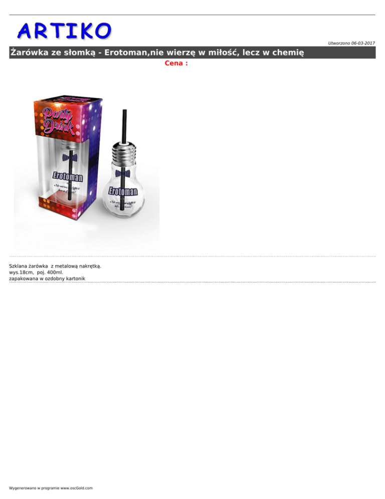 Utworzono 06-03-2017 Żarówka ze słomką - Erotoman,nie wierzę w miłość, lecz w chemię Cena : Szklana żarówka z metalową nakrętką. wys.18cm, poj. 400ml. zapakowana w ozdobny kartonik Wygenerowano w programie www.oscGold.com