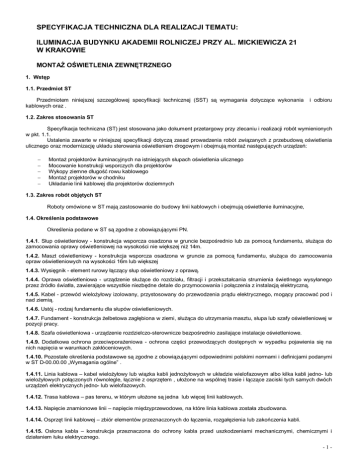 SPECYFIKACJA TECHNICZNA DLA REALIZACJI TEMATU: ILUMINACJA BUDYNKU AKADEMII ROLNICZEJ PRZY AL. MICKIEWICZA 21 W KRAKOWIE MONTAŻ OŚWIETLENIA ZEWNĘTRZNEGO 1. Wstęp 1.1. Przedmiot ST Przedmiotem niniejszej szczegółowej specyfikacji technicznej (SST) są wymagania dotyczące wykonania kablowych oraz . i odbioru 1.2. Zakres stosowania ST Specyfikacja techniczna (ST) jest stosowana jako dokument przetargowy przy zlecaniu i realizacji robót wymienionych w pkt. 1.1. Ustalenia zawarte w niniejszej specyfikacji dotyczą zasad prowadzenia robót związanych z przebudową oświetlenia ulicznego oraz modernizację układu sterowania oświetleniem drogowym i obejmują montaż następujących urządzeń: − − − − − Montaż projektorów iluminacyjnych na istniejących słupach oświetlenia ulicznego Mocowanie konstrukcji wsporczych dla projektorów Wykopy ziemne długość rowu kablowego Montaż projektorów w chodniku Układanie linii kablowej dla projektorów doziemnych 1.3. Zakres robót objętych ST Roboty omówione w ST mają zastosowanie do budowy linii kablowych i obejmują oświetlenie iluminacyjne, 1.4. Określenia podstawowe Określenia podane w ST są zgodne z obowiązującymi PN. 1.4.1. Słup oświetleniowy - konstrukcja wsporcza osadzona w gruncie bezpośrednio lub za pomocą fundamentu, służąca do zamocowania oprawy oświetleniowej na wysokości nie większej niż 14m. 1.4.2. Maszt oświetleniowy - konstrukcja wsporcza osadzona w gruncie za pomocą fundamentu, służąca do zamocowania opraw oświetleniowych na wysokości 16m lub większej 1.4.3. Wysięgnik - element rurowy łączący słup oświetleniowy z oprawą. 1.4.4. Oprawa oświetleniowa - urządzenie służące do rozdziału, filtracji i przekształcania strumienia świetlnego wysyłanego przez źródło światła, zawierające wszystkie niezbędne detale do przymocowania i połączenia z instalacją elektryczną. 1.4.5. Kabel - przewód wielożyłowy izolowany, przystosowany do przewodzenia prądu elektrycznego, mogący pracować pod i nad ziemią. 1.4.6. Ustój - rodzaj fundamentu dla słupów oświetleniowych. 1.4.7. Fundament - konstrukcja żelbetowa zagłębiona w ziemi, służąca do utrzymania masztu, słupa lub szafy oświetleniowej w pozycji pracy. 1.4.8. Szafa oświetleniowa - urządzenie rozdzielczo-sterownicze bezpośrednio zasilające instalacje oświetleniowe. 1.4.9. Dodatkowa ochrona przeciwporażeniowa - ochrona części przewodzących dostępnych w wypadku pojawienia się na nich napięcia w warunkach zakłóceniowych. 1.4.10. Pozostałe określenia podstawowe są zgodne z obowiązującymi odpowiednimi polskimi normami i definicjami podanymi w ST D-00.00.00 „Wymagania ogólne” . 1.4.11. Linia kablowa – kabel wielożyłowy lub wiązka kabli jednożyłowych w układzie wielofazowym albo kilka kabli jedno- lub wielożyłowych połączonych równolegle, łącznie z osprzętem , ułożone na wspólnej trasie i łączące zaciski tych samych dwóch urządzeń elektrycznych jedno- lub wielofazowych. 1.4.12. Trasa kablowa – pas terenu, w którym ułożone są jedna lub więcej linii kablowych. 1.4.13. Napięcie znamionowe linii – napięcie międzyprzewodowe, na które linia kablowa została zbudowana. 1.4.14. Osprzęt linii kablowej – zbiór elementów przeznaczonych do łączenia, rozgałęzienia lub zakończenia kabli. 1.4.15. Osłona kabla – konstrukcja przeznaczona do ochrony kabla przed uszkodzeniami mechanicznymi, chemicznymi i działaniem łuku elektrycznego. -1- 1.4.16. Przykrycie – osłona ułożona nad kablem w celu ochrony przed mechanicznym uszkodzeniem od góry. 1.4.17. Przegroda – osłona ułożona wzdłuż kabla w celu oddzielenia go od sąsiedniego kabla lub innych urządzeń. 1.4.18. Skrzyżowanie – takie miejsce na trasie linii kablowej, w którym jakąkolwiek cześć rzutu poziomego linii kablowej przecina lub pokrywa jakąkolwiek część rzutu poziomego innej linii kablowej lub innego urządzenia podziemnego. 1.4.19. Zbliżenie – takie miejsce na trasie linii kablowej , w którym odległość między linią kablową, urządzeniem podziemnym lub drogą komunikacyjną itp. jest mniejsza niż odległość dopuszczalna dla danych warunków układania bez stosowania przegród lub osłon zabezpieczających i w którym nie występuje skrzyżowanie . 1.4.20. Przepust kablowy – konstrukcja o przekroju okrągłym przeznaczona do ochrony kabla przed uszkodzeniami mechanicznymi, chemicznymi i działaniem łuku elektrycznego. 1.4.21. Dodatkowa ochrona przeciwporażeniowa – ochrona części przewodzących, dostępnych w wypadku pojawienia się na nich napięcia w warunkach zakłóceniowych. 1.4.22. Przystawka pomiarowa – urządzenie wykonane w formie skrzynki z blachy lub tworzywa sztucznego przeznaczone do pomiaru energii elektrycznej zużywanej przez plac budowy. 1.4.2. Pozostałe określenia podstawowe są zgodne z obowiązującymi, odpowiednimi polskimi normami i z definicjami podanymi w SST 231.01.00.00 „Wymagania ogólne” pkt 1.4. 2. MATERIAŁY 2.1. Ogólne wymagania dotyczące materiałów Ogólne wymagania dotyczące materiałów, ich pozyskiwania i składowania podano w SST 231.01.00.00 „Wymagania ogólne” pkt 2. Wszystkie użyte do wykonania materiały muszą być zgodne z dokumentacją projektową i odpowiadać normom. Przewidziano następujące materiały: przewody robocze – YKY 3x2.5mm2 projektory oświetleniowe przewody do opraw konstrukcje wsporcze dla projektorów rury ochronne 2.2. Materiały do wykonania ustroju. Dokumentacja projektowa nie przewiduje montażu ustojów 2.3. Materiały stosowane przy układaniu kabli 2.3.1. Piasek Piasek stosowany przy układaniu kabli powinien być co najmniej gatunku „3”, odpowiadającego wymaganiom BN87/6774-04. 2.3.2. Folia Folia służąca do osłony kabla przed uszkodzeniami mechanicznymi, powinna być folią kalandrowaną z uplastycznionego PCW o grubości od 0,4 do 0,6 mm, gatunku I, odpowiadającą