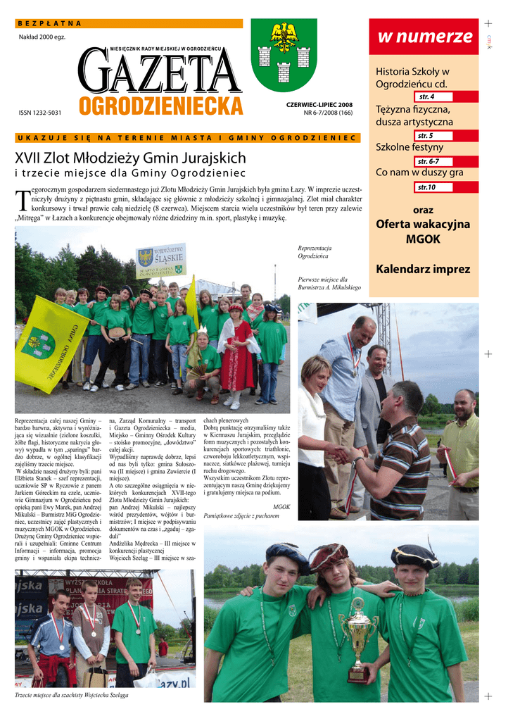 B E Z P Ł AT N A Historia Szkoły w Ogrodzieńcu cd. CZERWIEC-LIPIEC 2008 NR 6-7/2008 (166) ISSN 1232-5031 U K A Z U J E S I Ę N A T E R E N I E M I A S TA I G M I N Y O G R O D Z I E N I E C XVII Zlot Młodzieży Gmin Jurajskich T Reprezentacja Ogrodzieńca Pierwsze miejsce dla Burmistrza A. Mikulskiego Trzecie miejsce dla szachisty Wojciecha Szeląga chach plenerowych Dobrą punktację otrzymaliśmy także w Kiermaszu Jurajskim, przeglądzie form muzycznych i pozostałych konkurencjach sportowych: triathlonie, czworoboju lekkoatletycznym, wspinaczce, siatkówce plażowej, turnieju ruchu drogowego. Wszystkim uczestnikom Zlotu reprezentującym naszą Gminę dziękujemy i gratulujemy miejsca na podium. MGOK Pamiątkowe zdjęcie z pucharem str. 5 Szkolne festyny Co nam w duszy gra egorocznym gospodarzem siedemnastego już Zlotu Młodzieży Gmin Jurajskich była gmina Łazy. W imprezie uczestniczyły drużyny z piętnastu gmin, składające się głównie z młodzieży szkolnej i gimnazjalnej. Zlot miał charakter konkursowy i trwał prawie całą niedzielę (8 czerwca). Miejscem starcia wielu uczestników był teren przy zalewie „Mitręga” w Łazach a konkurencje obejmowały różne dziedziny m.in. sport, plastykę i muzykę. na, Zarząd Komunalny – transport i Gazeta Ogrodzieniecka – media, Miejsko – Gminny Ośrodek Kultury – stoisko promocyjne, „dowództwo” całej akcji. Wypadliśmy naprawdę dobrze, lepsi od nas byli tylko: gmina Sułoszowa (II miejsce) i gmina Zawiercie (I miejsce). A oto szczególne osiągnięcia w niektórych konkurencjach XVII-tego Zlotu Młodzieży Gmin Jurajskich: pan Andrzej Mikulski – najlepszy wśród prezydentów, wójtów i burmistrzów; I miejsce w podpisywaniu dokumentów na czas i „zgaduj – zgaduli” Andżelika Mędrecka – III miejsce w konkurencji plastycznej Wojciech Szeląg – III miejsce w sza- Tężyzna fizyczna, dusza artystyczna str. 6-7 i tr ze c i e m i ejsce d la Gminy O grodzieniec Reprezentacja całej naszej Gminy – bardzo barwna, aktywna i wyróżniająca się wizualnie (zielone koszulki, żółte flagi, historyczne nakrycia głowy) wypadła w tym „sparingu” bardzo dobrze, w ogólnej klasyfikacji zajęliśmy trzecie miejsce. W składzie naszej drużyny byli: pani Elżbieta Stanek – szef reprezentacji, uczniowie SP w Ryczowie z panem Jarkiem Góreckim na czele, uczniowie Gimnazjum w Ogrodzieńcu pod opieką pani Ewy Marek, pan Andrzej Mikulski – Burmistrz MiG Ogrodzieniec, uczestnicy zajęć plastycznych i muzycznych MGOK w Ogrodzieńcu. Drużynę Gminy Ogrodzieniec wspierali i uzupełniali: Gminne Centrum Informacji – informacja, promocja gminy i wspaniała ekipa technicz- str. 4 str.10 oraz Oferta wakacyjna MGOK Kalendarz imprez cmyk w numerze Nakład 2000 egz. 2 Gazeta Ogrodzieniecka RADNI PYTAJĄ Podczas sesji Rady Miejskiej w Ogrodzieńcu, która odbyła się w dniu 28 maja 2008r. wpłynęły następujące interpelacje i zapytania radnych: Zdzisław Mogiła zwrócił się z prośbą o naprawienie drogi dojazdowej do posesji przy ulicy Starowiejskiej na odcinku od skrzyżowania z ulicą Turystyczną w Kiełkowicach. Jerzy Kołodziej – Mieszkańcy ulic Sienkiewicza i Słowackiego „bloki” zwracają się z prośbą o lokalizację przejścia dla pieszych na skrzyżowaniu tych ulic z ulicą Kościuszki. Mieszkańcom „bloków” ułatwi to bezpieczne dojście do przystanku autobusowego, a dzieciom z ulicy Sienkiewicza bezpieczne dojście do szkoły. Robert Łypaczewski poruszył temat Domu Nauczyciela w Gieble, w którym faktycznie nikt nie mieszka a budynek jest zaniedbany. Radny zapytał: kiedy wykonane zostaną progi zwalniające na drodze do Gulzowa oraz kiedy można się spodziewać konkretnych decyzji odnośnie oświetlenia na ulicy Mokruskiej. Grzegorz Wałek odczytał pismo mieszkańców bloków przy ulicy Słowackiego, w którym lokatorzy bloku nr 7 zwracają się z prośbą o remont ściany zachodniej. Ściana ta jest w fatalnym stanie, odpada tynk, cegły. Według lokatorów remont ściany jest konieczny i ważniejszy niż naprawa kominów. Lokatorzy podkreślają, że solidnie odprowadzają składki za czynsz i opłaty remontowe i zwracają się o poparcie ich prośby. Burmistrz w odpowiedzi na interpelacje poinformował: Dojazd do posesji w Kiełkowicach przy ul. Starowiejskiej. W miejscu tym potrzebne jest wykonanie odwodnienia. Na ten cel należy zabezpieczyć środki w budżecie gminy. Skrzyżowanie ulicy Kościuszki ze Słowackiego. Przewidziane jest tam przejście dla pieszych,ale dopiero po remoncie drogi. Zarządcą tej drogi jest Zarząd Dróg Wojewódzkich i przy przebudo- wie drogi przejście będzie wykonane. Dom nauczyciela w Gieble. Jest tam zameldowana jedna osoba – pracownik szkoły z Ogrodzieńca. Na chwilę obecną nie mamy innego, wolnego mieszkania komunalnego Progi zwalniające na drodze do Gulzowa. Szukamy osoby z uprawnieniami, która zrobiłaby kompleksowo projekt organizacji ruchu drogowego w całej gminie. Po zatwierdzeniu przez Starostę i Marszałka projekt byłby dostosowany do aktualnych potrzeb mieszkańców. Samowolnie nie możemy tego wykonać. Oświetlenie ulicy Mokruskiej w Gieble. W tym roku wykonaliśmy KALENDARZ ODBIORU ODPADÓW KOMUNANYCH OD MIESZKAŃCÓW MIASTA I GMINY OGRODZIENIEC PRZEZ FIRMĘ „REMONDIS” Sp. z o.o.: GMINA OGRODZIENIEC CMENTARNA, BZOWSKA, CICHA, SŁONECZNA, SZKOLNA, FUGASÓWKA, MARKOWIZNA SŁOWACKIEGO 01.07.2008 r. 02.07.2008 r. 29.07.2008 r. 30.07.2008 r. 26.08.2008 r. + ODBIÓR ODPADÓW SEGREGOWANYCH 27.08.2008 r. + ODBIÓR ODPADÓW SEGREGOWANYCH 23.09.2008 r. 24.09.2008 r. 21.10.2008 r. 22.10.2008 r. 18.11.2008 r. + ODBIÓR ODPADÓW SEGREGOWANYCH 10.11.2008 r. + ODBIÓR ODPADÓW SEGREGOWANYCH 16.12.2008 r. 17.12.2008 r. GIEBŁO, MOKRUS KOŚCIUSZKI, MICKIEWICZA, ORZESZKOWEJ, WODNA 28.07.2008 r. 01.07.2008 r. 25.08.2008 r. + ODBIÓR ODPADÓW SEGREGOWANYCH 29.07.2008 r. 22.09.2008 r. 26.08.2008 r. + ODBIÓR ODPADÓW SEGREGOWA