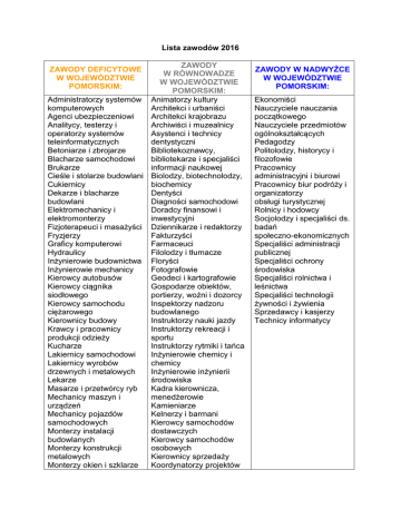 Lista zawodów 2016 ZAWODY W RÓWNOWADZE W WOJEWÓDZTWIE POMORSKIM: Administratorzy systemów Animatorzy kultury komputerowych Architekci i urbaniści Agenci ubezpieczeniowi Architekci krajobrazu Analitycy, testerzy i Archiwiści i muzealnicy operatorzy systemów Asystenci i technicy teleinformatycznych dentystyczni Betoniarze i zbrojarze Bibliotekoznawcy, Blacharze samochodowi bibliotekarze i specjaliści Brukarze informacji naukowej Cieśle i stolarze budowlani Biolodzy, biotechnolodzy, Cukiernicy biochemicy Dekarze i blacharze Dentyści Diagności samochodowi budowlani Elektromechanicy i Doradcy finansowi i elektromonterzy inwestycyjni Fizjoterapeuci i masażyści Dziennikarze i redaktorzy Fakturzyści Fryzjerzy Farmaceuci Graficy komputerowi Hydraulicy Filolodzy i tłumacze Inżynierowie budownictwa Floryści Inżynierowie mechanicy Fotografowie Kierowcy autobusów Geodeci i kartografowie Kierowcy ciągnika Gospodarze obiektów, siodłowego portierzy, woźni i dozorcy Kierowcy samochodu Inspektorzy nadzoru ciężarowego budowlanego Instruktorzy nauki jazdy Kierownicy budowy Krawcy i pracownicy Instruktorzy rekreacji i produkcji odzieży sportu Kucharze Instruktorzy rytmiki i tańca Lakiernicy samochodowi Inżynierowie chemicy i Lakiernicy wyrobów chemicy drzewnych i metalowych Inżynierowie inżynierii Lekarze środowiska Masarze i przetwórcy ryb Kadra kierownicza, Mechanicy maszyn i menedżerowie urządzeń Kamieniarze Kelnerzy i barmani Mechanicy pojazdów samochodowych Kierowcy samochodów Monterzy instalacji dostawczych Kierowcy samochodów budowlanych Monterzy konstrukcji osobowych metalowych Kierownicy sprzedaży Koordynatorzy projektów Monterzy okien i szklarze ZAWODY DEFICYTOWE W WOJEWÓDZTWIE POMORSKIM: ZAWODY W NADWYŻCE W WOJEWÓDZTWIE POMORSKIM: Ekonomiści Nauczyciele nauczania początkowego Nauczyciele przedmiotów ogólnokształcących Pedagodzy Politolodzy, historycy i filozofowie Pracownicy administracyjni i biurowi Pracownicy biur podróży i organizatorzy obsługi turystycznej Rolnicy i hodowcy Socjolodzy i specjaliści ds. badań społeczno-ekonomicznych Specjaliści administracji publicznej Specjaliści ochrony środowiska Specjaliści rolnictwa i leśnictwa Specjaliści technologii żywności i żywienia Sprzedawcy i kasjerzy Technicy informatycy Murarze Operatorzy i mechanicy sprzętu do robót ziemnych Operatorzy obrabiarek skrawających Opiekunowie osoby starszej lub niepełnosprawnej Piekarze Pielęgniarki Posadzkarze Pracownicy obsługi ruchu szynowego Pracownicy telefonicznej i elektronicznej obsługi klienta, ankieterzy, teleankieterzy Programiści i administratorzy stron internetowych Projektanci i administratorzy baz danych Przedstawiciele handlowi Robotnicy budowlani Robotnicy obróbki drewna i stolarze Samodzielni księgowi Spawacze metodą MIG/MAG Spawacze metodą TIG Spawacze ręczni gazowi Spawacze ręczni łukiem elektrycznym Specjaliści automatyki i robotyki Specjaliści ds. bezpieczeństwa i jakości Specjaliści ds. organizacji produkcji Specjaliści ds. zastosowań informatyki Spedytorzy i logistycy Szefowie kuchni Ślusarze Technicy elektrycy Technolodzy robót wykończeniowych w budownictwie unijnych Kosmetyczki Listonosze i kurierzy Magazynierzy Malarze budowlani Monterzy elektronicy Monterzy maszyn i urządzeń Nauczyciele języków obcych, lektorzy Nauczyciele praktycznej nauki zawodu Nauczyciele przedmiotów zawodowych Nauczyciele przedszkoli Nauczyciele szkół specjalnych Obuwnicy Ogrodnicy Operatorzy maszyn do produkcji wyrobów cementowych i kamiennych Operatorzy maszyn do produkcji wyrobów z gumy i tworzyw sztucznych Operatorzy urządzeń dźwigowo-transportowych Operatorzy wózków jezdniowych Opiekunki dziecięce Palacze kotłów CO Plastycy i dekoratorzy wnętrz Położne Pomoce kuchenne Pracownicy ds. budownictwa drogowego Pracownicy ds. rachunkowości i księgowości Pracownicy fizyczni Pracownicy myjni Pracownicy poczty Pracownicy pralni i prasowalni Pracownicy produkcyjni Pracownicy przetwórstwa metali Pracownicy przetwórstwa spożywczego Pracownicy służb mundurowych i ochrony Pracownicy socjalni Pracownicy sprzedaży internetowej Prawnicy Psycholodzy i psychoterapeuci Ratownicy medyczni Recepcjoniści i rejestratorzy Robotnicy leśni Robotnicy poligraficzni Sekretarki Specjaliści ds. finansowych Specjaliści ds. marketingu i sprzedaży Specjaliści ds. public relations i reklamy Specjaliści ds. rynku nieruchomości Specjaliści ds. zamówień publicznych Specjaliści ds. zarządzania zasobami ludzkimi i rekrutacji Specjaliści elektroniki i telekomunikacji Sprzątaczki i pokojowe Tapicerzy Technicy budownictwa Technicy mechanicy Terapeuci zajęciowi Tynkarze Weterynarze Wychowawcy w placówkach oświatowych i opiekuńczych Zaopatrzeniowcy i dostawcy