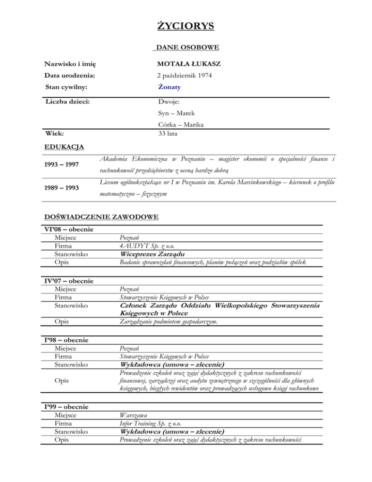 ŻYCIORYS DANE OSOBOWE Nazwisko i imię MOTAŁA ŁUKASZ Data urodzenia: 2 październik 1974 Stan cywilny: Żonaty Liczba dzieci: Dwoje: Syn – Marek Wiek: Córka – Marika 33 lata EDUKACJA 1993 – 1997 1989 – 1993 Akademia Ekonomiczna w Poznaniu – magister ekonomii o specjalności finanse i rachunkowość przedsiębiorstw z oceną bardzo dobrą Liceum ogólnokształcące nr I w Poznaniu im. Karola Marcinkowskiego – kierunek o profilu matematyczno – fizycznym DOŚWIADCZENIE ZAWODOWE VI’08 – obecnie Miejsce Firma Stanowisko Opis IV’07 – obecnie Miejsce Firma Stanowisko Opis I’98 – obecnie Miejsce Firma Stanowisko Opis I’99 – obecnie Miejsce Firma Stanowisko Opis Poznań 4AUDYT Sp. z o.o. Wiceprezes Zarządu Badanie sprawozdań finansowych, planów połączeń oraz podziałów spółek Poznań Stowarzyszenie Księgowych w Polsce Członek Zarządu Oddziału Wielkopolskiego Stowarzyszenia Księgowych w Polsce Zarządzanie podmiotem gospodarczym. Poznań Stowarzyszenie Księgowych w Polsce Wykładowca (umowa – zlecenie) Prowadzenie szkoleń oraz zajęć dydaktycznych z zakresu rachunkowości finansowej, zarządczej oraz audytu zewnętrznego w szczególności dla głównych księgowych, biegłych rewidentów oraz prowadzących usługowo księgi rachunkowe Warszawa Infor Training Sp. z o.o. Wykładowca (umowa – zlecenie) Prowadzenie szkoleń oraz zajęć dydaktycznych z zakresu rachunkowości finansowej, zarządczej oraz audytu zewnętrznego w szczególności dla głównych księgowych, biegłych rewidentów oraz prowadzących usługowo księgi rachunkowe I’07 – VI’08 Miejsce Firma Stanowisko Opis VII’97 – X’05 Miejsce Firma Stanowisko Opis VII’06 – XII’06 Miejsce Firma Stanowisko Opis I’04 – III’06 Miejsce Firma Stanowisko Opis X’03 – XII’04 Miejsce Firma Stanowisko Opis XI’01 – XII’03 Miejsce Firma Stanowisko Opis VII’01 – XI’01 Miejsce Firma Stanowisko Opis Poznań Sarnowski & Wiśniewski Spółka Audytorska Sp. z o.o. Manager / Partner Badanie sprawozdań finansowych, planów połączeń oraz podziałów spółek Poznań Katedra Rachunkowości Akademii Ekonomicznej w Poznaniu Asystent Prowadzenie zajęć dydaktycznych z zakresu rachunkowości finansowej oraz zarządczej. Poznań / Wronki KKS Lech Poznań SSA Kontroler finansowy Budowanie planów finansowych, kontrola realizacji budżetów, sprawozdawczość wg u.o.r. oraz MSR Poznań P.H. Metalzbyt Poznań S.A. w likwidacji Likwidator (umowa – zlecenie) Zarządzanie podmiotem gospodarczym, prowadzenie procesu likwidacji Poznań P.H. Metalzbyt Poznań S.A. Prezes Zarządu Zarządzanie podmiotem gospodarczym Poznań Chaffoteaux et Maury Polska Sp. z o.o Dyrektor / Likwidator Zarządzanie podmiotem gospodarczym, przeprowadzenie procesu likwidacji. Poznań Chaffoteaux et Maury Polska Sp. z o.o Główny księgowy / kontroler finansowy Prowadzenie ksiąg rachunkowych, sporządzanie sprawozdań finansowych wg prawa polskiego oraz grupy kapitałowej (wg. MSR), sporządzanie deklaracji podatkowych, parapodatkowych oraz do ZUS, raportowanie danych do spółki dominującej, kontrola kosztów, itp. 2 VI’00 – VII’01 Miejsce Firma Stanowisko Opis XI’99 – VI’00 Miejsce Firma Stanowisko Opis VI’98 – VI’00 Miejsce Firma Stanowisko Opis IX’97 – VI’98 Miejsce Firma Stanowisko Opis Poznań PHARMGAS Sp. z o.o Specjalista ds. Controlingu Kontrola efektywności ekonomicznej zleceń produkcyjnych, wdrożenie systemu budżetowania Poznań Spółka doradztwa podatkowego Romus Sp. z o.o. Samodzielny księgowy Prowadzenie ksiąg rachunkowych, sporządzanie sprawozdań finansowych wg prawa polskiego, sporządzanie deklaracji podatkowych, parapodatkowych oraz do ZUS, itp. Poznań Biuro Biegłego Rewidenta Barbara Urbanowicz Asystent biegłego rewidenta Uczestnictwo w badaniu sprawozdań finansowych, Poznań Liceum Ekonomiczne imienia Stanisława Staszica Nauczyciel rachunkowości Prowadzenie zajęć dydaktycznych z zakresu rachunkowości finansowej, zarządczej oraz audytu zewnętrznego. 3