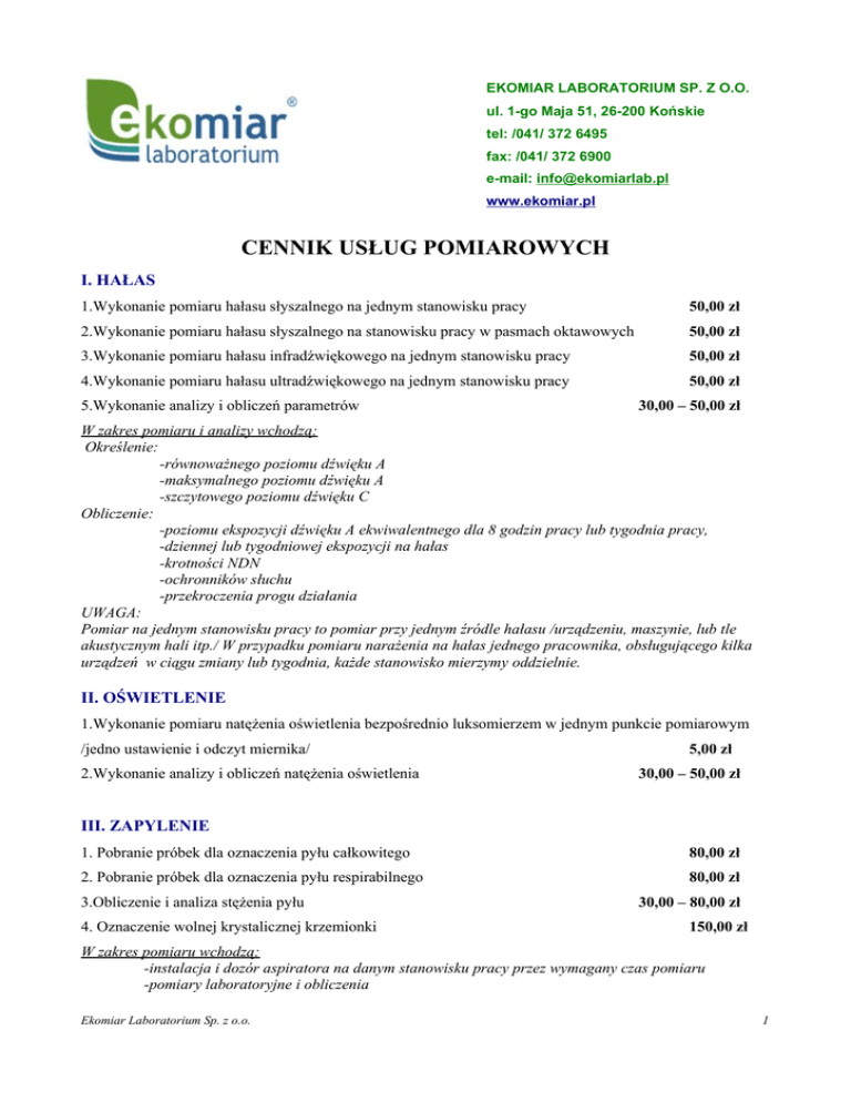EKOMIAR LABORATORIUM SP. Z O.O. ul. 1-go Maja 51, 26-200 Końskie tel: /041/ 372 6495 fax: /041/ 372 6900 e-mail: [email protected] www.ekomiar.pl CENNIK USŁUG POMIAROWYCH I. HAŁAS 1.Wykonanie pomiaru hałasu słyszalnego na jednym stanowisku pracy 50,00 zł 2.Wykonanie pomiaru hałasu słyszalnego na stanowisku pracy w pasmach oktawowych 50,00 zł 3.Wykonanie pomiaru hałasu infradźwiękowego na jednym stanowisku pracy 50,00 zł 4.Wykonanie pomiaru hałasu ultradźwiękowego na jednym stanowisku pracy 50,00 zł 5.Wykonanie analizy i obliczeń parametrów 30,00 – 50,00 zł W zakres pomiaru i analizy wchodzą: Określenie: -równoważnego poziomu dźwięku A -maksymalnego poziomu dźwięku A -szczytowego poziomu dźwięku C Obliczenie: -poziomu ekspozycji dźwięku A ekwiwalentnego dla 8 godzin pracy lub tygodnia pracy, -dziennej lub tygodniowej ekspozycji na hałas -krotności NDN -ochronników słuchu -przekroczenia progu działania UWAGA: Pomiar na jednym stanowisku pracy to pomiar przy jednym źródle hałasu /urządzeniu, maszynie, lub tle akustycznym hali itp./ W przypadku pomiaru narażenia na hałas jednego pracownika, obsługującego kilka urządzeń w ciągu zmiany lub tygodnia, każde stanowisko mierzymy oddzielnie. II. OŚWIETLENIE 1.Wykonanie pomiaru natężenia oświetlenia bezpośrednio luksomierzem w jednym punkcie pomiarowym /jedno ustawienie i odczyt miernika/ 2.Wykonanie analizy i obliczeń natężenia oświetlenia 5,00 zł 30,00 – 50,00 zł III. ZAPYLENIE 1. Pobranie próbek dla oznaczenia pyłu całkowitego 80,00 zł 2. Pobranie próbek dla oznaczenia pyłu respirabilnego 80,00 zł 3.Obliczenie i analiza stężenia pyłu 4. Oznaczenie wolnej krystalicznej krzemionki 30,00 – 80,00 zł 150,00 zł W zakres pomiaru wchodzą: -instalacja i dozór aspiratora na danym stanowisku pracy przez wymagany czas pomiaru -pomiary laboratoryjne i obliczenia Ekomiar Laboratorium Sp. z o.o. 1 IV. WIBRACJA 1. Pomiar drgań w jednym punkcie pomiarowym 200,00 zł V. POMIARY STĘŻEŃ SUBSTANCJI SZKODLIWYCH 1. Pomiar /tlenek węgla/ 5,00zł 2.Wykonanie analizy i obliczeń 50,00zł VI. MIKROKLIMAT 1. Pomiar/badanie mikroklimatu 150,00 zł 2.analiza i obliczenia do mikroklimatu 50,00 zł VII. POMIARY SUBSTANCJI CHEMICZNYCH 400,00zł VIII. POMIAR TWARDOŚCI /próbka/ 10,00 zł IX. POMIAR WYTRZYMAŁOŚCI 25,00 zł X. ANALIZA SKŁADU CHEMICZNEGO /5 PIERWIASTKÓW/ 75,00 zł XI. SZKOLENIA OKRESOWE 1.pracownik fizyczny 30,00zł 2.kierownik/brygadzista 50,00 zł 3.pracodawca 100,00zł XII. OCENA RYZYKA ZAWODOWEGO 100zł -500zł /w zależności od stanowiska/ XIII. OPRACOWANIE INSTRUKCJI 10zł/strona Powyższe ceny są wartościami netto. Należy doliczyć podatek VAT-22%. Dla stałych klientów stosujemy upusty cenowe. Nie doliczamy za dojazd przy pomiarach na terenie miasta Końskie. Ekomiar Laboratorium Sp. z o.o. 2