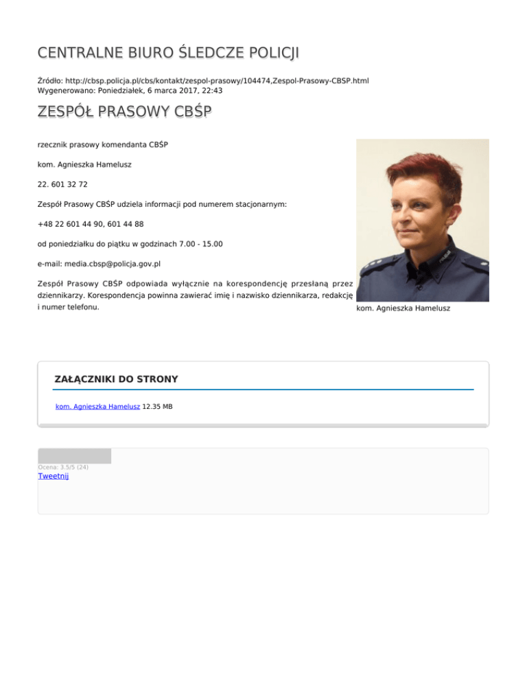 CENTRALNE BIURO ŚLEDCZE POLICJI Źródło: http://cbsp.policja.pl/cbs/kontakt/zespol-prasowy/104474,Zespol-Prasowy-CBSP.html Wygenerowano: Poniedziałek, 6 marca 2017, 22:43 ZESPÓŁ PRASOWY CBŚP rzecznik prasowy komendanta CBŚP kom. Agnieszka Hamelusz 22. 601 32 72 Zespół Prasowy CBŚP udziela informacji pod numerem stacjonarnym: +48 22 601 44 90, 601 44 88 od poniedziałku do piątku w godzinach 7.00 - 15.00 e-mail: [email protected] Zespół Prasowy CBŚP odpowiada wyłącznie na korespondencję przesłaną przez dziennikarzy. Korespondencja powinna zawierać imię i nazwisko dziennikarza, redakcję i numer telefonu. ZAŁĄCZNIKI DO STRONY kom. Agnieszka Hamelusz 12.35 MB Ocena: 3.5/5 (24) Tweetnij kom. Agnieszka Hamelusz