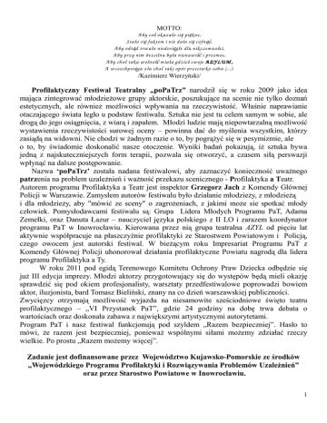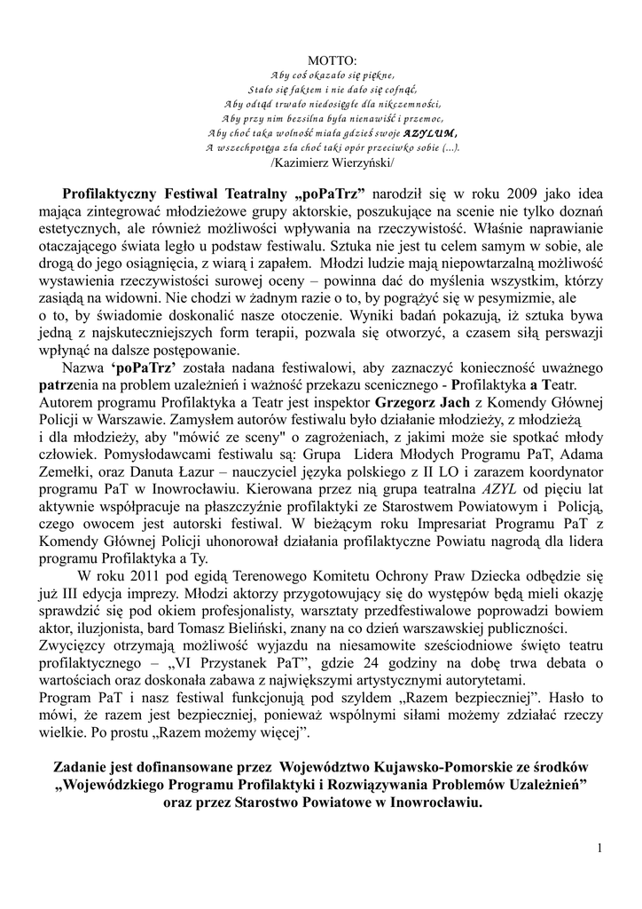 MOTTO: A by coś okazało się piękne, Stało się faktem i nie dało się cofnąć, A by odtąd trw ało niedosięgłe dla nikczem ności, A by przy nim bezsilna była nienaw iść i przem oc, A by choć taka w olność m iała gdzieś sw oje A Z YLU M , A w szechpotęga zła choć taki opór przeciw ko sobie (...). /Kazimierz Wierzyński/ Profilaktyczny Festiwal Teatralny „poPaTrz” narodził się w roku 2009 jako idea mająca zintegrować młodzieżowe grupy aktorskie, poszukujące na scenie nie tylko doznań estetycznych, ale również możliwości wpływania na rzeczywistość. Właśnie naprawianie otaczającego świata legło u podstaw festiwalu. Sztuka nie jest tu celem samym w sobie, ale drogą do jego osiągnięcia, z wiarą i zapałem. Młodzi ludzie mają niepowtarzalną możliwość wystawienia rzeczywistości surowej oceny – powinna dać do myślenia wszystkim, którzy zasiądą na widowni. Nie chodzi w żadnym razie o to, by pogrążyć się w pesymizmie, ale o to, by świadomie doskonalić nasze otoczenie. Wyniki badań pokazują, iż sztuka bywa jedną z najskuteczniejszych form terapii, pozwala się otworzyć, a czasem siłą perswazji wpłynąć na dalsze postępowanie. Nazwa ‘poPaTrz’ została nadana festiwalowi, aby zaznaczyć konieczność uważnego patrzenia na problem uzależnień i ważność przekazu scenicznego - Profilaktyka a Teatr. Autorem programu Profilaktyka a Teatr jest inspektor Grzegorz Jach z Komendy Głównej Policji w Warszawie. Zamysłem autorów festiwalu było działanie młodzieży, z młodzieżą i dla młodzieży, aby "mówić ze sceny" o zagrożeniach, z jakimi może sie spotkać młody człowiek. Pomysłodawcami festiwalu są: Grupa Lidera Młodych Programu PaT, Adama Zemełki, oraz Danuta Łazur – nauczyciel języka polskiego z II LO i zarazem koordynator programu PaT w Inowrocławiu. Kierowana przez nią grupa teatralna AZYL od pięciu lat aktywnie współpracuje na płaszczyźnie profilaktyki ze Starostwem Powiatowym i Policją, czego owocem jest autorski festiwal. W bieżącym roku Impresariat Programu PaT z Komendy Głównej Policji uhonorował działania profilaktyczne Powiatu nagrodą dla lidera programu Profilaktyka a Ty. W roku 2011 pod egidą Terenowego Komitetu Ochrony Praw Dziecka odbędzie się już III edycja imprezy. Młodzi aktorzy przygotowujący się do występów będą mieli okazję sprawdzić się pod okiem profesjonalisty, warsztaty przedfestiwalowe poprowadzi bowiem aktor, iluzjonista, bard Tomasz Bieliński, znany na co dzień warszawskiej publiczności. Zwycięzcy otrzymają możliwość wyjazdu na niesamowite sześciodniowe święto teatru profilaktycznego – „VI Przystanek PaT”, gdzie 24 godziny na dobę trwa debata o wartościach oraz doskonała zabawa z największymi artystycznymi autorytetami. Program PaT i nasz festiwal funkcjonują pod szyldem „Razem bezpieczniej”. Hasło to mówi, że razem jest bezpieczniej, ponieważ wspólnymi siłami możemy zdziałać rzeczy wielkie. Po prostu „Razem możemy więcej”. Zadanie jest dofinansowane przez Województwo Kujawsko-Pomorskie ze środków „Wojewódzkiego Programu Profilaktyki i Rozwiązywania Problemów Uzależnień” oraz przez Starostwo Powiatowe w Inowrocławiu. 1 Regulamin III Wojewódzkiego Profilaktycznego Festiwalu Teatralnego„poPaTrz” pod patronatem STAROSTY INOWROCŁAWSKIEGO Rozdział I INFORMACJE WSTĘPNE 1. Organizatorami II Profilaktycznego Festiwalu Teatralnego „poPaTrz” są: Terenowy Komitet Ochrony Praw Dziecka Starostwo Powiatowe w Inowrocławiu II Liceum Ogólnokształcące im. Marii Konopnickiej w Inowrocławiu Zadanie jest dofinansowane przez Województwo Kujawsko-Pomorskie ze środków „Wojewódzkiego Programu Profilaktyki i Rozwiązywania Problemów Uzależnień” Partnerzy: Komenda Powiatowa Policji w Inowrocławiu, Młodzieżowy Dom Kultury „Pszczółka” w Inowrocławiu, Ośrodek Profilaktyki i Rozwiązywania Problemów Uzależnień. Patronat honorowy pełni: Starosta Inowrocławski Tadeusz Majewski, Impresariat Programu Profilaktyka a Ty przy Komendzie Głównej Policji w Warszawie. Patronat medialny: TVP Bydgoszcz, Gazeta Pomorska, Radio „Gra”, weare.pl, www.inowroclaw.info.pl, 2. PFT „poPaTrz” ma charakter festiwalu. Jego celami są: o o o o kontynuowanie idei I Profilaktycznego Festiwalu Teatralnego z czerwca 2009 r., prezentacja dorobku artystycznego teatrów nieprofesjonalnych z terenu województwa oraz inspirowanie poszukiwań nowych form pracy artystycznej, aktywizacja twórczej pracy nad problemami profilaktycznymi, możliwość integracji w walce przeciwko negatywnym zjawiskom społecznym dotykającym młode pokolenie, poszerzenie wiedzy młodzieży z zakresu profilaktyki, próba wykształcenia mechanizmów obronnych wobec negatywnych zjawisk społecznych. Rozdział II KONKURS TEATRALNY 1. Konkurs teatralny polega na wyłonieniu spośród Grup Teatralnych z terenu całego województwa 6 grup festiwalowych. Na Gali Finałowej wystąpi zwycięska Grupa. 2. W festiwalu uczestniczyć mogą grupy nieprofesjonalnych z terenu województwa kujawsko-pomorskiego działające przy gimnazjach lub Domach Kultury (wiek 14-17 lat). 3. PFT „poPaTrz” odbędzie się w Inowrocławiu w dniu 10 czerwca 2011 r. ( ELIMINACJE od 9.00 do 14.00, GALA OD 15.00-17.00) 2 Zgłoszenia do Konkursu Teatralnego 1. Podstawą zgłoszenia się na PFT „poPaTrz” jest: nadesłanie karty zgłoszenia, zarejestrowanego spektaklu lub jego próby, scenariusza spektaklu, materiałów dokumentujących dotychczasowe osiągnięcia artystyczne do dnia 27 kwietnia 2011 r. 2. Każda placówka zgłasza na festiwal tylko jeden spektakl, którego maksymalny czas wynosi 30 minut. 3. Liczba osób zgłoszonych przez teatr nie może przekraczać 15 (z opiekunem i obsługą techniczną). 4. Zgłoszenia należy przesyłać na adres: II Wojewódzki Profilaktyczny Festiwal Teatralny „poPaTrz” II Liceum Ogólnokształcące im. Marii 