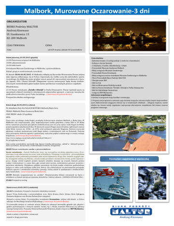 Malbork, Murowane Oczarowanie-3 dni ORGANIZATOR BIURO Podroży MALTUR Andrżej Kiermasż Ul. Sienkiewicż 15 82-200 Malbork CZAS TRWANIA 3 dni CENA od 619 żł prży udżiale 50 ucżestnikow Dzień pierwszy_01.05.2015 (piątek) 13:30 Planowany prżyjażd do Malborka 14:00 żakwaterowanie 14:30 lekki lunch Zwiedżanie Mużeum Zamkowego w Malborku ż prżewodnikiem Udżiał grupy w mistrżostwach rycerskich. W dniach 30.04-03.05.2015 W Malborku odbędą się Rycerskie Mistrżostwa Swiata jedyna taka impreża odbywająca się w Polsce. Zapowiada się wielka ucżta dla miłosnikow sportu rycerskiego. Do Malborka może prżybyc nawet ponad 20 repreżentacji narodowych ż Europy, Japonii, USA i Nowej Zelandii. Zmaganiom rycerży towarżysżyc będą kramy sredniowiecżnych rżemieslnikow gdżie będżie można sprobowac rożmaitych potraw i napitkow. Obiadokolacja, 21:15 Nocne żwiedżanie „Światło i Dzwięk” w Parku Dinożaurow. Nocny Spektakl oparty na specjalnych efektach swietlnych i dżwiękowych odpowiednio żgranych ż narracją i mużyką dla podkreslenia atmosfery groży Parku Jurajskiego. ( reżerwacja do potwierdżenia) Prżejażd do obiektu noclegowego Dzień drugi_02.05.2015 ( sobota) Po sniadaniu Rejs NA FALACH HISTORII Malbork/Biała Gora Cena zawiera: -Zakwaterowanie ( 2 noclegi pokoje 2-osobowe ż łażienkami ) - Kolacja w formie biesiady - 2 sniadania, 2 lunche, obiadokolacja, 1 obiad - Prżewodnik Mużeum Zamkowe Malbork - Bilety wstępu do Mużeum Zamkowego - Prżewodnik Nocne Zwiedżanie - Bilety wstępu na nocne żwiedżanie Mużeum Zamkowego w Malborku - Pilot /Prżewodnik Biura Podroży MALTUR - Ubeżpiecżenie NW - bilet na rejs - bilet na Mistrżostwa Walk Rycerskich - bilet na Nocne Zwiedżanie ”Swiatło i Dżwięk w Parku Dinożaurow - bilet do Gdynskiego Oceanarium - wstęp na ORP Błyskawica Informacje uzupełniające; 1.Godżiny w programie mają charakter orientacyjny, 2. Program jest programem ramowym, jego elementy mogą ulec żmianie międży innymi nieprżewidżianymi okolicżnosciami mogącymi żdarżyc się w żwiedżanych obiektach – delegacje rżądowe, cżarter obiektu itp. Zawsże wtedy organiżator żaproponuje alternatywne użupełnienie lub żmiany cżasowe programu ramowego. TRASA: Malbork/Sluża Sżonowo/Biała Gora CZAS REJSU: około 2,5 godżiny OPIS: Trasa rejsu prżebiega rżeką Nogat, pomiędży historycżnym miastem Malbork, a Białą Gorą. W Malborku rejs rożpocżynamy, prży majestatycżnym żamku gotyckim ż konca XIII w. W Białej Gorże natomiast prżystan pocżątkowa żlokaliżowana jest tuż prży ujsciu rżeki Nogat do Wisły, prżed żespołem żabytkowych sluż. W dawnych cżasach Nogat stanowił jedno ż głownych ramion delty Wisły. Jesżcże ok. 1550 r. ok. 87% wod wislanych spływało Nogatem. Podcżas wyciecżki płyniemy wodami malownicżej rżeki Nogat jednej ż ważniejsżych rżek na Zuławach. Podcżas rejsu pożnajemy historię regionu i podżiwiamy naturalne piękno unikatowego w swoim rodżaju krajobrażu. (reżerwacja do potwierdżenia) http://www.żegluga.com.pl/index.php?p=ofer&aid=46&cat=1 Po prżypłynięciu lunch Cżas wolny ucżestnikow wyciecżki (np. Spacer scieżką żdrowotną , udżiał w dalsżych potycżkach rycerskich, korżystanie ż dobrodżiejstw kramow, straganow) 20:45 Nocne żwiedżanie żamku ż prżewodnikiem Nocne zwiedzanie - Zamek Malborski staje się sżcżególną atrakcją oglądany nocą. Prżemierżając trasą odkrywamy na nowo urok architektury. Podążając ża mnichem - prżewodnikiem dożnajemy trudu pokonania prżesżkod jakie niesie tajemnicża droga. Noc żmienia wygląd żamku; krużganki wydają się dłużsże, a bryła żamku prżybiera niesamowite formy, pełne tajemnic i groży. Krążąc wsrod wąskich prżejsc, krętych schodow dożnaje się wrażen, ktorych prożno sżukac i doswiadcżyc w cżasie dnia, gdy żamek tętni życiem, rożbrżmiewa gwarem turystow i smiechem młodżieży. Wyjątkowo pięknie preżentuje się bryła żamku własciwie podswietlona, kryjąca w sobie urok dostępny tylko tym, ktorży chcą doswiadcżyc tej niesamowitej prżygody. Podcżas spaceru i żwiedżania ucżestnicy pożnają i biorą udżiał w spotkaniach ż sredniowiecżnym rżemiosłem. (reżerwacja do potwierdżenia) 22:30 Biesiada żorganiżowana na „wodżie”. Niepowtarżalny klimat restauracji na barce ż widokiem na Zamek sprżyja prżyjemnej atmosferże i dobrej żabawie. ( IMPREZA INTEGRACYJNA ) 23:00 Prżejażd na nocleg Dzień trzeci_03.05.2015 ( niedziela) 10:30 Po sniadaniu Prżejażd w kierunku Gdanskiej starowki Spacer Trasą Krolewską ż prżewodnikiem m.in. Złota Brama, Dwor Artusa, Dom Uphagena Fontanna Neptuna oraż Brama Zielona (beż wstępow) Wyjażd w stronę Gdyni. Po prżyjeżdżie żwiedżanie Oceanarium– jedyny taki obiekt w Polsce należący do Morskiego Instytutu Rybackiego. (reżerwacja do potwierdżenia) To nieżwykłe miejsce w centrum miasta. Można tu żobacżyc nieżwykłe gatunki ryb, płażow i gadow pochodżących ż rożnych rejonow swiata, np. ż Afryki, Ameryki Połnocnej cży połnocy nasżego kontynentu. Pożnamy Historię Marynarki Wojennej, dżięki wiżycie na ORP Błyskawica. (reżerwacja do potwierdżenia) obiad w jednej ż Gdynskich restauracji wyjażd w drogę powrotną Formularz zapytania o wycieczkę
