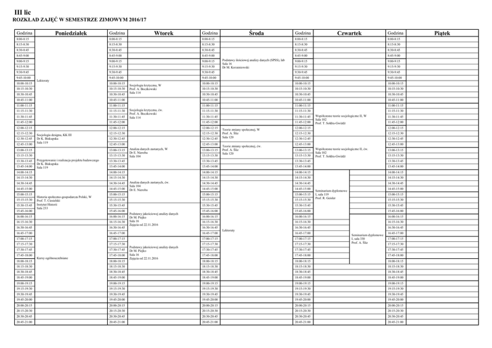 III lic ROZKŁAD ZAJĘĆ W SEMESTRZE ZIMOWYM 2016/17 Poniedziałek Godzina Godzina Wtorek Środa Godzina Godzina Czwartek Godzina 8:00-8:15 8:00-8:15 8:00-8:15 8:00-8:15 8:00-8:15 8:15-8:30 8:15-8:30 8:15-8:30 8:15-8:30 8:15-8:30 8:30-8:45 8:30-8:45 8:30-8:45 8:30-8:45 8:30-8:45 8:45-9:00 8:45-9:00 8:45-9:00 8:45-9:00 8:45-9:00 9:00-9:15 9:00-9:15 9:00-9:15 9:00-9:15 9:00-9:15 9:15-9:30 9:15-9:30 9:15-9:30 9:15-9:30 9:15-9:30 9:30-9:45 9:30-9:45 9:30-9:45 9:30-9:45 9:30-9:45 9:45-10:00 9:45-10:00 9:45-10:00 9:45-10:00 10:00-10:15 10:00-10:15 10:00-10:15 10:15-10:30 10:15-10:30 10:15-10:30 10:30-10:45 10:30-10:45 10:30-10:45 9:45-10:00 10:00-10:15 Lektoraty 10:00-10:15 Socjologia krytyczna, W Prof. A. Boczkowski Sala 114 Podstawy ilościowej analizy danych (SPSS), lab Sala 16 Dr M. Korzeniowski 10:15-10:30 10:15-10:30 10:30-10:45 10:30-10:45 10:45-11:00 10:45-11:00 10:45-11:00 10:45-11:00 10:45-11:00 11:00-11:15 11:00-11:15 11:00-11:15 11:00-11:15 11:00-11:15 11:15-11:30 11:15-11:30 11:15-11:30 11:15-11:30 11:30-11:45 11:30-11:45 11:30-11:45 11:30-11:45 11:45-12:00 11:45-12:00 11:45-12:00 11:45-12:00 12:00-12:15 12:00-12:15 12:00-12:15 12:00-12:15 12:15-12:30 12:15-12:30 12:15-12:30 12:15-12:30 12:30-12:45 12:30-12:45 Teorie zmiany społecznej, W Prof. A. Śliz Sala 120 12:00-12:15 12:30-12:45 12:30-12:45 12:45-13:00 12:45-13:00 Teorie zmiany społecznej, ćw. Prof. A. Śliz Sala 120 12:45-13:00 12:15-12:30 12:30-12:45 12:45-13:00 Socjologia designu, KK III Dr K. Biskupska Sala 119 13:00-13:15 13:00-13:15 13:15-13:30 13:15-13:30 13:30-13:45 Przygotowanie i realizacja projektu badawczego Dr K. Biskupska Sala 119 Socjologia krytyczna, ćw. Prof. A. Boczkowski Sala 114 Analiza danych zastanych, W Dr E. Nieroba Sala 104 13:00-13:15 13:15-13:30 13:00-13:15 13:15-13:30 11:15-11:30 Współczesne teorie socjologiczne II, W Sala 102 Prof. T. Sołdra-Gwiżdż 11:30-11:45 11:45-12:00 12:45-13:00 Współczesne teorie socjologiczne II, ćw. Sala 102 Prof. T. Sołdra-Gwiżdż 13:00-13:15 13:15-13:30 13:30-13:45 13:30-13:45 13:30-13:45 13:30-13:45 13:45-14:00 13:45-14:00 13:45-14:00 13:45-14:00 14:00-14:15 14:00-14:15 14:00-14:15 14:00-14:15 14:00-14:15 14:15-14:30 14:15-14:30 14:15-14:30 14:15-14:30 14:15-14:30 14:30-14:45 14:30-14:45 14:30-14:45 14:30-14:45 14:30-14:45 14:45-15:00 14:45-15:00 14:45-15:00 14:45-15:00 15:00-15:15 15:00-15:15 15:00-15:15 15:15-15:30 15:15-15:30 15:15-15:30 15:30-15:45 15:30-15:45 15:30-15:45 15:30-15:45 15:45-16:00 15:45-16:00 15:45-16:00 16:00-16:15 16:00-16:15 16:00-16:15 16:15-16:30 16:15-16:30 16:15-16:30 16:30-16:45 16:30-16:45 16:30-16:45 13:45-14:00 15:00-15:15 15:15-15:30 15:30-15:45 15:45-16:00 Historia społeczno-gospodarcza Polski, W Prof. T. Ciesielski Instytut Historii Sala 233 15:45-16:00 Analiza danych zastanych, ćw. Sala 104 Dr E. Nieroba Podstawy jakościowej analizy danych Dr M. Piejko Sala 16 Zajęcia od 22.11.2016 14:45-15:00 Seminarium dyplomowe I, sala 119 Prof. R. Geisler 15:00-15:15 15:15-15:30 16:00-16:15 16:00-16:15 16:15-16:30 16:15-16:30 16:30-16:45 16:30-16:45 16:45-17:00 16:45-17:00 16:45-17:00 17:00-17:15 17:00-17:15 17:00-17:15 17:00-17:15 17:15-17:30 17:15-17:30 17:15-17:30 17:15-17:30 17:30-17:45 17:30-17:45 17:30-17:45 17:30-17:45 17:30-17:45 17:45-18:00 17:45-18:00 17:45-18:00 18:00-18:15 18:00-18:15 18:00-18:15 17:45-18:00 Kursy ogólnouczelniane 17:45-18:00 Podstawy jakościowej analizy danych Dr M. Piejko Sala 16 Zajęcia od 22.11.2016 Lektoraty 16:45-17:00 Seminarium dyplomowe I, sala 330 Prof. A. Śliz 16:45-17:00 17:00-17:15 17:15-17:30 18:00-18:15 18:00-18:15 18:15-18:30 18:15-18:30 18:15-18:30 18:15-18:30 18:15-18:30 18:30-18:45 18:30-18:45 18:30-18:45 18:30-18:45 18:30-18:45 18:45-19:00 18:45-19:00 18:45-19:00 18:45-19:00 18:45-19:00 19:00-19:15 19:00-19:15 19:00-19:15 19:00-19:15 19:00-19:15 19:15-19:30 19:15-19:30 19:15-19:30 19:15-19:30 19:15-19:30 19:30-19:45 19:30-19:45 19:30-19:45 19:30-19:45 19:30-19:45 19:45-20:00 19:45-20:00 19:45-20:00 19:45-20:00 19:45-20:00 20:00-20:15 20:00-20:15 20:00-20:15 20:00-20:15 20:00-20:15 20:15-20:30 20:15-20:30 20:15-20:30 20:15-20:30 20:15-20:30 20:30-20:45 20:30-20:45 20:30-20:45 20:30-20:45 20:30-20:45 20:45-21:00 20:45-21:00 20:45-21:00 20:45-21:00 20:45-21:00 Piątek
