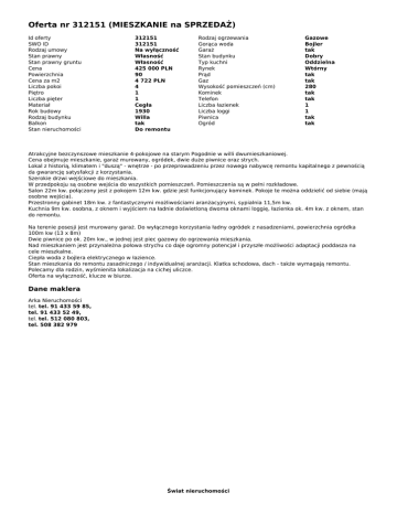 Oferta nr 312151 (MIESZKANIE na SPRZEDAŻ) Id oferty SWO ID Rodzaj umowy Stan prawny Stan prawny gruntu Cena Powierzchnia Cena za m2 Liczba pokoi Piętro Liczba pięter Materiał Rok budowy Rodzaj budynku Balkon Stan nieruchomości 312151 312151 Na wyłączność Własność Własność 425 000 PLN 90 4 722 PLN 4 1 1 Cegła 1930 Willa tak Do remontu Rodzaj ogrzewania Gorąca woda Garaż Stan budynku Typ kuchni Rynek Prąd Gaz Wysokość pomieszczeń (cm) Kominek Telefon Liczba łazienek Liczba loggi Piwnica Ogród Gazowe Bojler tak Dobry Oddzielna Wtórny tak tak 280 tak tak 1 1 tak tak Atrakcyjne bezczynszowe mieszkanie 4-pokojowe na starym Pogodnie w willi dwumieszkaniowej. Cena obejmuje mieszkanie, garaż murowany, ogródek, dwie duże piwnice oraz strych. Lokal z historią, klimatem i "duszą" - wnętrze - po przeprowadzeniu przez nowego nabywcę remontu kapitalnego z pewnością da gwarancję satysfakcji z korzystania. Szerokie drzwi wejściowe do mieszkania. W przedpokoju są osobne wejścia do wszystkich pomieszczeń. Pomieszczenia są w pełni rozkładowe. Salon 22m kw. połączony jest z pokojem 12m kw. gdzie jest funkcjonujący kominek. Pokoje te można oddzielić od siebie (mają osobne wejścia). Przestronny gabinet 18m kw. z fantastycznymi możliwościami aranżacyjnymi, sypialnia 11,5m kw. Kuchnia 9m kw. osobna, z oknem i wyjściem na ładnie doświetloną dwoma oknami loggię, łazienka ok. 4m kw. z oknem, stan do remontu. Na terenie posesji jest murowany garaż. Do wyłącznego korzystania ładny ogródek z nasadzeniami, powierzchnia ogródka 100m kw (13 x 8m) Dwie piwnice po ok. 20m kw., w jednej jest piec gazowy do ogrzewania mieszkania. Nad mieszkaniem jest przynależna połowa strychu co daje ogromny potencjał i przyszłe możliwości adaptacji poddasza na cele mieszkalne. Ciepła woda z bojlera elektrycznego w łazience. Stan mieszkania do remontu zasadniczego / indywidualnej aranżacji. Klatka schodowa, dach - także wymagają remontu. Polecamy dla rodzin, wyśmienita lokalizacja na cichej uliczce. Oferta na wyłączność, klucze w biurze. Dane maklera Arka Nieruchomości tel. tel. 91 433 59 85, tel. 91 433 52 49, tel. tel. 512 080 803, tel. 508 382 979 Świat nieruchomości Powered by TCPDF (www.tcpdf.org)