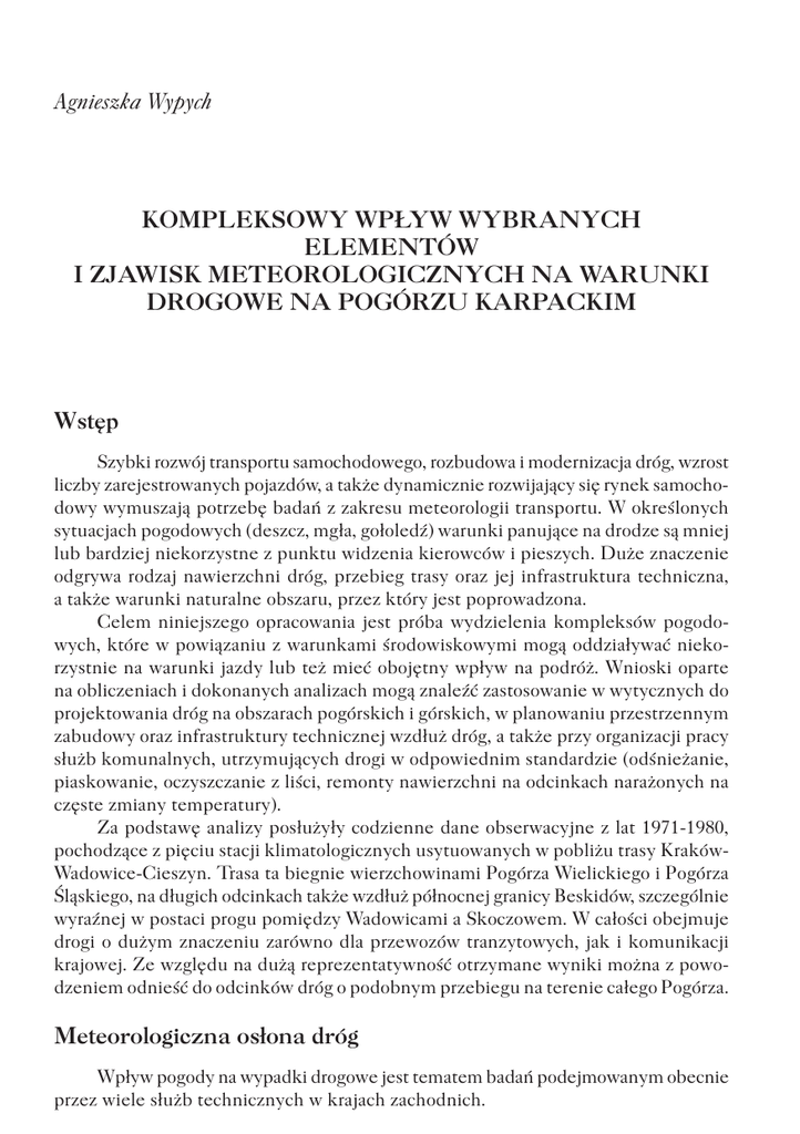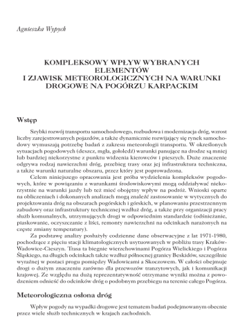 Agnieszka Wypych Kompleksowy wpŁyw wybranych elementów i zjawisk meteorologicznych na warunki drogowe na Pogórzu Karpackim Wstęp Szybki rozwój transportu samochodowego, rozbudowa i modernizacja dróg, wzrost liczby zarejestrowanych pojazdów, a także dynamicznie rozwijający się rynek samochodowy wymuszają potrzebę badań z zakresu meteorologii transportu. W określonych sytuacjach pogodowych (deszcz, mgła, gołoledź) warunki panujące na drodze są mniej lub bardziej niekorzystne z punktu widzenia kierowców i pieszych. Duże znaczenie odgrywa rodzaj nawierzchni dróg, przebieg trasy oraz jej infrastruktura techniczna, a także warunki naturalne obszaru, przez który jest poprowadzona. Celem niniejszego opracowania jest próba wydzielenia kompleksów pogodowych, które w powiązaniu z warunkami środowiskowymi mogą oddziaływać niekorzystnie na warunki jazdy lub też mieć obojętny wpływ na podróż. Wnioski oparte na obliczeniach i dokonanych analizach mogą znaleźć zastosowanie w wytycznych do projektowania dróg na obszarach pogórskich i górskich, w planowaniu przestrzennym zabudowy oraz infrastruktury technicznej wzdłuż dróg, a także przy organizacji pracy służb komunalnych, utrzymujących drogi w odpowiednim standardzie (odśnieżanie, piaskowanie, oczyszczanie z liści, remonty nawierzchni na odcinkach narażonych na częste zmiany temperatury). Za podstawę analizy posłużyły codzienne dane obserwacyjne z lat 1971−1980, pochodzące z pięciu stacji klimatologicznych usytuowanych w pobliżu trasy Kraków− Wadowice−Cieszyn. Trasa ta biegnie wierzchowinami Pogórza Wielickiego i Pogórza Śląskiego, na długich odcinkach także wzdłuż północnej granicy Beskidów, szczególnie wyraźnej w postaci progu pomiędzy Wadowicami a Skoczowem. W całości obejmuje drogi o dużym znaczeniu zarówno dla przewozów tranzytowych, jak i komunikacji krajowej. Ze względu na dużą reprezentatywność otrzymane wyniki można z powodzeniem odnieść do odcinków dróg o podobnym przebiegu na terenie całego Pogórza. Meteorologiczna osłona dróg Wpływ pogody na wypadki drogowe jest tematem badań podejmowanym obecnie przez wiele służb technicznych w krajach zachodnich. 278 Agnieszka Wypych Duże osiągnięcia w tej dziedzinie posiada Wielka Brytania, gdzie od lat pięćdziesiątych minionego stulecia prowadzone są badania prawdopodobieństwa pojawiania się przymrozków i ich prognozowanie (Parrey i in. 1971), a także badania wpływu warunków atmosferycznych na bezpieczeństwo i natężenie ruchu drogowego. Brytyjska Służba Meteorologiczna opracowała system osłony dróg pod nazwą „Open Runaway”. System ten na podstawie dokonywanych pomiarów podaje informacje dotyczące temperatury nawierzchni drogi, także prognozy dla służb lotniskowych oraz prognozy opadów. Naukowcy w Stanach Zjednoczonych prowadzą obecnie badania zmierzające do wyznaczenia regionów klimatycznych na podstawie wymagań dotyczących stosowanych lepiszczy asfaltowych, które wpływają bezpośrednio na stan dróg. Realizowany program o nazwie SHRP (Strategic Highway Research Program) jest podstawą badań i planowania techniki drogowej w krajach zachodnich (Antosz, Kroszczyński 1999). Badaniem termiki dróg w zależności od różnych warunków atmosferycznych i fizjograficznych oraz jej wpływu na pojawianie się gołoledzi zajmuje się także zespół z University of Gothenburg (Bogren, Gustavsson 1991). W ramach programu VVIS (Swedish Road Weather Information System), wykonano szereg map termicznych z zaznaczeniem odcinków zagrożonych gołoledzią. W Polsce badania i publikacje z zakresu meteorologii transportu są znacznie mniej rozpowszechnione. Pojawiające się coraz częściej przy głównych arteriach komunikacyjnych tablice świetlne informujące o aktualnych parametrach niektórych elementów meteorologicznych (temperatura powietrza, temperatura nawierzchni drogi, prędkość wiatru, wilgotność powietrza) to jedynie znikomy procent działań, które powinny zostać podjęte w celu odpowiedniego zabezpieczenia dróg, a także zapewnienia bezpieczeństwa kierowcom. Warunki klimatyczne Pogórza Karpackiego w aspekcie bezpieczeństwa ruchu drogowego Obszar Pogórza Karpackiego leży w piętrze klimatycznym umiarkowanie ciepłym o typie pluwioniwalnym (Hess 1965). Większość elementów wykazuje niewielkie zróżnicowanie przestrzenne, choć od progu Pogórza w jego części zachodniej ku wschodowi maleje udział mas powietrza oceanicznego przy zwiększającym się udziale mas powietrza kontynentalnego, z czym wiążą się niewielkie różnice przede wszystkim w notowanych sumach opadów atmosferycznych, także w długości trwania okresów charakterystycznych, np. sezonu bezprzymrozkowego. Analiza przestrzennego rozkładu elementów meteorologicznych, dokonana na podstawie posiadanych danych źródłowych, pozwala na wyróżnienie obszarów, różniących się dominującymi warunkami pogodowymi oraz możliwością wystąpienia określonych zdarzeń i zjawisk korzystnych lub niekorzystnych dla transportu. Wyżynno−pagórkowata rzeźba Pogórza o stosunkowo dużej liczbie wznoszących się do wysokości 350−500 m n.p.m. garbów modyfikuje ogólne warunki pogodowe. Obszary o niewielkich wysokościach względnych (40−80 m), z jakimi spotkać się można na Kompleksowy wpływ wybranych elementów i zjawisk meteorologicznych ... 279 odcinku Kraków−Wadowice, charakteryzują się niewielkim zróżnicowaniem mezoklimatycznym; notowane wartości temperatury, prędkości wiatru, sumy opadów są tam zbliżone. Tereny o większym urozmaiceniu rzeźby (np. odcinek Wadowice−Bielsko Biała), porozcinane dużą liczbą dolin cechują się specyficznymi warunkami termiczno− wilgotnościowymi. Notuje się tu większą liczbę dni z przymrozkiem, częstsze mgły, gołoledź. Najbardziej „surowe” warunki pogodowe występują na obszarach położonych najwyżej na