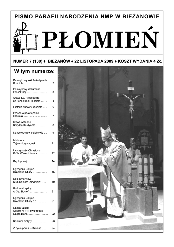 PISMO PARAFII NARODZENIA NMP W BIEŻANOWIE PŁOMIEŃ NUMER 7 (130) ♦ BIEŻANÓW ♦ 22 LISTOPADA 2009 ♦ KOSZT WYDANIA 4 ZŁ W tym numerze: Pamiątkowy Akt Poświęcenia Kościoła ………………...…... 2 Pamiątkowy dokument konsekracji ………………….. 3 Słowo Ks. Proboszcza po konsekracji kościoła ……. 4 Historia budowy kościoła ….. 6 Prośba o poświęcenie kościoła ……........................ 7 Słowo wstępne Księdza Kardynała …………. 8 Konsekracja w obiektywie .... 9 Miniatura: Tajemniczy sygnał ................ 11 Uroczystość Chrystusa Króla Wszechświata ……….. 12 Kącik poezji …………………. 14 Egzegeza Biblijna Izraelskie Ofiary ………..…... 15 Koło Emerytów Klub Seniora „Nadzieja” …... 19 Budowa kaplicy w Os. Złocień ……….….…… 21 Egzegeza Biblijna Izraelskie Ofiary c.d. ............. 21 Nasza Szkoła Szkoła nr 111 dwukrotnie Nagrodzona ………………..... 22 Konkurs biblijny ………....….. 23 Z życia parafii – Kronika ....... 24 STR. 2 PŁOMIEŃ NUMER 7 (130) Z ŻYCIA PARAFII POŚWIĘCENIE KOŚCIOŁA Pamiątkowy Akt Poświęcenia Kościoła NUMER 7 (130) PŁOMIEŃ STR. 3 Kraków - Bieżanów 17.10.2009 Uroczyste Poświęcenie Kościoła W roku Pańskim 2009, gdy w Rzymie papieżem był Benedykt XVI, Metropolitą i Ordynariuszem Archidiecezji Krakowskiej Jego Eminencja Ks. Kardynał Stanisław Dziwisz, biskupami pomocniczymi: Ks. Bp Jan Szkodoń, Ks. Bp Jan Zając, Ks. Bp Józef Guzdek, Dziekanem Dekanatu Kraków – Prokocim - Ks. Kan. Florian Kosek, Proboszczem Parafii Narodzenia NMP w Krakowie – Bieżanowie Ks. Kan. Bogdan Markiewicz, współpracownikami: Ks. Krzysztof Piechowicz, Ks. dr Grzegorz Łopatka i Ks. Jan Noga; w sobotę 17 października Jego Eminencja Ks. Kard. Stanisław Dziwisz dokonał aktu poświęcenia kościoła z całym jego wyposażeniem. Projekt kościoła jest autorstwa architekta Przemysława Gawora a projekt aranżacji wnętrza kościoła i prezbiterium wykonali architekci Joanna i Bogusław Kulka. Wykonawcy: elementy marmurowe wykonała Firma Kamieniarska „Godula” – Roberta Goduli z Kalwarii Zebrzydowskiej, stolarkę wykonali: Karol Gawor, Jan Pęcek i Krzysztof Stryszowski, rzeźby w głównym ołtarzu wykonał Edward Osiecki, rzeźby świętych i błogosławionych – Jan Funek, tabernakulum – Krzysztof Wiatrak, polichromię – Anna i Edward Osieccy, elementy mosiężne – Adolf Zych, Edward Prokopowicz, Michał Boruta, Paweł Trojak, większość prac nadzorował – Ryszard Włosik. Całość inwestycji została wykonana dzięki pracy i ofiarności parafian. Niech dobry Bóg wynagrodzi wszystkim hojność serca a Matka Najświętsza chroni przed wszelkim niebezpieczeństwem duszy i ciała. Świątynię tę zbudowano i urządzono ku czci i chwale Boga w Trójcy Jedynego i Matki Bożej Bieżanowskiej, patronki naszej parafii oraz ku pożytkowi dusz wiernych. Akt ten podpisali: Pamiątkowy dokument konsekracji STR. 4 PŁOMIEŃ NUMER 7 (130) Z ŻYCIA PARAFII POKONSEKRACYJNE SŁOWO KSIĘDZA PROBOSZCZA ... Niedziela 25 października była obchodzona jako Uroczystość Poświęcenia Kościoła. Była to okazja, by wspomnieć dzień konsekracji naszej nowej świątyni. Na murach świątyni zapalone zostały tzw. „zacheuszki” czyli lampki oliwne podświetlające miejsca namaszczenia. Nazwa „zacheuszki” nawiązuje do Ewangelii o Zacheuszu, który pragnął zobaczyć Jezusa, a w konsekwencji mógł Go przyjąć w gościnę w swoim domu. Chrystus wypowiedział słowa: „Dziś zbawienie stało się udziałem tego domu”. Zacheuszki są symbolem wydarzenia konsekracji dzięki której zbawienie staje się udziałem poświęconej świątyni. nym pokoleniom, które w tym domu będą spotykać się z Bogiem. Konsekracja miała także swój wątek papieski, bo przecież Jan Paweł II poświęcił kamień węgielny a sama konsekracja odbyła się w apewne wydarzenie konsekracji 30 rocznicę pierwszej pielgrzymki wielu przeżyło pierwszy raz w żydo Ojczyzny i w dzień po 31. roczciu, co pozostawia trwały ślad w naszej świadomości. Poprzez piękno nicy wyboru na Stolicę Piotrową. liturgii poświęcenia staliśmy się Ksiądz Kardynał Dziwisz w przeświadkami wyjątkowego wydarze- mówieniu wyraził życzenie, aby ta nia. Najpierw Ksiądz Kardynał na- świątynia pełna Boga była zawsze wiedził stary kościół, modląc się pełna ludzi. przed obrazem Matki Bożej Bieżanowskiej. Następnie w nowym koyrażamy wdzięczność modliściele zapoznał się z historią jego tewną Janowi Pawłowi II, Księdzu budowy. Potem w nieoświetlonej Kardynałowi i wszystkim kapłaświątyni rozbrzmiewały przepiękne nom (w roku kapłańskim) za modlitwy, a następnie nasz Pasterz wszelkie starania, trud, ofiarowane pokropił mury świątyni wodą święcierpienie. Wyrażamy wdzięczconą i namaścił je świętym olejem. ność wszystkim, którzy bezpośredZapalenie kadzidła na konsekrowa- nio przyczynili się do przygotowanym ołtarzu oraz okadzenie murów nia uroczystości: Radzie Duszpaświątyni i wiernych, a następnie sterskiej za przygotowanie zaprouroczyste napełnienie światłem do- szeń i innym grupom w parafii. mu Bożego było niezapomnianym Szczególnie dziękujemy oazie, przeżyciem. Konsekracja miała młodzieży, ministrantom i dzieswój wymiar pokoleniowy bo prze- ciom za doręczenie prawie 3000 kazaliśmy nową świątynię następ- zaproszeń. Dziękujemy wszystkim Z W ludziom dobrej woli za pracę i trud w przygotowaniu świątyni na uroczystość. Towarzyszyły nam duma i radość: - gdy wsłuchiwaliśmy się w śpiew naszego chóru, który przygotował Pan Organista; - gdy byliśmy świadkami przygotowywania ołtarza, ubierania kwiatami, zapalania świec; - gdy przedstawiciele parafii nieśli dary ofiarne - dar pieniężny na Centrum Jana Pawła II, ornat dla Os. Złocień, obrusy ofiarowane przez Zespół Apostolstwa Świeckich i 