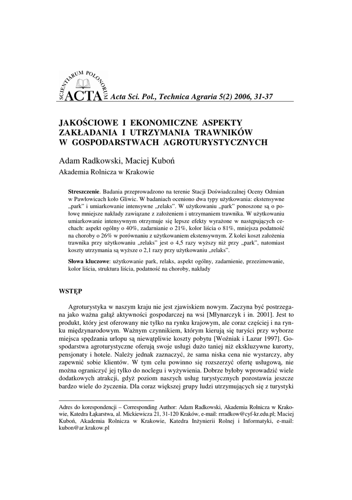 Acta Sci. Pol., Technica Agraria 5(2) 2006, 31-37 JAKOĝCIOWE I EKONOMICZNE ASPEKTY ZAKŁADANIA I UTRZYMANIA TRAWNIKÓW W GOSPODARSTWACH AGROTURYSTYCZNYCH Adam Radkowski, Maciej KuboĔ Akademia Rolnicza w Krakowie Streszczenie. Badania przeprowadzono na terenie Stacji DoĞwiadczalnej Oceny Odmian w Pawłowicach koło Gliwic. W badaniach oceniono dwa typy uĪytkowania: ekstensywne „park” i umiarkowanie intensywne „relaks”. W uĪytkowaniu „park” ponoszone są o połowĊ mniejsze nakłady zawiązane z załoĪeniem i utrzymaniem trawnika. W uĪytkowaniu umiarkowanie intensywnym otrzymuje siĊ lepsze efekty wyraĪone w nastĊpujących cechach: aspekt ogólny o 40%, zadarnianie o 21%, kolor liĞcia o 81%, mniejsza podatnoĞü na choroby o 26% w porównaniu z uĪytkowaniem ekstensywnym. Z kolei koszt załoĪenia trawnika przy uĪytkowaniu „relaks” jest o 4,5 razy wyĪszy niĪ przy „park”, natomiast koszty utrzymania są wyĪsze o 2,1 razy przy uĪytkowaniu „relaks”. Słowa kluczowe: uĪytkowanie park, relaks, aspekt ogólny, zadarnienie, przezimowanie, kolor liĞcia, struktura liĞcia, podatnoĞü na choroby, nakłady WSTĉP Agroturystyka w naszym kraju nie jest zjawiskiem nowym. Zaczyna byü postrzegana jako waĪna gałąĨ aktywnoĞci gospodarczej na wsi [Młynarczyk i in. 2001]. Jest to produkt, który jest oferowany nie tylko na rynku krajowym, ale coraz czĊĞciej i na rynku miĊdzynarodowym. WaĪnym czynnikiem, którym kierują siĊ turyĞci przy wyborze miejsca spĊdzania urlopu są niewątpliwie koszty pobytu [WoĨniak i Lazur 1997]. Gospodarstwa agroturystyczne oferują swoje usługi duĪo taniej niĪ ekskluzywne kurorty, pensjonaty i hotele. NaleĪy jednak zaznaczyü, Īe sama niska cena nie wystarczy, aby zapewniü sobie klientów. W tym celu powinno siĊ rozszerzyü ofertĊ usługową, nie moĪna ograniczyü jej tylko do noclegu i wyĪywienia. Dobrze byłoby wprowadziü wiele dodatkowych atrakcji, gdyĪ poziom naszych usług turystycznych pozostawia jeszcze bardzo wiele do Īyczenia. Dla coraz wiĊkszej grupy ludzi utrzymujących siĊ z turystyki Adres do korespondencji – Corresponding Author: Adam Radkowski, Akademia Rolnicza w Krakowie, Katedra Łąkarstwa, al. Mickiewicza 21, 31-120 Kraków, e-mail: [email protected]; Maciej KuboĔ, Akademia Rolnicza w Krakowie, Katedra InĪynierii Rolnej i Informatyki, e-mail: [email protected] 32 A. Radkowski, M. KuboĔ w gospodarce wolnorynkowej kaĪdy turysta powinien byü, potocznie mówiąc, na wagĊ złota. Gospodarstwo powinno wyposaĪyü siĊ w róĪnego rodzaju place zabaw dla dzieci oraz miejsca spĊdzania wolnego czasu dla dorosłych. Takie przedsiĊwziĊcie jest związane z załoĪeniem m.in. trawnika, który bĊdzie stanowił podłoĪe. Trawnik ten powinien w pewien sposób „przyciągaü” wczasowiczów, na którym mogliby siĊ opalaü, graü w piłkĊ, spĊdziü wolny czas przy kawie czy grillu. Warunkiem utrzymania dobrego trawnika jest odpowiednie jego uĪytkowanie. Stąd teĪ autorzy niniejszej pracy chcą przedstawiü aspekty jakoĞciowe i ekonomiczne uĪytkowania trawnika przydomowego, który przyczynia siĊ pozytywnie na przyjazdy turystyczne w ujĊciu poniesionych kosztów i uzyskanych efektów. MATERIAŁ I METODY Badania przeprowadzono w latach 2003–2005 na pseudobielicy wytworzonej z gliny lekkiej pylastej zalegającej płytko na glinie Ğredniej, zaliczanej do kompleksu pszennego dobrego. DoĞwiadczenie załoĪono metodą losowanych bloków w trzech powtórzeniach na terenie obiektu Stacji DoĞwiadczalnej Oceny Odmian w Pawłowicach, na wysokoĞci około 250 m n.p.m. Na poletkach o powierzchni 1 m2 wysiano ĪycicĊ trwałą w iloĞci od 20,6 do 26,2 g·m-2. W badaniach uwzglĊdniono dwa typy uĪytkowania – „park” i „relaks”. Trawniki nawoĪono w roku siewu w uĪytkowaniu „park” 65 kg N·ha-1, 60 kg P2O5·ha-1, 120 kg K2O·ha-1, natomiast w uĪytkowaniu „relaks” odpowiednio 65, 75 i 150 kg·ha-1. Z kolei w latach pełnego uĪytkowania w „park” 60 kg N·ha-1, 20 kg P2O5·ha-1, 40 kg K2O·ha-1, a w „relaks” odpowiednio 190–200, 80 i 150 kg·ha-1. Nawozy azotowe zastosowano w formie saletry amonowej 34% N, fosforowe – superfosfat potrójny granulowany 46% P2O5, a potasowe w postaci soli potasowej 60% K2O. W okresie wegetacji w latach pełnego uĪytkowania przeprowadzano na trawnikach w uĪytkowaniu „park” 4–6 koszeĔ na wysokoĞü 6 cm, a w uĪytkowaniu „relaks” 10–11 koszeĔ na wysokoĞü 4 cm. Koszenie przeprowadzono w momencie, gdy roĞliny osiągały wysokoĞü 12 cm – dla „parku” i 8 cm dla „relaksu”. Liczba i wysokoĞü koszeĔ były zgodne z zaleceniami COBORU dla mieszanek typu „relax” i „park” [DomaĔski 1992, 1993]. Warunki pogodowe na ogół były sprzyjające dla wzrostu i rozwoju traw gazonowych. W okresie wegetacji (kwiecieĔ – wrzesieĔ) sumy opadów atmosferycznych wynosiły w latach 2003, 2004 i 2005 odpowiednio: 299,9; 316,8; 306,8 mm, a Ğrednie temperatury powietrza w tym okresie kształtowały siĊ odpowiednio: 16,9; 17,1 i 15,1°C. W czasie dłuĪej trwających okresów posuchy (gleba na głĊbokoĞci 3 cm przeschniĊta, roĞliny po naciĞniĊciu rĊką nie podnoszą siĊ) systematycznie w odstĊpach 3-dniowych stosowano nawadnianie (deszczowanie) w iloĞci około 10 mm wody jednorazowo dla typu uĪytkowania „relaks” i 7 mm – dla „park”. Oceny jakoĞciowej badanych cech trawników dokonano w skali 9-stopniowej (1–9), opartej na systemie bonitacyjnym traw gazonowych opracowanym przez ProĔczuka [1993]. Do cech jakoĞciowych przypisano ogólny aspekt estetyczny, zadarnienie, kolor i strukturĊ liĞcia w sezonach wiosna, lato, jesieĔ, przezimowanie (wczesną wiosną) oraz _____________________________________________________________________________________________________________________________________________ Acta Sci. Pol. 33 JakoĞciowe i ekonomiczne aspekty zakładania i utrzymania trawników... to