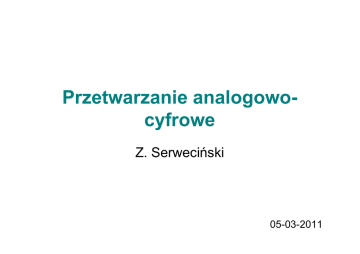 Przetwarzanie analogowocyfrowe Z. Serweciński 05-03-2011 Przetwarzanie sygnału analogowego na sygnał cyfrowy Proces przetwarzania sygnału analogowego (ciągłego) na sygnał cyfrowy składa się z trzech podstawowych operacji: 1. Próbkowanie sygnału analogowego próbkowanie punktowe / próbkowanie z pamiętaniem) 2. Kwantowanie próbek 3. Kodowanie wartości próbek 2 Próbkowanie punktowe sygnału analogowego u(t) sygnał analogowy t u(t) sygnał spróbkowany (PAM) t Tp Sygnał po próbkowaniu jest już nieciągłym, lecz nadal jest sygnałem analogowym. 3 Próbkowanie z pamiętaniem sygnału analogowego u(t) sygnał analogowy t u(t) sygnał spróbkowany (PAM) t Tp 4 Układ próbkująco-pamiętający we Klucz FET wy 100 pF Próbkuj 5 Twierdzenie o próbkowaniu Twierdzenie Shannona Jeżeli sygnał ciągły ma ograniczone od góry widmo częstotliwościowe, tzn. nie zawiera składowych harmonicznych o częstotliwości większej niż fg, to sygnał ten może być odtworzony bez zniekształceń z próbek, które są pobierane z częstotliwością próbkowania fp nie mniejszą niż 2·fg, tzn. fp ≥ 2·fg Częstotliwość fp = 2fg jest nazywana częstotliwością Nyquista 6 Wymagane częstotliwości próbkowania wybranych sygnałów Minimalną częstotliwości próbkowania wylicza się korzystając z warunku Nyquista: fp min = 2·fg , tzn. częstotliwość próbkowania musi być co najmniej dwa razy większa od maksymalnej częstotliwości występującej w widmie sygnału (fg). Rozmowa telefoniczna f = 300 ÷ 3400 Hz fp ≥ 2 · 3400 Hz = 6800 Hz (w praktyce 8 kHz) Sygnał akustyczny Hi-Fi f = 20 Hz ÷ 20 kHz fp ≥ 2 · 20 kHz = 40 kHz (w praktyce 44,1 kHz) Sygnał telewizyjny f = 0 ÷ 6,5 MHz fp ≥ 2 · 6,5 MHz = 13 MHz 7 Widmo sygnału spróbkowanego U(f) fg f Widmo sygnału ciągłego U(f) fg fp - fg fp/2 fp + fg fp 2fp - fg 3fp - fg 2fp 2fp + fg 3fp + fg f 2fp Widmo sygnału spróbkowanego z częstotliwością fp > 2·fg 8 Zjawisko aliasingu (przeinaczenia) Jeżeli sygnał wejściowy nie ma ograniczonego pasma częstotliwości do ½ · f p, wówczas próbkowanie sygnału ciągłego ze stałym okresem Tp jest źródłem aliasingu, czyli nakładania się na siebie powtórzeń widma tego sygnału. U(f) aliasing fg fp/2 fp - fg fp + fg fp 3fp - fg 2fp + fg aliasing 3fp + fg 3fp 2fp 2fp - fg aliasing aliasing aliasing 5fp - fg 5fp 4fp 4fp - fg 5fp + fg 4fp + fg Widmo sygnału spróbkowanego z częstotliwością fp < 2·fg 9 f Filtrowanie antyaliasingowe Widmo rzeczywistych sygnałów jest ze względu na zniekształcenia i szumy bardzo szerokie. Aby zapobiec zjawisku aliasingu podczas próbkowania, można: przyjąć odpowiednio dużą częstotliwość próbkowania, co jest niedogodne poddać sygnał analogowy filtracji dolnoprzepustowej przed próbkowaniem, tak aby ograniczyć jego widmo do częstotliwości nie większej niż ½ · f p 10 Kwantowanie próbek Kwantowanie polega na zamianie analogowej wartości próbki sygnału na liczbę o wartości należącej do ograniczonego zbioru. Prowadzone jest przy założeniach: określonego zakresu zmian sygnału wejściowego: Umin ÷ Umax podziału zakresu przetwarzania na N przedziałów kwantowania Kwantowanie polega na sprawdzeniu, w którym przedziale kwantowania znajduje się próbka sygnału. Jego wynikiem jest numer tego przedziału, który poddawany 11 jest kodowaniu. Kwantowanie próbek nr próbki poziom kwantyzacji numer poziomu kwantyzacji poziomy kwantyzacji numer poziomu kwantyzacji a 4 0100 b 5 0101 9 1001 c 6 0110 8 1000 d 6 0110 7 0111 e 6 0110 6 0110 f 6 0110 5 0101 g 5 0101 4 0100 h 5 0101 3 0011 i 5 0101 2 0010 j 5 0101 1 0001 k 6 0110 0 0000 l 7 0111 a b c d e f g h i j k l t 12 Jakość przetwarzania analogowo-cyfrowego Jakość przetwarzania analogowo-cyfrowego zależy m.in. od ilości poziomów kwantyzacji. Ilość poziomów kwantyzacji jest określona przez ilość bitów przeznaczonych na reprezentację numeru przedziału kwantyzacji Kwantyzacja N-bitowa → 2N poziomów kwantowania, np. kwantyzacja 8-bitowa → 28 = 256 poziomów kwantowania kwantyzacja 16-bitowa → 216 = 65536 poziomów kwantowania Błąd kwantyzacji = wartość sygnału – wartość najbliższego poziomu kwantyzacji. Błąd kwantyzacji ≤ ½ odległości między sąsiednimi poziomami kwantyzacji. 13 Błąd kwantyzacji (przykład) sygnał sygnał analogowy skwantowany poziomy kwantyzacji nr poziomu kwantyzacji 10 1010 9 1001 8 1000 7 6 0111 0110 5 0101 4 0100 3 0011 2 1 0010 0001 0 0000 a b c d e f g h i j k l m t Błąd kwantyzacji = wartość sygnału – wartość najbliższego poziomu kwantyzacji 14 Błąd kwantyzacji równomiernej poziomy kwantyzacji sygnał ciągły sygnał skwantowany t błąd kwantyzacji t 15 Błąd kwantyzacji nierównomiernej poziomy kwantyzacji sygnał ciągły sygnał skwantowany t błąd kwantyzacji t 16 Kodowanie Kodowanie jest bezpośrednio powiązane z kwantowaniem. Kodowanie może być unipolarne, jeżeli zakłada zmianę wartości o jednym znaku. Kodami wyjściowymi mogą wtedy być: naturalny kod binarny (NB) kod dwójkowo-dziesiętny BCD kody komplementarne do powyższych Kodowanie może być bipolarne, jeżeli zakłada zamianę wartości o zmieniającym się znaku. Kodami wyjściowymi mogą wtedy być: kod znak-moduł od uzupełnień do 2 17 przesunięty kod binarny (+ komplementarny) Kody przetworników bipolarnych Liczba Zapis znak-moduł Zapis uzupełnień do 2 Przesunięty kod binarny +7 0111 0111 1111 +6 0110 0110 1110 +5 0101 0101 1101 +4 0100 0100 1100 +3 0011 0011 1011 +2 0010 0010 1010 +1 0001 0001 1001 +0 0000 0000 1000 −0 1000 (0000) (1000) −1 1001 1111 0111 −2 1010 1110 0110 −3 1011 1101 0101 −4 1100 1100 0100 −5 1101 1011 0011 −6 1110 1010 0010 −7 1111 1001 0001 −8 − 1000 0000 18 Błąd kwantyzacji – wnioski Błąd kwantyzacji wprowadza do sygnału odtwarzanego zniekształcenia zwane zniekształceniami kwantowania lub – ze względu na efekty słuchowe – szumem kwantowan