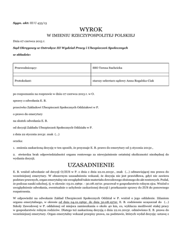 Sygn. akt: III U 433/13 WYROK W IMIENIU RZECZYPOSPOLITEJ POLSKIEJ Dnia 07 czerwca 2013 r. Sąd Okręgowy w Ostrołęce III Wydział Pracy i Ubezpieczeń Społecznych w składzie: Przewodniczący: SSO Teresa Suchcicka Protokolant: starszy sekretarz sądowy Anna Rogalska-Ciak po rozpoznaniu na rozprawie w dniu 07 czerwca 2013 r. w O. sprawy z odwołania E. B. przeciwko Zakładowi Ubezpieczeń Społecznych Oddziałowi w P. o prawo do emerytury na skutek odwołania E. B. od decyzji Zakładu Ubezpieczeń Społecznych Oddziału w P. z dnia 22 stycznia 2013r. znak (...) orzeka: 1. zmienia zaskarżoną decyzję w ten sposób, że przyznaje E. B. prawo do emerytury od 3 stycznia 2013r., 2. stwierdza brak odpowiedzialności organu rentowego za niewyjaśnienie ostatniej okoliczności niezbędnej do wydania decyzji. UZASADNIENIE E. B. wniósł odwołanie od decyzji O/ZUS w P. z dnia z dnia 22.01.2013r., znak (...) odmawiającej mu prawa do wcześniejszej emerytury. W obszernym uzasadnieniu wskazał, że decyzja nie jest prawidłowa, gdyż nie zawiera podstaw prawnych, organ emerytalny nie uwzględnił także materiału dowodowego złożonego do akt rentowych. Podał, że podczas nauki szkolnej, tj. w okresie: 03.01.1969r. - 30.08.1972r. pracował w gospodarstwie rolnym ojca. Wniósł o uwzględnienie odwołania, ewentualnie o uchylenie zaskarżonej decyzji i przekazanie sprawy do ZUS do ponownego rozpatrzenia. W odpowiedzi na odwołanie Zakład Ubezpieczeń Społecznych Oddział w P. wniósł o jego oddalenie. Zdaniem organu emerytalnego, w okresie od dnia 04.01.1969r. do dnia 30.08.1972r. E. B. codziennie uczęszczał do (...) Szkoły Zawodowej w P. oddalonej od miejsca zamieszkania o około 40 km, co, wyklucza możliwość stałej pracy w gospodarstwie rolnym rodziców. Dlatego też zaskarżoną decyzją z dnia 22.01.2013r. odmówiono E. B. prawa do wcześniejszej emerytury. Organ emerytalny wskazał przepisy prawa, na podstawie, których wydał decyzję: ustawę z dnia 17.12.1998r. o emeryturach i rentach z Funduszu Ubezpieczeń Społecznych. E. B. udowodnił przed ZUS na dzień 01.01.1999r. okres pracy w łącznej ilości 23 lata, 3 miesiące i 19 dni – zamiast wymaganych ustawowo 25 lat pracy. Sąd ustalił i zważył, co następuje: W dniu 28.12.2012r. E. B. (ur. (...)) złożył w Oddziale Zakładu Ubezpieczeń Społecznych w P. Inspektoracie w P. wniosek o ustalenie uprawnień do wcześniejszej emerytury, na podstawie przepisów ustawy z dnia 17.12.1998r. o emeryturach i rentach z Funduszu Ubezpieczeń Społecznych (Dz.U.2009.153.1227 j.t.). Odwołujący wnioskował także o zaliczenie do ogólnego stażu pracy okresu pracy w gospodarstwie rolnym ojca w O. w okresie: 03.01.1969r. - 30.08.1972r. Na powyższą okoliczność przedstawił zeznania świadków, którzy potwierdzili, że w w/w okresie wykonywał on prace rolnicze stale i w pełnym wymiarze (k. 1 – 3 a.e. nr (...)). Na podstawie przedstawionych przez odwołującego dokumentów Oddział ZUS uznał za udowodniony na dzień 01.01.1999r. okres pracy w ilości 22 lat, 10 miesięcy i 16 dni okresów składkowych oraz 5 miesięcy i 3 dni okresów nieskładkowych, tj. łącznie 23 lata, 3 miesiące i 19 dni. Okres pracy w szczególnych warunkach udowodniono w wymiarze 22 lat, 1 miesiąca i 16 dni zamiast wymaganych 25 lat pracy. Oddział ZUS nie uznał okresu pracy w gospodarstwie rolnym, ponieważ z oświadczenia odwołującego z dnia 18.12.2012r. (karta 5 akt) wynika, że w latach 1969-1972 codziennie uczęszczał do (...) Szkoły Zawodowej w P. oddalonej od miejsca zamieszkania o około 40 km. Zdaniem organu emerytalnego, fakt uczęszczania odwołującego do stacjonarnej szkoły ponadpodstawowej, biorąc pod uwagę odległość dzielącą miejsce zamieszkania od miejsca nauki, wyklucza możliwość stałej pracy odwołującego w gospodarstwie rolnym rodziców. Z tego powodu Oddział ZUS nie uznał okresu pracy odwołującego w gospodarstwie rolnym i decyzją z dnia 22.01.2013r. odmówił odwołującemu prawa do wcześniejszej emerytury (k. 24 a.e. nr (...)). E. B. od powyższej decyzji wniósł odwołanie do Sądu Okręgowego w Ostrołęce. Odwołanie E. B. zasługuje na uwzględnienie. Przedmiotem orzekania w niniejszej sprawie jest prawidłowość decyzji Zakładu Ubezpieczeń Społecznych z dnia 22.01.2013 r., którą tą decyzją odmówiono E. B. prawa do wcześniejszej emerytury z uwagi na brak ogólnego stażu pracy. Zgodnie z art. 24 ust. l ustawy z dnia 17.12.1998 r. o emeryturach i rentach z Funduszu Ubezpieczeń Społecznych (Dz.U.2009.153.1227 j.t.), ubezpieczonym urodzonym po dniu 31.12.1948r. przysługuje emerytura po osiągnięciu wieku emerytalnego, wynoszącego co najmniej 60 lat dla kobiet i co najmniej 65 lat dla mężczyzn. Na podstawie natomiast art. 184 w/w ustawy z dnia 17.12.1998r. o emeryturach i rentach w związku z § 4 rozporządzenia Rady Ministrów z dnia 07.02.1983r. w sprawie wieku emerytalnego oraz wzrostu emerytur i rent inwalidzkich dla pracowników zatrudnionych w szczególnych warunkach lub w szczególnym charakterze (Dz.U. 1983 nr 8 poz. 43) emerytura przysługuje, jeżeli ubezpieczony spełnił łącznie następujące warunki: - osiągnął wiek emerytalny wynoszący 60 lat dla mężczyzny; - nie przystąpił do otwartego funduszu emerytalnego lub złożył wniosek o przekazanie środków zgromadzonych na rachunku w OFE, za pośrednictwem Zakładu na dochody budżetu państwa; - rozwiązał stosunek pracy, w przypadku ubezpieczonego będącego pracownikiem; - w dniu wejścia w życie przepisów cytowanej ustawy emerytalnej, tj. 01.01.1999 r. udowodnił okres składkowy i nieskładkowy wynoszący co najmniej 25 lat dla mężczyzn, w tym: okres zatrudnienia w szczególnych warunkach lub w szczególnym charakterze wykonywany stale i w pełnym wymiarze czasu pracy, obowiązującym na danym stanowisku pracy, wynoszący co najmniej 15 lat. Za pracowników zatrudnionych w szczególnych warunkach uważa 