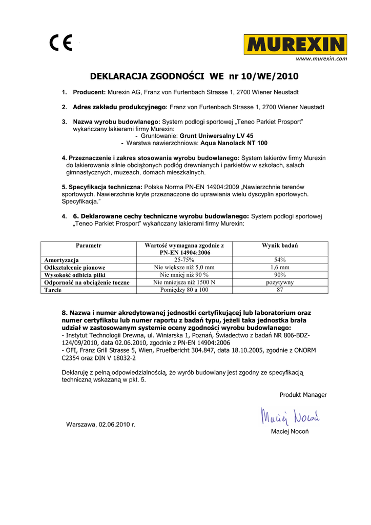 DEKLARACJA ZGODNOŚCI WE nr 10/WE/2010 1. Producent: Murexin AG, Franz von Furtenbach Strasse 1, 2700 Wiener Neustadt 2. Adres zakładu produkcyjnego: Franz von Furtenbach Strasse 1, 2700 Wiener Neustadt 3. Nazwa wyrobu budowlanego: System podłogi sportowej „Teneo Parkiet Prosport” wykańczany lakierami firmy Murexin: - Gruntowanie: Grunt Uniwersalny LV 45 - Warstwa nawierzchniowa: Aqua Nanolack NT 100 4. Przeznaczenie i zakres stosowania wyrobu budowlanego: System lakierów firmy Murexin do lakierowania silnie obciążonych podłóg drewnianych i parkietów w szkołach, salach gimnastycznych, muzeach, domach mieszkalnych. 5. Specyfikacja techniczna: Polska Norma PN-EN 14904:2009 „Nawierzchnie terenów sportowych. Nawierzchnie kryte przeznaczone do uprawiania wielu dyscyplin sportowych. Specyfikacja.” 4. 6. Deklarowane cechy techniczne wyrobu budowlanego: System podłogi sportowej „Teneo Parkiet Prosport” wykańczany lakierami firmy Murexin: Parametr Amortyzacja Odkształcenie pionowe Wysokość odbicia piłki Odporność na obciążenie toczne Tarcie Wartość wymagana zgodnie z PN-EN 14904:2006 25-75% Nie większe niż 5,0 mm Nie mniej niż 90 % Nie mniejsza niż 1500 N Pomiędzy 80 a 100 Wynik badań 54% 1,6 mm 90% pozytywny 87 8. Nazwa i numer akredytowanej jednostki certyfikującej lub laboratorium oraz numer certyfikatu lub numer raportu z badań typu, jeżeli taka jednostka brała udział w zastosowanym systemie oceny zgodności wyrobu budowlanego: - Instytut Technologii Drewna, ul. Winiarska 1, Poznań, Świadectwo z badań NR 806-BDZ124/09/2010, data 02.06.2010, zgodnie z PN-EN 14904:2006 - OFI, Franz Grill Strasse 5, Wien, Pruefbericht 304.847, data 18.10.2005, zgodnie z ONORM C2354 oraz DIN V 18032-2 Deklaruję z pełną odpowiedzialnością, że wyrób budowlany jest zgodny ze specyfikacją techniczną wskazaną w pkt. 5. Produkt Manager Warszawa, 02.06.2010 r. Maciej Nocoń