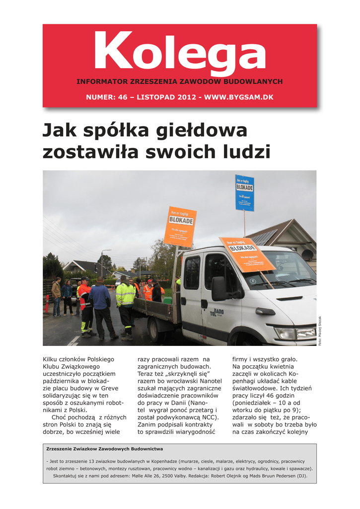 Kolega INFORMATOR ZRZESZENIA ZAWODOW BUDOWLANYCH NUMER: 46 – LISTOPAD 2012 - WWW.BYGSAM.DK Foto: Maciej Slezak Jak spółka giełdowa zostawiła swoich ludzi Kilku członków Polskiego Klubu Związkowego uczestniczyło początkiem października w blokadzie placu budowy w Greve solidaryzując się w ten sposób z oszukanymi robotnikami z Polski. Choć pochodzą z różnych stron Polski to znają się dobrze, bo wcześniej wiele razy pracowali razem na zagranicznych budowach. Teraz też „skrzyknęli się” razem bo wrocławski Nanotel szukał mających zagraniczne doświadczenie pracowników do pracy w Danii (Nanotel wygrał ponoć przetarg i został podwykonawcą NCC). Zanim podpisali kontrakty to sprawdzili wiarygodność firmy i wszystko grało. Na początku kwietnia zaczęli w okolicach Kopenhagi układać kable światłowodowe. Ich tydzień pracy liczył 46 godzin (poniedziałek – 10 a od wtorku do piątku po 9); zdarzało się też, że pracowali w soboty bo trzeba było na czas zakończyć kolejny Zrzeszenie Zwiazkow Zawodowych Budownictwa - Jest to zrzeszenie 13 zwiazkow budowlanych w Kopenhadze (murarze, ciesle, malarze, elektrycy, ogrodnicy, pracownicy robot ziemno – betonowych, montezy rusztowan, pracownicy wodno – kanalizacji i gazu oraz hydraulicy, kowale i spawacze). Skontaktuj sie z nami pod adresem: Mølle Alle 26, 2500 Valby. Redakcja: Robert Olejnik og Mads Bruun Pedersen (DJ). etap prac. A zadanie mieli niełatwe bo nie dosyć, że kopali w nieznanym gruncie to na dodatek przywieziony z Polski sprzęt, którym pracowali pozostawiał wiele do życzenia i nie nadawał się do pracy w twardym gruncie. Wielokrotnie informowali polską firmę o problemach i proponowali zmiany. Nikt jednak ich nie słuchał. Mimo tego roboty postępowały Z pracy i ze stawki byli zadowoleni. Od początku z kasą nie było większych problemów aż do 20 sierpnia, wtedy to po raz ostatni dostali wypłatę. Mimo tego nie zeszli z placu budowy bo chcieli skończyć to co zaczęli a w firmie obiecywano, że kasę dostaną lada dzień. Mijały kolejne nakreślone przez firmę terminy a pieniędzy nie było. Kierownictwo kontraktu już wcześniej wróciło do Polski zostawiając na miejscu jedynie lidera grupy. To właśnie on, choć mógł jak inni zwiać do Polski, został z nimi aż do końca. To jego Zarząd firmy obwiniał za brak pieniędzy bo ponoć od samego początku popełniał błędy !!! Skoro tak było to dlaczego nie odwołano go do kraju ? Szanująca się firma, tym bardziej giełdowa (Nanotel jest spółką akcyjną notowaną na GPW w Warszawie), nie powinna tolerować takiego zachowania, tymczasem proponowano mu stanowisko w Zarządzie firmy. Po 6 tygodniach otrzymali z Polski wiadomość, że pieniędzy dla nich nie ma i nie będzie. Wtedy to zwrócili się o pomoc do związków zawodowych. Sprawy potoczyły się bardzo szybko i w ciągu 2 tygodniu NCC wypłaciło zaległe pieniądze oraz zakończyło współpracę z Nanotelem. Nanotel DK Aps (pod taką nazwą występowała firma w Danii) mieści się w Kopenhadze przy Halmtorvet 29. W tym samym miejscu zarejestrowany jest między innymi PDCH firma związana z pewnym Polakiem o imieniu Tomasz, który wraz ze swoimi współpracownikami wykręca takie numery od kilku lat. NCC po raz czwarty w ostatnim czasie miało problemy z polskim podwykonawcą. Czyżby nie sprawdzali kontrahentów ? A może przysłowiowy pies jest pogrzebany gdzie indziej ? Ciekawe jak zareaguje warszawski parkiet gdy informacje o oszustwie Nanotela dotrą do akcjonariuszy?? Krzysztof Kozik Spotkanie klubu Spotkanie klubu zwiazkowego odbedzie sie w sobota 24. listopada 2012 od godz. 16.00 w siedzibie 3F BJMF na ulicy Mølle Alle 26, 2500 Valby (parking od tylu budynku) Na spotkanie zapraszamy wszystkich zainteresowanych i chetnych. Wstep wolny i bez oplat lecz ze wzgledu na serwowany posilek i napoje prosimy o zameldowanie przybycia u Roberta pod telefonem: +45 22 79 89 60 lub Marcina pod telefonem: +45 61 28 01 72 Spotkanie z ZUS W Kopenhadze W dniach 17 listopada, sobota godz.16 oraz 18 listopada, niedziela godz. 14 listopada roku odbeda sie w Kopenhadze przy ambasadzie RP dni poradnictwa w zakresie ubezpieczenia spolecznego dla Polakow pracujacych lub mieszkajacych w Danii. Wiecej wiadomosci na temat spotkania otrzymasz pod telefonem: +45 39 46 77 21 Miejsce spotkan:Ambasada RP, ulica: Richelieus Alle 12, 2900 Hellerup Napisz i zadzwoń do mówiacych po polsku związkowców: E-mail: [email protected] (22 79 89 60) lub [email protected] (23 45 75 34). Przeczytaj więcej po polsku na: www.bygsam.dk, www.3f.dk
