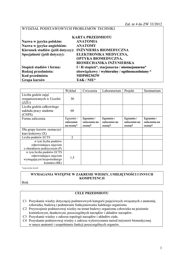 Zał. nr 4 do ZW 33/2012 WYDZIAŁ PODSTAWOWYCH PROBLEMÓW TECHNIKI KARTA PRZEDMIOTU Nazwa w języku polskim: ANATOMIA Nazwa w języku angielskim: ANATOMY Kierunek studiów (jeśli dotyczy): INŻYNIERIA BIOMEDYCZNA Specjalność (jeśli dotyczy): ELEKTRONIKA MEDYCZNA, OPTYKA BIOMEDYCZNA, BIOMECHANIKA INŻYNIERSKA Stopień studiów i forma: I / II stopień*, stacjonarna / niestacjonarna* Rodzaj przedmiotu: obowiązkowy / wybieralny / ogólnouczelniany * Kod przedmiotu MDP002302W Grupa kursów TAK / NIE* Wykład Liczba godzin zajęć zorganizowanych w Uczelni (ZZU) Liczba godzin całkowitego nakładu pracy studenta (CNPS) Forma zaliczenia Ćwiczenia Laboratorium Projekt Seminarium Egzamin / zaliczenie na ocenę* Egzamin / zaliczenie na ocenę* Egzamin / zaliczenie na ocenę* 30 60 Egzamin / zaliczenie na ocenę* Egzamin / zaliczenie na ocenę* Dla grupy kursów zaznaczyć kurs końcowy (X) Liczba punktów ECTS w tym liczba punktów odpowiadająca zajęciom o charakterze praktycznym (P) w tym liczba punktów ECTS odpowiadająca zajęciom wymagającym bezpośredniego kontaktu (BK) 2 1,5 *niepotrzebne skreślić WYMAGANIA WSTĘPNE W ZAKRESIE WIEDZY, UMIEJĘTNOŚCI I INNYCH KOMPETENCJI Brak \ CELE PRZEDMIOTU C1 Pozyskanie wiedzy dotyczącej podstawowych kategorii pojęciowych związanych z anatomią człowieka, budową i podstawami funkcjonowania ludzkiego organizmu. C2 Przyswojenie podstawowej wiedzy na temat budowy organizmu człowieka na poziomie komórkowym, tkankowym, poszczególnych narządów i układów narządów. C3 Pozyskanie wiedzy z zakresu topologii narządów i układów ciała. C4 Pozyskanie podstawowej wiedzy z zakresu wykorzystania metod inżynierii biomedycznej w nauce anatomii i uzupełnianiu funkcji poszczególnych organów. 1 PRZEDMIOTOWE EFEKTY KSZTAŁCENIA Z zakresu wiedzy: PEK_W01 Zna i rozumie podstawowe pojęcia z zakresu anatomii. Ma poszerzoną wiedzę na temat morfologii i topologii narządów człowieka. Ma uporządkowaną wiedzę ogólną, obejmującą zagadnienia z zakresu budowy elementów składowych ciała ludzkiego na poziomie, komórkowym, tkankowym i poszczególnych organów. Ma wiedzę na temat wykorzystania metod inżynierii biomedycznej w nauce anatomii i wspomaganiu narządów człowieka. Z zakresu umiejętności: PEK_U01 Potrafi pozyskiwać informacje z literatury, baz danych i innych źródeł, potrafi prawidłowo interpretować, selekcjonować i łączyć pozyskane informacje, potrafi zastosować w praktyce pozyskane informacje, w szczególności potrafi przygotować referat na zadany temat, dotyczący zastosowania metod inżynierii biomedycznej w uzupełnianiu/zastępowaniu funkcji narządów człowieka. Potrafi wyciągać wnioski, formułować i uzasadniać opinie, w szczególności w zakresie wiedzy z anatomii. Z zakresu kompetencji społecznych: PEK_K01 Potrafi dokonać krytycznej samooceny oraz realizować proces samokształcenia. Umie pracować zespołowo oraz wykazuje gotowość podporządkowania się zasadom pracy w grupie. Ma świadomość odpowiedzialności zarówno za pracę własną, jak i potrafi wspólnie realizować zadanie zespołowe, w szczególności opracować wspólnie zadany temat. Ma świadomość roli społecznej i zawodowej studenta uczelni technicznej, zwłaszcza w zakresie rzetelnego i uczciwego przekazu informacji oraz uczciwego poddania się procesowi sprawdzania wiedzy. TREŚCI PROGRAMOWE Wy1 Wy2 Wy3 Wy4 Wy5 Wy6 Wy7 Wy8 Wy9 Wy10 Wy11 Wy12 Wy13 Wy14 Forma zajęć - wykład Liczba godzin Wprowadzenie. Rola inżynierii biomedycznej w nauce anatomii 2 Podstawowa terminologia anatomiczna. Okolice ciała ludzkiego, kierunki 1 i położenie w przestrzeni Podstawy struktury i funkcji organizmu. Elementy składowe ciała ludzkiego. 1 Anatomia na poziomie mikro i nano. Budowa komórkowa i subkomórkowa. 2 Osteologia i artrologia. Budowa i funkcja tkanki kostnej. Budowa i rodzaje 2 stawów. Budowa kończyny górnej. Rola inżynierii biomedycznej w uzupełnianiu 2 funkcji organizmu. Budowa kończyny dolnej. Rola inżynierii biomedycznej w uzupełnianiu 2 funkcji organizmu. Kręgosłup, czaszka, kości klatki piersiowej - budowa, funkcje w organizmie. 2 Budowa i funkcje skóry i mięśni. 2 Trzewia klatki piersiowej. Metody monitorowania funkcji serca i płuc. 4 Trzewia jamy brzusznej. Metody badania układu pokarmowego. 4 Mózg i układ nerwowy. 2 Układ moczowy. 2 Anatomia układu rozrodczego, metody badania narządów płciowych 2 i monitorowania płodu Suma godzin 30 2 STOSOWANE NARZĘDZIA DYDAKTYCZNE N1 Komputer i oprogramowanie do prezentacji multimedialnych na wykładzie. N2 Pokazy filmowe. N3 Preparaty anatomiczne: naturalne i sztuczne. OCENA OSIĄGNIĘCIA PRZEDMIOTOWYCH EFEKTÓW KSZTAŁCENIA Oceny F – formująca (w trakcie semestru), P – podsumowująca (na koniec semestru) F1 Numer efektu kształcenia F2 PEK_W01 PEK_K01 PEK_W01 PEK_U01 PEK_K01 Sposób oceny osiągnięcia efektu kształcenia Ocena średnia z ocen cząstkowych, zaokrąglona w dół za zaliczenie kartkówek oraz kolokwium z referatu Ocena z egzaminu. Egzamin testowy, dwuczęściowy. P = średnia z ocen F1 i F2 LITERATURA PODSTAWOWA I UZUPEŁNIAJĄCA LITERATURA PODSTAWOWA: [1] Anatomia Gray. Podręcznik dla studentów. Tom 1 (Anatomia ogólna i anatomia układu ruchu) R.L. Drake, A.W. Vogl, A.W.M. Mitchell; wyd. I polskie, red. M. Bruska, B. Ciszek, P. Kowiański, W. Woźniak, Wyd. Med.e Urban & Partner, 2010 [2] Anatomia Gray. Podręcznik dla studentów. Tom 2 (Anatomia narządów wewnętrznych), R.L. Drake, A.W. Vogl, A.W.M. Mitchell, wyd. I polskie, red. M. Bruska, B. Ciszek, P. Kowiański, W. Woźniak, Wyd. Med. Urban & Partner, Warszawa 2010 LITERATURA UZUPEŁNIAJĄCA: [1] Anatomia człowiek. Podręcznik dla studentów medycyny, Witold Woźniak (red.) Wyd. Med. Urban & Partner, 2003 [2] Anatomia człowieka. Interaktywny Egzamin Testowy. Human Anatomy Interactive MCQ (2 płyty CD) Autor: Jerzy Stanisław Gielecki, Wojciech Ruszowski, Wyd. Med.e Górnicki