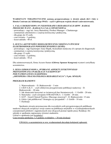 WARSZTATY TERAPEUTYCZNE zostaną przeprowadzone w dwóch salach (K2 i K6) w Hotelu Centrum (ul. Kilińskiego 59/63) – czyli w głównym wejściu obrad i zakwaterowania. 1. FALA UDERZENIOWA W FIZJOTERAPII I REHABILITACJI (RPW - RADIAL PRESSURE WAVE - RADIALNA FALA CIŚNIENIOWA) - prowadzący - mgr inż. Jerzy Bartodziej, Product Manager - Chattanooga - seminarium szkoleniowe z częścią teoretyczną i praktyczną, - dla grupy do 25 osób, - czas trwania - 3 godziny, - koszt udziału - 40 zł. 2. OCENA AKTYWNOŚCI BIOELEKTRYCZNEJ MIĘŚNI Z UŻYCIEM ELEKTROMIOGRAFII POWIERZCHNIOWEJ (SEMG) - prowadząca - mgr fizjoterapii Anna Słupik, Konsultant medyczny d/s sprzętu do diagnostyki - seminarium z częścią teoretyczną i praktyczną, - dla grupy 12 osób, - czas trwania - 2 godziny, - koszt udziału - 50 zł. Dla zainteresowanych, firma Accuro-Sumer (Główny Sponsor Kongresu) wystawi certyfikaty uczestnictwa. 3. SESJA SZKOLENIOWA „WYBRANE ASPEKTY EFEKTYWNEGO PRZYGOTOWANIA PUBLIKACJI NAUKOWYCH” POD PATRONATEM CZASOPISMA „ORTOPEDIA TRAUMATOLOGIA REHABILITACJA” ( 9 pkt. MNiSzW) PROGRAM RAMOWY 1. Wprowadzenie – D. Białoszewski – 5 min 2. I.M.P.A.K.T. – czyli efektywne przygotowanie publikacji naukowej – D. Białoszewski – 20 min. 3. Jak skutecznie korzystać ze światowych baz literaturowych – J. Gotlib – 20 min. 4. Statystyka - czyli oswajanie STRASZYDŁA - J. Gotlib – 20 min. 5. GCP – Good Clinical Practice. Dlaczego stosować?– D. Białoszewski- 15 min 6. Gdzie i jak publikować? Strategia czy przypadek? - J. Gotlib - 10 min 7. Dyskusja Spotkanie otwarte przeznaczone dla wszystkich osób przygotowujących publikacje naukowe chcących zwiększyć swoje szanse na publikacje artykułów w wysokopunktowanych czasopismach polskich i zagranicznych oraz chcących poznać tajniki pracy Redakcji. Do udziału w spotkaniu zapraszamy również studentów. Udział w spotkaniu jest bezpłatny! Czas trwania spotkania: 1,5 godziny wykładów + 30 min dyskusji UWAGA: o uczestnictwie w ww. wydarzeniach decyduje kolejność zgłoszeń.
