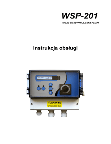 WSP-201 UKŁAD STEROWANIA JEDNĄ POMPĄ Instrukcja obsługi Spis treści 1 Informacje podstawowe.....................................................................................................3 1.1 Właściwości ogólne..................................................................................................3 1.2 Wyposażenie opcjonalne..........................................................................................3 1.3 Dane techniczne.......................................................................................................4 1.4 Elementy sterowania i kontroli..................................................................................4 1.4.1 Klawisze sterujące.............................................................................................4 1.4.2 Kontrolki sygnalizacyjne....................................................................................5 1.4.3 Wyświetlacz LCD...............................................................................................5 2 Montaż i obsługa................................................................................................................6 2.1 Montaż......................................................................................................................6 2.2 Podłączenia..............................................................................................................6 2.2.1 Zasilanie sterownika i podłączenie pompy........................................................7 2.2.2 Zaciski sterujące i sygnalizacyjne.....................................................................8 2.3 Poziomy sterujące....................................................................................................8 2.3.1 Przetwornik wewnętrzny....................................................................................8 2.3.2 Zewnętrzny czujnik ciśnienia 4-20mA...............................................................8 2.3.3 Wyłączniki pływakowe.......................................................................................8 2.3.3.1 Działanie.....................................................................................................9 2.4 Praca testowa bez pompy........................................................................................9 2.5 Nastawianie..............................................................................................................9 2.6 Informacje dodatkowe.............................................................................................11 2.6.1 Ustawianie wartości poziomów........................................................................11 2.6.2 Ustawianie wartości prądów............................................................................12 2.6.3 Ustawianie kontrastu wyświetlacza LCD.........................................................12 2.6.4 Kalibracja wewnętrznego przetwornika poziomu............................................12 3 Awarie, przyczyny i sposoby ich usuwania......................................................................12 4 Obsługa i konserwacja.....................................................................................................15 5 Gwarancja........................................................................................................................15 6 Informacje dotyczące przepisów......................................................................................16 6.1 Utylizacja zużytego sprzętu....................................................................................16 6.2 Deklaracja zgodności..............................................................................................16 1 Informacje podstawowe Urządzenie WSP-201 przeznaczone jest do sterowania pracą pompy w zależności od poziomu wody. Główne obszary zastosowania, to: ● Przetłaczanie wody ● Przetłaczanie ścieków ● Przydomowe przepompownie ścieków ● Kanalizacja ciśnieniowa Pomiar poziomu może odbywać się za pomocą ciśnienia hydrostatycznego, rurki barbotażowej, zewnętrznego czujnika (4-20mA) lub wyłączników pływakowych. Pompa jest załączana bezpośrednio za pomocą stycznika. Sygnalizacja stanów awaryjnych odbywa się za pomocą trzech styków przekaźnikowych, wbudowanego sygnalizatora akustycznego oraz kontrolki na przednim panelu. Obsługi i nastawiania urządzenia dokonuje się za pomocą klawiszy umieszczonych na przednim panelu. Urządzenie zostało zaprojektowane i wykonane ze szczególnym naciskiem na długą i bezawaryjną pracę w każdych warunkach. Wszystkie komponenty użyte w konstrukcji układu elektronicznego są przystosowane do pracy w ujemnych temperaturach. Jako zasilanie układu elektronicznego zastosowano wysokosprawny zasilacz impulsowy, co przyczyniło się znacznie do zminimalizowania poboru energii z sieci, potrzebnej do zasilania urządzenia. Wykorzystanie technologii montażu powierzchniowego umożliwiło wykonanie urządzenia o kompaktowej budowie, zapewniając wysoką ergonomię podczas instalacji. 1.1 ● ● ● ● ● ● Właściwości ogólne Wyświetlacz LCD 2 x 16 Wymuszona praca pompy Wbudowany alarm akustyczny Bezpotencjałowy alarm wysokiego poziomu Zbiorcza sygnalizacja awarii: potencjałowa i bezpotencjałowa Zabezpieczenie przed przeciążeniem 1.2 ● ● ● ● ● ● ● Zabezpieczenie przed suchobiegiem Czujnik kontroli faz Wskazanie prądu pompy Wskazanie poziomu wody w zbiorniku Licznik czasu pracy pompy Licznik załączeń pompy Zapamiętywanie komunikatów o awariach po zaniku napięcia zasilania Wyposażenie opcjonalne Urządzenie WSP-201 może być na życzenie dostarczane z dodatkowym, wewnętrznym przetwornikiem poziomu. Umożliwia to realizację korzystnego cenowo, dodatkowego systemu kontroli. Drugi pomiar ciśnienia hydrostatycznego w zbiorniku dokonywany jest na wysokości, do której poziom wody nie dochodzi po