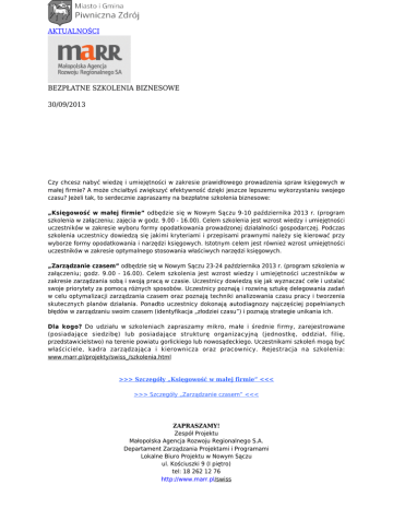 AKTUALNOŚCI BEZPŁATNE SZKOLENIA BIZNESOWE 30/09/2013 Czy chcesz nabyć wiedzę i umiejętności w zakresie prawidłowego prowadzenia spraw księgowych w małej firmie? A może chciałbyś zwiększyć efektywność dzięki jeszcze lepszemu wykorzystaniu swojego czasu? Jeżeli tak, to serdecznie zapraszamy na bezpłatne szkolenia biznesowe: „Księgowość w małej firmie” odbędzie się w Nowym Sączu 9-10 października 2013 r. (program szkolenia w załączeniu; zajęcia w godz. 9.00 - 16.00). Celem szkolenia jest wzrost wiedzy i umiejętności uczestników w zakresie wyboru formy opodatkowania prowadzonej działalności gospodarczej. Podczas szkolenia uczestnicy dowiedzą się jakimi kryteriami i przepisami prawnymi należy się kierować przy wyborze formy opodatkowania i narzędzi księgowych. Istotnym celem jest również wzrost umiejętności uczestników w zakresie optymalnego stosowania właściwych narzędzi księgowych. „Zarządzanie czasem” odbędzie się w Nowym Sączu 23-24 października 2013 r. (program szkolenia w załączeniu; godz. 9.00 - 16.00). Celem szkolenia jest wzrost wiedzy i umiejętności uczestników w zakresie zarządzania sobą i swoją pracą w czasie. Uczestnicy dowiedzą się jak wyznaczać cele i ustalać swoje priorytety za pomocą różnych sposobów. Uczestnicy poznają i rozwiną sztukę delegowania zadań w celu optymalizacji zarządzania czasem oraz poznają techniki analizowania czasu pracy i tworzenia skutecznych planów działania. Ponadto uczestnicy dokonają autodiagnozy najczęściej popełnianych błędów w zarządzaniu swoim czasem (identyfikacja „złodziei czasu”) i poznają strategie unikania ich. Dla kogo? Do udziału w szkoleniach zapraszamy mikro, małe i średnie firmy, zarejestrowane (posiadające siedzibę) lub posiadające strukturę organizacyjną (jednostkę, oddział, filię, przedstawicielstwo) na terenie powiatu gorlickiego lub nowosądeckiego. Uczestnikami szkoleń mogą być właściciele, kadra zarządzająca i kierownicza oraz pracownicy. Rejestracja na szkolenia: www.marr.pl/projekty/swiss_/szkolenia.html >>> Szczegóły „Księgowość w małej firmie” <<< >>> Szczegóły „Zarządzanie czasem” <<< ZAPRASZAMY! Zespół Projektu Małopolska Agencja Rozwoju Regionalnego S.A. Departament Zarządzania Projektami i Programami Lokalne Biuro Projektu w Nowym Sączu ul. Kościuszki 9 (I piętro) tel: 18 262 12 76 http://www.marr.pl/swiss