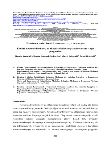 Woźniak Kamila, Ratuszek-Sadowska Dorota, Śniegocki Maciej, Orłowski Paweł. Hematoma vertex treated conservatively - case report = Krwiak nadtwardówkowy na sklepistości leczony zachowawczo - opis przypadku. Journal of Education, Health and Sport. 2015;5(8):265-279. ISSN 2391-8306. DOI 10.5281/zenodo.28242 http://dx.doi.org/10.5281/zenodo.28242 http://ojs.ukw.edu.pl/index.php/johs/article/view/2015%3B5%288%29%3A265-279 https://pbn.nauka.gov.pl/works/608731 POL-index https://pbn.nauka.gov.pl/polindex/browse/article/article-c2eb9917-33cb-4313-abac-e39cb4578d4a Formerly Journal of Health Sciences. ISSN 1429-9623 / 2300-665X. Archives 2011–2014 http://journal.rsw.edu.pl/index.php/JHS/issue/archive Deklaracja. Specyfika i zawartość merytoryczna czasopisma nie ulega zmianie. Zgodnie z informacją MNiSW z dnia 2 czerwca 2014 r., że w roku 2014 nie będzie przeprowadzana ocena czasopism naukowych; czasopismo o zmienionym tytule otrzymuje tyle samo punktów co na wykazie czasopism naukowych z dnia 31 grudnia 2014 r. The journal has had 5 points in Ministry of Science and Higher Education of Poland parametric evaluation. Part B item 1089. (31.12.2014). © The Author (s) 2015; This article is published with open access at Licensee Open Journal Systems of Kazimierz Wielki University in Bydgoszcz, Poland and Radom University in Radom, Poland Open Access. This article is distributed under the terms of the Creative Commons Attribution Noncommercial License which permits any noncommercial use, distribution, and reproduction in any medium, provided the original author(s) and source are credited. This is an open access article licensed under the terms of the Creative Commons Attribution Non Commercial License (http://creativecommons.org/licenses/by-nc/3.0/) which permits unrestricted, non commercial use, distribution and reproduction in any medium, provided the work is properly cited. This is an open access article licensed under the terms of the Creative Commons Attribution Non Commercial License (http://creativecommons.org/licenses/by-nc/3.0/) which permits unrestricted, non commercial use, distribution and reproduction in any medium, provided the work is properly cited. The authors declare that there is no conflict of interests regarding the publication of this paper. Received: 20.06.2015. Revised 20.07.2015. Accepted: 18.08.2015. Hematoma vertex treated conservatively - case report Krwiak nadtwardówkowy na sklepistości leczony zachowawczo - opis przypadku Kamila Woźniak1, Dorota Ratuszek-Sadowska2, Maciej Śniegocki1, Paweł Orłowski3 1. Klinika Neurochirurgii, Neurotraumatologii i Neurochirurgii Dziecięcej, Collegium Medicum im. Ludwika Rydygiera w Bydgoszczy, Uniwersytet Mikołaja Kopernika w Toruniu, Polska Department of Neurosurgery, Neurotraumatology and Pediatric Neurosurgery Collegium Medicum in Bydgoszcz, Nicolaus Copernicus University in Toruń, Poland 2. Katedra i Klinika Rehabilitacji, Collegium Medicum im. Ludwika Rydygiera w Bydgoszczy, Uniwersytet Mikołaja Kopernika w Toruniu, Polska Chair and Department of Rehabilitation Medicine, Collegium Medicum in Bydgoszcz, Nicolaus Copernicus University in Toruń, Poland 3. Katedra i Zakład Laseroterapii i Fizjoterapii, Collegium Medicum im. Ludwika Rydygiera w Bydgoszczy, Uniwersytet Mikołaja Kopernika w Toruniu, Polska Department of Lasertherapy and Physiotherapy, Collegium Medicum in Bydgoszcz, Nicolaus Copernicus University in Toruń, Poland Streszczenie Krwiak nadtwardówkowy na sklepistości (hematoma vertex) jest rzadką, ale dobrze znaną w neurochirurgii jednostką. Najczęściej jest on spowodowany urazem. Obraz kliniczny może być mylący i niespecyficzny. Krwiak nadtwardówkowy na sklepistości stanowi duże wyzwanie zarówno diagnostyczne jak i lecznicze. Diagnostyka obrazowa obejmuje przede wszystkim badanie tomografii komputerowej głowy. Ponad 40% krwiaków nadtwardówkowych nie wymaga interwencji neurochirurgicznej. W literaturze światowej nie ma jednoznacznych wytycznych co do jednoznacznej kwalifikacji chorego z krwiakiem nadtwardówkowym na sklepistości do leczenia operacyjnego. Prezentujemy przypadek 265 kliniczny pacjenta z urazowym krwiakiem nadtwardówkowym na sklepistości (hematoma vertex), który w chwili przyjęcia nie prezentował jakichkolwiek deficytów i innych odchyleń w badaniu neurologicznym. U pacjenta wdrożono postępowanie zachowawcze. Po 6 miesiącach obserwacji krwiak samoistnie wchłonął się. Słowa kluczowe: tomografia komputerowa, krwiak nadtwardówkowy, krwiak na sklepistości. Abstract Epidural hematoma at the convexity (hematoma vertex) is a rare but well known in the neurosurgery unit. Most often it is caused by trauma. The clinical picture can be misleading and non-specific. Epidural hematoma on convexity is a big challenge for both diagnostic and therapeutic. Diagnostic imaging includes primarily computed tomography study. Over 40% of epidural hematomas do not require neurosurgical intervention. In the world literature there is no clear guidance as to uniquely qualified patient with epidural hematoma on the convexity for surgery. We present a case report of a patient with traumatic epidural hematoma on the convexity (hematoma vertex), which at the time of the adoption did not present any deficits and other deviations in neurological examination. The patient was implemented conservative treatment. After 6 months of follow-up hematoma self-absorbed. Key words: coronal computed tomography, hematoma vertex, epidural hematoma. Introduction. Despite the achievements in the field of neurotraumatology the results of treatment of craniocerebral injuries are still not satisfactory. Post-traumatic hematoma as one of the most common secondary craniocerebral injuries often cause permanent disability and death despite carried out urgent diagnosis and implement appropriate neurosurgical procedure. Epidural hematoma is usually caused by bleeding into the epidural blood between the skull an