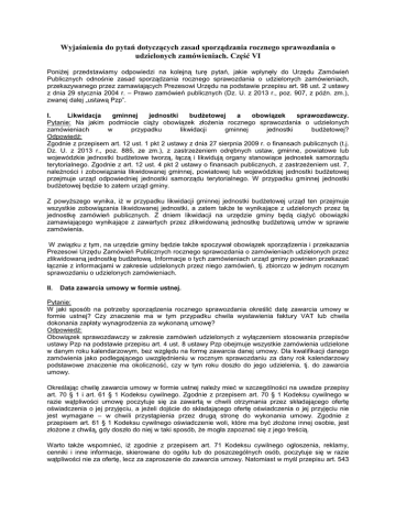Wyjaśnienia do pytań dotyczących zasad sporządzania rocznego sprawozdania o udzielonych zamówieniach. Część VI Poniżej przedstawiamy odpowiedzi na kolejną turę pytań, jakie wpłynęły do Urzędu Zamówień Publicznych odnośnie zasad sporządzania rocznego sprawozdania o udzielonych zamówieniach, przekazywanego przez zamawiających Prezesowi Urzędu na podstawie przepisu art. 98 ust. 2 ustawy z dnia 29 stycznia 2004 r. – Prawo zamówień publicznych (Dz. U. z 2013 r., poz. 907, z późn. zm.), zwanej dalej „ustawą Pzp”. I. Likwidacja gminnej jednostki budżetowej a obowiązek sprawozdawczy. Pytanie: Na jakim podmiocie ciąży obowiązek złożenia rocznego sprawozdania o udzielonych zamówieniach w przypadku likwidacji gminnej jednostki budżetowej? Odpowiedź: Zgodnie z przepisem art. 12 ust. 1 pkt 2 ustawy z dnia 27 sierpnia 2009 r. o finansach publicznych (t.j. Dz. U. z 2013 r., poz. 885, ze zm.), z zastrzeżeniem odrębnych ustaw, gminne, powiatowe lub wojewódzkie jednostki budżetowe tworzą, łączą i likwidują organy stanowiące jednostek samorządu terytorialnego. Zgodnie z art. 12 ust. 4 pkt 2 ustawy o finansach publicznych, z zastrzeżeniem ust. 7, należności i zobowiązania likwidowanej gminnej, powiatowej lub wojewódzkiej jednostki budżetowej przejmuje urząd odpowiedniej jednostki samorządu terytorialnego. W przypadku gminnej jednostki budżetowej będzie to zatem urząd gminy. Z powyższego wynika, iż w przypadku likwidacji gminnej jednostki budżetowej urząd ten przejmuje wszystkie zobowiązania likwidowanej jednostki, a zatem także te wynikające z udzielonych przez tą jednostkę zamówień publicznych. Z dniem likwidacji na urzędzie gminy będą ciążyć obowiązki zamawiającego wynikające z zawartych przez zlikwidowaną jednostkę budżetową umów w sprawie zamówienia. W związku z tym, na urzędzie gminy będzie także spoczywał obowiązek sporządzenia i przekazania Prezesowi Urzędu Zamówień Publicznych rocznego sprawozdania o zamówieniach udzielonych przez zlikwidowaną jednostkę budżetową. Informacje o tych zamówieniach urząd gminy powinien przekazać łącznie z informacjami w zakresie udzielonych przez niego zamówień, tj. zbiorczo w jednym rocznym sprawozdaniu o udzielonych zamówieniach. II. Data zawarcia umowy w formie ustnej. Pytanie: W jaki sposób na potrzeby sporządzenia rocznego sprawozdania określić datę zawarcia umowy w formie ustnej? Czy znaczenie ma w tym przypadku chwila wystawienia faktury VAT lub chwila dokonania zapłaty wynagrodzenia za wykonaną umowę? Odpowiedź: Obowiązek sprawozdawczy w zakresie zamówień udzielonych z wyłączeniem stosowania przepisów ustawy Pzp na podstawie przepisu art. 4 ust. 8 ustawy Pzp obejmuje wszystkie zamówienia udzielone w danym roku kalendarzowym, bez względu na formę zawarcia danej umowy. Dla kwalifikacji danego zamówienia jako podlegającego uwzględnieniu w rocznym sprawozdaniu za dany rok kalendarzowy podstawowe znaczenie ma okoliczność, czy w tym roku doszło do jego udzielenia, tj. do zawarcia umowy. Określając chwilę zawarcia umowy w formie ustnej należy mieć w szczególności na uwadze przepisy art. 70 § 1 i art. 61 § 1 Kodeksu cywilnego. Zgodnie z przepisem art. 70 § 1 Kodeksu cywilnego w razie wątpliwości umowę poczytuje się za zawartą w chwili otrzymania przez składającego ofertę oświadczenia o jej przyjęciu, a jeżeli dojście do składającego ofertę oświadczenia o jej przyjęciu nie jest wymagane – w chwili przystąpienia przez drugą stronę do wykonania umowy. Zgodnie z przepisem art. 61 § 1 Kodeksu cywilnego oświadczenie woli, które ma być złożone innej osobie, jest złożone z chwilą, gdy doszło do niej w taki sposób, że mogła zapoznać się z jego treścią. Warto także wspomnieć, iż zgodnie z przepisem art. 71 Kodeksu cywilnego ogłoszenia, reklamy, cenniki i inne informacje, skierowane do ogółu lub do poszczególnych osób, poczytuje się w razie wątpliwości nie za ofertę, lecz za zaproszenie do zawarcia umowy. Natomiast w myśl przepisu art. 543 Kodeksu cywilnego wystawienie rzeczy w miejscu sprzedaży na widok publiczny z oznaczeniem ceny uważa się za ofertę sprzedaży. W związku z powyższym, w celu kwalifikacji danej umowy jako podlegającej uwzględnieniu w rocznym sprawozdaniu, w przypadku wątpliwości dotyczących daty jej zawarcia, należy kierować się chwilą otrzymania przez składającego ofertę oświadczenia o jej przyjęciu albo chwilą przystąpienia przez drugą stronę do wykonania umowy. Ani chwila wystawienia faktury VAT, ani chwila dokonania zapłaty za świadczenie, nie przesądza o czasie zawarcia danej umowy. Jednakże w praktyce chwila wystawienia faktury VAT czy paragonu, bądź rachunku, może pokrywać się z chwilą zawarcia danej umowy i tym samym mieć znaczenie dla określenia zakresu obowiązku sprawozdawczego za dany rok kalendarzowy. Bez znaczenia dla zakresu informacji przekazywanych w rocznym sprawozdaniu pozostaje chwila zapłaty wynagrodzenia za wykonanie danej umowy. III. Umowy zlecenia zawarte z nauczycielami przez szkołę podstawową. Pytanie: Czy umowy zlecenia zawarte z nauczycielami przez szkołę podstawową w 2013 r. podlegają ujawnieniu w rocznym sprawozdaniu o udzielonych zamówieniach? Odpowiedź: Stosownie do art. 3 ust. 1 pkt 1 ustawy Pzp, ustawę stosuje się do udzielania zamówień publicznych przez jednostki sektora finansów publicznych w rozumieniu przepisów o finansach publicznych. Stosownie do art. 79 ust. 1 ustawy z dnia 7 września 1991 r. o systemie oświaty (Dz. U. z 2004 r. Nr 256, poz. 2572 ze zm.), przedszkola, szkoły i placówki publiczne zakładane i prowadzone przez ministrów i jednostki samorządu terytorialnego są jednostkami budżetowymi. Jednocześnie, zgodnie z art. 9 pkt 3 ustawy z dnia 27 sierpnia 2009 r. o finansach publicznych (Dz. U. z 2013 r., poz. 885 ze zm.) jednostki budżetowe wchodzą w skład 