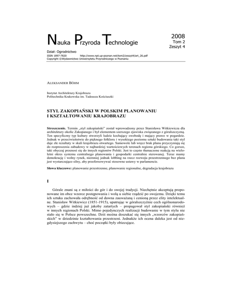 N auka P rzyroda T echnologie 2008 Tom 2 Zeszyt 4 Dział: Ogrodnictwo ISSN 1897-7820 http://www.npt.up-poznan.net/tom2/zeszyt4/art_26.pdf Copyright ©Wydawnictwo Uniwersytetu Przyrodniczego w Poznaniu ALEKSANDER BÖHM Instytut Architektury Krajobrazu Politechnika Krakowska im. Tadeusza Kościuszki STYL ZAKOPIAŃSKI W POLSKIM PLANOWANIU I KSZTAŁTOWANIU KRAJOBRAZU Streszczenie. Termin „styl zakopiański” został wprowadzony przez Stanisława Witkiewicza dla architektury okolic Zakopanego i był elementem szerszego zjawiska związanego z góralszczyzną. Ten specyficzny typ kultury stworzyli ludzie kochający swobodę i mający prawo w pogardzie. Jednak w przeciwieństwie do pięknego folkloru i wysokiego poziomu sztuki budowania taki styl daje złe rezultaty w skali krajobrazu otwartego. Samowole lub wręcz brak planu przyczyniają się do rozproszenia zabudowy w najbardziej wartościowych terenach regionu górskiego. Co gorsze, taki obyczaj przenosi się do innych regionów Polski. Jest to często tłumaczone reakcją na wieloletni okres systemu centralnego planowania i gospodarki centralnie sterowanej. Teraz mamy demokrację i wolny rynek, niemniej jednak lobbing na rzecz rozwoju przestrzennego bez planu jest wystarczająco silny, aby przeforsowywać stosowne ustawy w parlamencie. Słowa kluczowe: planowanie przestrzenne, planowanie regionalne, degradacja krajobrazu I Górale znani są z miłości do gór i do swojej tradycji. Niechętnie akceptują proponowane im obce wzorce postępowania i wolą u siebie rządzić po swojemu. Dzięki temu ich sztuka zachowała odrębność od dawna zauważaną i cenioną przez elity intelektualne. Stanisław Witkiewicz (1851-1915), upatrując w góralszczyźnie cech ogólnonarodowych – gdzie indziej już jakoby zatartych – propagował styl zakopiański również w innych regionach Polski. Mimo pojedynczych realizacji budowanie w tym stylu nie stało się w Polsce powszechne. Dziś można doszukać się innych „wzorców zakopiańskich” w dziedzinie kształtowania przestrzeni. Jednakże ich ocena daleka jest od niegdysiejszego zachwytu – choć początki były obiecujące. 2 Böhm A., 2008. Styl zakopiański w polskim planowaniu i kształtowaniu krajobrazu. Nauka Przyr. Technol. 2, 4, #26. II Jest rzeczą znamienną, że pierwsze nowoczesne inicjatywy dotyczące planowania przestrzennego zawdzięczamy medycynie. W roku 1844 w wyniku raportu higienisty Edwina Chadwicka (1800-1890) wprowadzono w Anglii „An act for regulating the construction and use of building in the metropolis and its neighbourhood”. W Polsce jednym z pierwszych planistów był doktor Tomasz Janiszewski, w latach 1896-1902 lekarz stacji klimatycznej w Zakopanem. Obradujące tam wówczas Towarzystwo Lekarzy Galicyjskich z udziałem przedstawicieli wszystkich trzech zaborów poparło postulaty Janiszewskiego, który domagał się opracowania planu regulacyjnego odpowiadającego potrzebom uzdrowiska w perspektywie 30-40 lat (!). W roku 1897, kiedy gmina podjęła stosowną uchwałę, nie było na ziemiach polskich ani jednego podręcznika na temat planowania przestrzennego, a austriacka „ustawa budownicza dla wsi i pomniejszych miast i miasteczek” ukazała się dwa lata później. Słusznie więc pisał Janiszewski: „Byłem pierwszym... ciągłym poruszaniem tych spraw i tłumaczeniem ich potrzeby doczekałem się zmiany zdania nawet u jednostek, które potrzebę tych wszystkich urządzeń do niedawna negowały” (ŻYCHOŃ 1970). Radość trwała krótko, w roku 1902 doktora Janiszewskiego zwolniono z zajmowanego stanowiska, z całego planu zbudowano tylko jedną ulicę, a Zakopane rozwijało się wzdłuż ulicy Krupówki w sposób karykaturalny. Najwięcej protestów górali wywoływał pomysł stworzenia publicznego parku na Równi Krupowej – po obu stronach nowo wytyczonej ulicy Marszałkowskiej (obecnie Kościuszki). Nie pomogły monity Komisji Klimatycznej, pomoc finansowa Władysława Zamoyskiego ani cykl artykułów pod wspólnym tytułem „Bagno” autorstwa Stanisława Witkiewicza (ŻYCHOŃ 1970). Od roku 1912 nowością w pracach nad rozwojem Zakopanego stały się tzw. wiece i ankiety organizowane przez urzędy. W ich wyniku opracowanie kolejnego planu powierzono doktorowi Mieczysławowi Orłowiczowi. Spośród sformułowanych przez niego tez warto zapamiętać tę myśl: „Zakopanemu należy nadać charakter miasta-ogrodu poprzez odpowiednio rozplanowany rozwój dzielnic peryferyjnych. Natomiast w fatalnie zabudowanym centrum należy zostawić zupełną swobodę, ponieważ dzielnica ta jest nie do uratowania” (ŻYCHOŃ 1970). W tym samym czasie Jan Gwalbert Pawlikowski powołał w łonie Towarzystwa Tatrzańskiego Sekcję Ochrony Tatr. Poniekąd tym sposobem zrealizowały się marzenia Bogusława Królikiewicza, który już w roku 1888, po wizycie w Yellowstone Park, pisał: „Tyle razy przypominają mi się Tatry nasze i mimo woli pytanie się nasuwa, czyli by one – choć na mniejszą skalę – nie mogły być kiedyś takim naszym parkiem narodowym” (KOLBUSZEWSKI 1992). Wybuch I wojny światowej przerwał prace przygotowawcze do konkursu na plan Zakopanego, ale już w 1919 roku zorganizowano drugą „ankietę”, w której wzięło udział ponad 50 urzędów i instytucji. Na tej podstawie w roku 1922 ogłoszono konkurs. W zwycięskiej pracy autorstwa Karola Stryjeńskiego można zauważyć próbę kompromisu między „żywiołem Krupówek” a chęcią planowania uzdrowiska z promenadą zaakcentowaną dwoma placami. Na tej podstawie laureat sporządził w roku 1926 pierwszy prawomocny plan regulacyjny. Dopracowany w nim został sposób zabudowy stoków Gubałówki jako dzielnicy sanatoryjnej, oraz wprowadzono dzielnicę sportową u stóp Krokwi i dzielnicę mieszkaniową pod Antołówką. Zatem zostawiając „stare 3 Böhm A., 2008. Styl zakopiański w polskim planowaniu i kształtowaniu krajobrazu. Nauka Przyr. Technol. 2, 4, #26. Dolne 