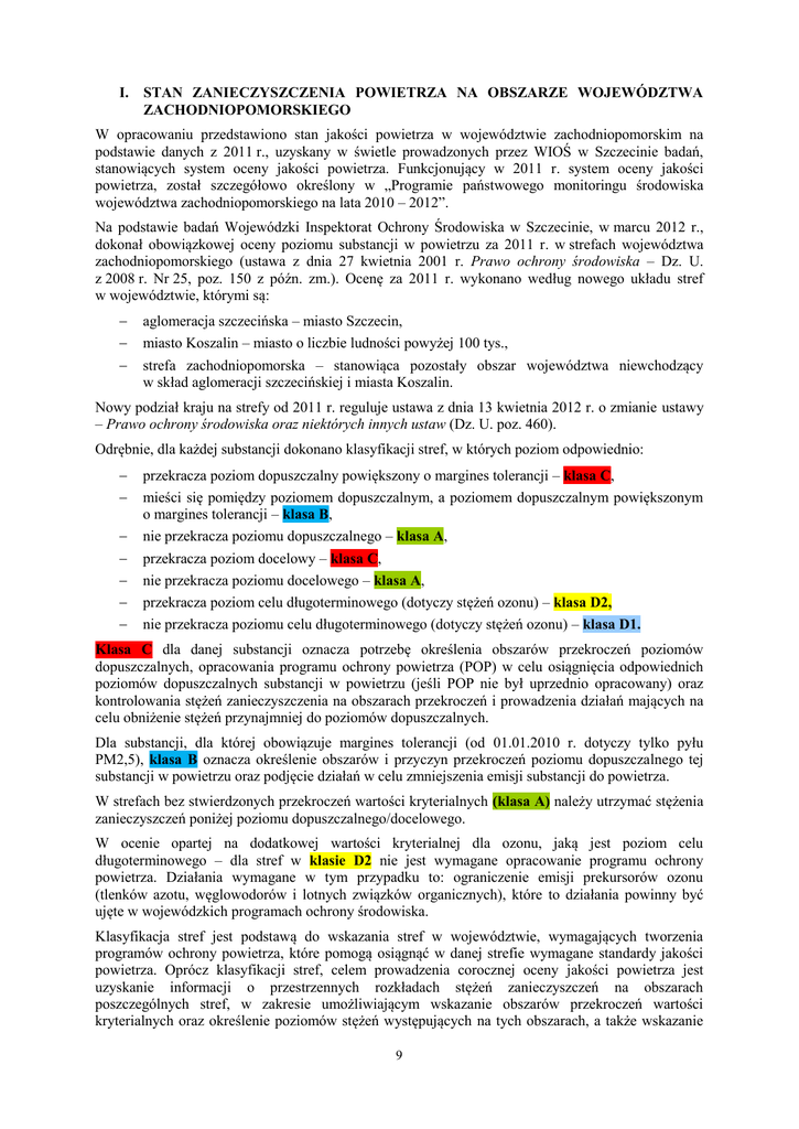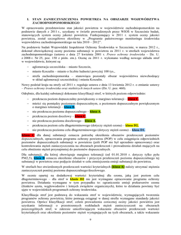 I. STAN ZANIECZYSZCZENIA POWIETRZA NA OBSZARZE WOJEWÓDZTWA ZACHODNIOPOMORSKIEGO W opracowaniu przedstawiono stan jakości powietrza w województwie zachodniopomorskim na podstawie danych z 2011 r., uzyskany w świetle prowadzonych przez WIOŚ w Szczecinie badań, stanowiących system oceny jakości powietrza. Funkcjonujący w 2011 r. system oceny jakości powietrza, został szczegółowo określony w „Programie państwowego monitoringu środowiska województwa zachodniopomorskiego na lata 2010 – 2012”. Na podstawie badań Wojewódzki Inspektorat Ochrony Środowiska w Szczecinie, w marcu 2012 r., dokonał obowiązkowej oceny poziomu substancji w powietrzu za 2011 r. w strefach województwa zachodniopomorskiego (ustawa z dnia 27 kwietnia 2001 r. Prawo ochrony środowiska – Dz. U. z 2008 r. Nr 25, poz. 150 z późn. zm.). Ocenę za 2011 r. wykonano według nowego układu stref w województwie, którymi są: aglomeracja szczecińska – miasto Szczecin, miasto Koszalin – miasto o liczbie ludności powyżej 100 tys., strefa zachodniopomorska – stanowiąca pozostały obszar województwa niewchodzący w skład aglomeracji szczecińskiej i miasta Koszalin. Nowy podział kraju na strefy od 2011 r. reguluje ustawa z dnia 13 kwietnia 2012 r. o zmianie ustawy – Prawo ochrony środowiska oraz niektórych innych ustaw (Dz. U. poz. 460). Odrębnie, dla każdej substancji dokonano klasyfikacji stref, w których poziom odpowiednio: przekracza poziom dopuszczalny powiększony o margines tolerancji – klasa C, mieści się pomiędzy poziomem dopuszczalnym, a poziomem dopuszczalnym powiększonym o margines tolerancji – klasa B, nie przekracza poziomu dopuszczalnego – klasa A, przekracza poziom docelowy – klasa C, nie przekracza poziomu docelowego – klasa A, przekracza poziom celu długoterminowego (dotyczy stężeń ozonu) – klasa D2, nie przekracza poziomu celu długoterminowego (dotyczy stężeń ozonu) – klasa D1. Klasa C dla danej substancji oznacza potrzebę określenia obszarów przekroczeń poziomów dopuszczalnych, opracowania programu ochrony powietrza (POP) w celu osiągnięcia odpowiednich poziomów dopuszczalnych substancji w powietrzu (jeśli POP nie był uprzednio opracowany) oraz kontrolowania stężeń zanieczyszczenia na obszarach przekroczeń i prowadzenia działań mających na celu obniżenie stężeń przynajmniej do poziomów dopuszczalnych. Dla substancji, dla której obowiązuje margines tolerancji (od 01.01.2010 r. dotyczy tylko pyłu PM2,5), klasa B oznacza określenie obszarów i przyczyn przekroczeń poziomu dopuszczalnego tej substancji w powietrzu oraz podjęcie działań w celu zmniejszenia emisji substancji do powietrza. W strefach bez stwierdzonych przekroczeń wartości kryterialnych (klasa A) należy utrzymać stężenia zanieczyszczeń poniżej poziomu dopuszczalnego/docelowego. W ocenie opartej na dodatkowej wartości kryterialnej dla ozonu, jaką jest poziom celu długoterminowego – dla stref w klasie D2 nie jest wymagane opracowanie programu ochrony powietrza. Działania wymagane w tym przypadku to: ograniczenie emisji prekursorów ozonu (tlenków azotu, węglowodorów i lotnych związków organicznych), które to działania powinny być ujęte w wojewódzkich programach ochrony środowiska. Klasyfikacja stref jest podstawą do wskazania stref w województwie, wymagających tworzenia programów ochrony powietrza, które pomogą osiągnąć w danej strefie wymagane standardy jakości powietrza. Oprócz klasyfikacji stref, celem prowadzenia corocznej oceny jakości powietrza jest uzyskanie informacji o przestrzennych rozkładach stężeń zanieczyszczeń na obszarach poszczególnych stref, w zakresie umożliwiającym wskazanie obszarów przekroczeń wartości kryterialnych oraz określenie poziomów stężeń występujących na tych obszarach, a także wskazanie 9 prawdopodobnych przyczyn występowania ponadnormatywnych stężeń. Ponadto, ocena roczna dostarcza informacji na temat braków w istniejącym systemie oceny. W rocznej ocenie jakości powietrza za 2011 r. uwzględniono wszystkie zanieczyszczenia, dla których w świetle przepisów prawa krajowego istnieje obowiązek prowadzenia oceny: według kryteriów określonych ze względu na ochronę zdrowia dla następujących zanieczyszczeń: dwutlenek siarki (SO2), dwutlenek azotu (NO2), tlenek węgla (CO), benzen (C6H6), ozon (O3), pył zawieszony PM10, pył zawieszony PM2,5, ołów (Pb), arsen (As), kadm (Cd), nikiel (Ni) i benzo(a)piren. Ocenie według tych kryteriów podlegały wszystkie 3 strefy województwa; według kryteriów określonych ze względu na ochronę roślin – dla dwutlenku siarki (SO2), tlenków azotu (NOx) oraz ozonu (O3). Ze względu na ochronę roślin ocenie podlegała jedna strefa – strefa zachodniopomorska. Wyniki klasyfikacji stref województwa zachodniopomorskiego za 2011 r. – raport „Roczna ocena jakości powietrza w województwie zachodniopomorskim za 2011 rok wykonana wg zasad określonych w art. 89 ustawy Prawo ochrony środowiska” – WIOŚ w Szczecinie przekazał Marszałkowi Województwa Zachodniopomorskiego w marcu 2012 r. zgodnie z art. 89 ust. 1 i 1a ustawy z dnia 27 kwietnia 2001 r. – Prawo ochrony środowiska (Dz. U. z 2008 r. Nr 25 poz. 150 z późn. zm.). Opracowanie to opublikowano na stronie internetowej WIOŚ w Szczecinie www.wios.szczecin.pl. Oprócz substancji objętych obowiązkową klasyfikacją, dla których obowiązują dopuszczalne i docelowe poziomy substancji w powietrzu w świetle rozporządzenia Ministra Środowiska z dnia 3 marca 2008 r. w sprawie poziomów niektórych substancji w powietrzu (Dz. U. Nr 47, poz. 281) oraz Dyrektywy 2008/50/WE Parlamentu Europejskiego i Rady z dnia 21 maja 2008 r. w sprawie jakości powietrza i czystszego powietrza dla Europy (Dyrektywa CAFE), omówiono też wyniki badań innych substancji – amoniaku (NH3) oraz formaldehydu (HCHO) prowadzonych w 2011 r. w Szczecinku, przy ul. Przemysłow
