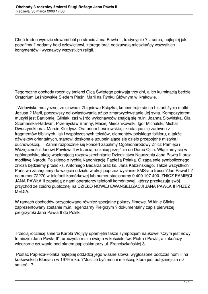Obchody 3 rocznicy śmierci Sługi Bożego Jana Pawła II niedziela, 30 marca 2008 17:06 Choć trudno wyrazić słowami ból po stracie Jana Pawła II, tradycyjnie ? z serca, najlepiej jak potrafimy ? oddamy hołd człowiekowi, którego brak odczuwają mieszkańcy wszystkich kontynentów i wyznawcy wszystkich religii. Tegoroczne obchody rocznicy śmierci Ojca Świętego potrwają trzy dni, a ich kulminacją będzie Oratorium Leśniowskie Siedem Pieśni Marii na Rynku Głównym w Krakowie. Widowisko muzyczne, ze słowami Zbigniewa Książka, koncentruje się na historii życia matki Jezusa ? Marii, począwszy od zwiastowania aż po zmartwychwstanie Jej syna. Kompozytorem muzyki jest Bartłomiej Gliniak, zaś wśród wykonawców znajdą się m.in. Joanna Słowińska, Ola Szomańska-Radwan, Przemysław Branny, Maciej Miecznikowski, Igor Michalski, Michał Dworzyński oraz Marcin Klejdysz. Oratorium Leśniowskie, składające się zarówno z fragmentów biblijnych, jak i współczesnych tekstów, elementów polskiego folkloru, a także dźwięków orientalnych, stanowi doskonale uzupełniające się dzieło przepojone mistyką i duchowością. Zanim rozpocznie się koncert zapalimy Ogólnonarodowy Znicz Pamięci i Wdzięczności Janowi Pawłowi II w trzecią rocznicę przejścia do Domu Ojca. Włączamy się w ogólnopolską akcję wspierającą rozpowszechnianie Dziedzictwa Nauczania Jana Pawła II oraz modlitwę Narodu Polskiego o rychłą Kanonizację Papieża Polaka. O zapalenie symbolicznego znicza będziemy prosić ks. Antoniego Bedarza oraz ks. Jana Kabzińskiego. Także wszystkich Państwa zachęcamy do wzięcia udziału w akcji poprzez wysłanie SMS-a o treści ?Jan Paweł II? na numer 72270 w telefonii komórkowej lub numer stacjonarny 0 400 107 400. ZNICZ PAMIĘCI JANA PAWŁA II zapalają z nami operatorzy telefonii komórkowej, którzy przekazują swój przychód ze zbiórki publicznej na DZIEŁO NOWEJ EWANGELIZACJI JANA PAWŁA II PRZEZ MEDIA. W ramach obchodów przygotowano również specjalne pokazy filmowe. W kinie Sfinks zaprezentowany zostanie m.in. legendarny Pielgrzym ? dokumentalny zapis pierwszej pielgrzymki Jana Pawła II do Polski. Trzecią rocznicę śmierci Karola Wojtyły upamiętni także sympozjum naukowe "Czym jest nowy feminzim Jana Pawła II", uroczysta msza święta w kościele św. Piotra i Pawła, a zakończy wieczorne czuwanie pod oknem papieskim przy ul. Franciszkańskiej 3. Postać Papieża-Polaka najlepiej oddadzą jego własne słowa, wygłoszone podczas homilii na krakowskich Błoniach w 1979 roku: ?Musicie być mocni miłością, która jest potężniejsza niż śmierć...? 1/3 Obchody 3 rocznicy śmierci Sługi Bożego Jana Pawła II niedziela, 30 marca 2008 17:06 ABY ZOBACZYĆ SZCZEGÓŁOWY PROGRAM OBCHODÓW KLIKNIJ W TEN LINK Oratorium Leśniowskie Siedem Pieśni Marii solistki: Joanna Słowińska, Ola Szomańska-Radwan soliści: Przemysław Branny, Maciej Miecznikowski narrator: Igor Michalski dyrygent: Michał Dworzyński koncertmistrz: Marcin Klejdysz przygotowanie chórów: Ewa Robak, Monika Kozak Orkiestra Akademii Beethovenowskiej Chór Instytutu Edukacji Muzycznej Akademii Świętokrzyskiej Chór Kameralny Fermata Krzysztof Trebunia-Tutka ? skrzypce, trombita Mohammad Rasooli ? flet ney Marta Maślanka ? santor i cymbały Jan Slowiński ? lira korbowa autor: Zbigniew Książek kompozytor: Bartłomiej Gliniak Specjalne podziękowania dla Wojciecha Lubawskiego, Prezydenta Miasta Kielce oraz 2/3 Obchody 3 rocznicy śmierci Sługi Bożego Jana Pawła II niedziela, 30 marca 2008 17:06 dla Dyrekcji i zespołu Kieleckiego Centrum Kultury 3/3