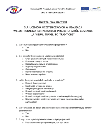 Comenius MP Project „A Visual Travel To Traditions” 2012-1-TR1-COM06-36374 5 ANKIETA EWALUACYJNA DLA UCZNIÓW UCZETSNICZĄCYCH W REALIZACJI WIELOSTRONNEGO PARTNERSKIEGO PROJKETU SZKÓŁ COMENIUS „A VISUAL TRAVEL TO TRADITIONS” 1. Czy byłeś zaangażowany w działania projektowe? o Tak o Nie 2. Co skłoniło Cię do wzięcia udziału w projekcie? o Chęć poznania innych narodowości/ludzi o Poznanie nowych kultur o Kształtowanie języka angielskiego o Wyjazdy zagraniczne o Ciekawość o Nowe doświadczenie w życiu o Namowa nauczyciela 3. Jakie korzyści uzyskałeś z udziału w projekcie? o o o o o o o Rozwój kreatywności Możliwość wyrażenia siebie Integracja w grupie młodzieży Rozwój umiejętności językowych Wyjazd zagraniczny Rozwój umiejętności korzystania z technologii informacyjnej Nawiązywanie i podtrzymywanie przyjaźni z uczniami ze szkół partnerskich 4. Czy uważasz, że dzięki projektowi zdobyłeś wiedzę na temat tradycji państw partnerskich? o Tak o Nie 5. Czego nauczyłeś się/ dowiedziałeś dzięki projektowi? o Poznałem kulturę innych krajów, ich styl życia o Dowiedziałem się, jak żyją inne narodowości o Doświadczyłem wielu nowych wrażeń i przyjemności z udziału w projekcie o Polepszyłem swoje umiejętności językowe 6. Czy biorąc udział w projekcie doświadczyłeś jakiś strat? o Tak o Nie 7. Uczestnicząc w wizycie roboczej w naszej szkole najbardziej podobało Ci się: o Wycieczki o Wieczór karaoke o Zajęcia w szkole o Kolacja pożegnalna 8. Podczas wizyty roboczej w naszej szkole najbardziej nie podobało Ci się: o ………………………………………………………………………………… ………………………………………………………………………………… ………………………………………………………………………………….. 9. Czego zabrakło Ci podczas wizyty roboczej w naszej szkole: o Czasu o Możliwości komunikowania się w języku angielskim o Zajęć w grupach o Inne (jakie?) ………………………………………. 10. Jakie masz inne uwagi na temat organizacji i przebiegu 2.spotkania projektowego w naszej szkole? o ………………………………………………………………………………………………………… ………………………………………………………………………………………………………… ………………………………………………………………………………………………………… Dziękuję za wypełnienie ankiety Magdalena Mosoń Koordynator projektu