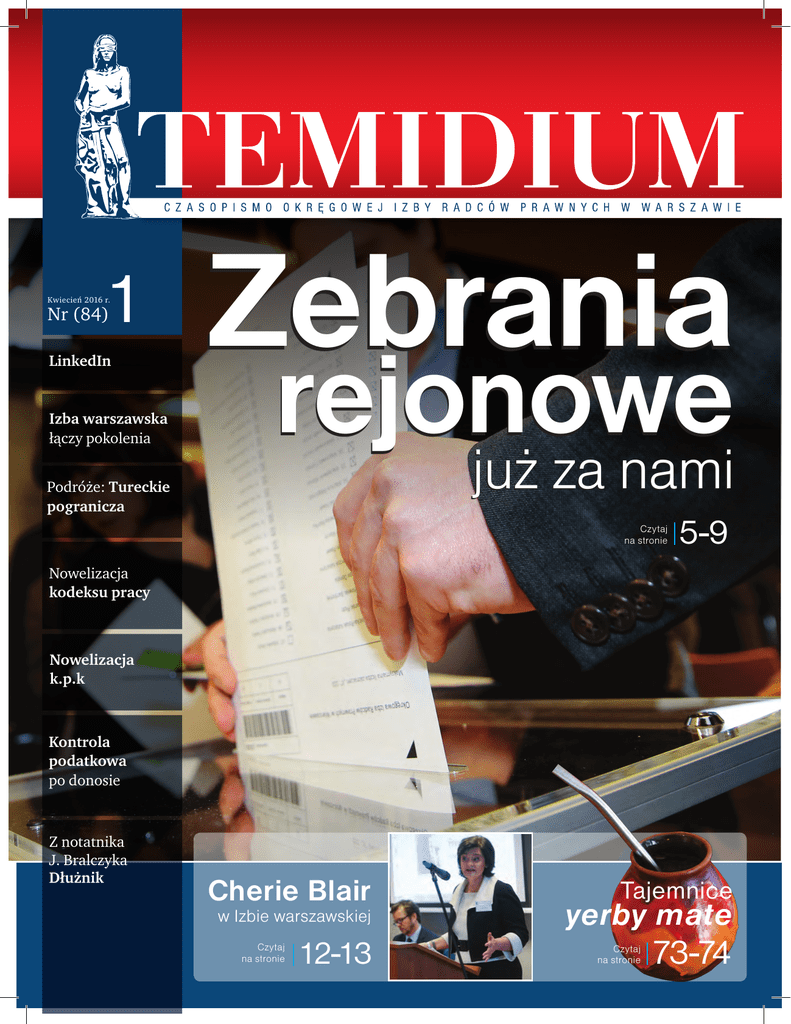 1 Kwiecień 2016 r. Nr (84) LinkedIn Izba warszawska łączy pokolenia Podróże: Tureckie pogranicza Zebrania rejonowe już za nami Czytaj na stronie 5-9 Nowelizacja kodeksu pracy Nowelizacja k.p.k Kontrola podatkowa po donosie Z notatnika J. Bralczyka Dłużnik Cherie Blair w Izbie warszawskiej Czytaj na stronie 12-13 Tajemnice yerby mate Czytaj na stronie 73-74 Felieton Dziekana Kwiecień 2016 r. 2 OKRĘGOWA IZBA RADCÓW PRAWNYCHtemidium Włodzimierz Chróścik Dziekan Rady OIRP w Warszawie ul. Żytnia 15 lok. 16, 01-014 Warszawa tel. 22 862 41 69 (do 71) faks 22 862 41 73 www.oirpwarszawa.pl e-mail: [email protected] Deutsche Bank PBC S.A. Oddział Warszawa nr 21 1910 1123 0250 0267 2121 0001 BIURO CZYNNE poniedziałek–piątek 9.00–17.00 W RADZIE OIRP W WARSZAWIE DYŻURUJĄ: DZIEKAN Rady OIRP Włodzimierz Chróścik wtorki w godz. 16.00–18.00 WICEDZIEKANi Ireneusz Dobrowolski środa w godz. 16.30–17.30 Gerard Madejski środa w godz. 16.00–17.00 SEKRETARZ Jolanta Karpińska czwartek w godz. 16.30–18.30 SKARBNIK Adam Król wtorki w godz. 17.30–18.30 CZŁONEK PREZYDIUM Kinga Wójcicka-Pogorzelec środy w godz. 9.00–10.00 Tomasz Osiński wtorki w godz. 16.30–17.30 Spotkania z członkami Prezydium po wcześniejszym telefonicznym uzgodnieniu z sekretariatem Biura Rady OIRP tel. 22 862 41 69 (do 71) PRZEWODNICZĄCY KOMISJI DS. APLIKACJI Agnieszka Sawaszkiewicz-Żałobka wtorki w godz. 16.00–18.00 RZECZNIK DYSCYPLINARNY dr Tomasz Niedziński poniedziałki w godz. 10.00–12.00 Dyżur mediatora w Biurze OIRP pl. Konstytucji 5 pierwszy poniedziałek miesiąca w godz. 16.00–18.00 Dyżur dla radców prawnych z rejonu Płocka Paweł Kolczyński poniedziałek w godz. 17.00–19.00 Spotkania po wcześniejszym umówieniu się telefonicznym tel. 22 403 33 44 TEMIDIUM 1 (84), Kwiecień 2016 r. Tematyka: problematyka zawodowa radców prawnych Krąg odbiorców: radcowie prawni i aplikanci radcowscy w Warszawie Początek ukazywania się: 1997 r. Nakład 10 700 egz. ISSN 1429-46-13 WYDAWCA Okręgowa Izba Radców Prawnych w Warszawie Redakcja: Redaktor naczelny: Tomasz Osiński Redaktorzy prowadzący: Renata Piątkowska, Zbigniew Romatowski Członkowie Redakcji: Anna Wiśniewska, Ewelina Mika, Tomasz Nawrot Projekt makiety i skład: Pisarczyk.com Skład Prawa i Praktyki: Wydawnictwo Wiedza i Praktyka Sp. z o.o. Marketing i reklama: Anna Andruczyk tel. 503 435 156, e-mail: [email protected] Adres Redakcji: ul. Żytnia 15 lok. 16, 01–014 Warszawa tel. 22 862 41 69 (do 71), wew. 137 faks 22 862 41 73 e-mail: [email protected] Druk: Wydawnictwo Wiedza i Praktyka Sp. z o.o. Nowe wyzwania P od koniec lutego w naszej Izbie odbyły się wybory delegatów na Zgromadzenie. To ważne demokratyczne wydarzenie w samorządzie radców prawnych. Chciałbym serdecznie podziękować wszystkim Koleżankom i Kolegom, którzy w niedzielę 21 lutego przybyli na Stadion Narodowy, aby oddać głos na swoich kandydatów Widzimy, że wymiar sprawiedliwości czekają kolejne zawirowania, nie tylko prawne. Brak zgodności w środowisku, konflikty i nieporozumienia – to wszystko skłania do stwierdzenia, że nasz zawód i nasz samorząd muszą być dobrze przygotowane do obrony status quo. Temu zadaniu mogą sprostać tylko mocni liderzy. Tacy, którzy cieszą się zaufaniem wszystkich radców prawnych oraz dysponują silnym mandatem poszczególnych okręgowych izb. Liczę, że Krajowy Zjazd Radców Prawnych, planowany na listopad tego roku, dokona wyboru Prezesa, którego wiedza, autorytet, doświadczenie samorządowe i uznanie w środowisku oraz wśród przedstawicieli władz będą stanowić rzeczywiste wsparcie dla blisko 40-tysięcznej rzeszy radców prawnych. Zbliżająca się nowa kadencja organów samorządu skłania także do refleksji nad przyszłością Izby warszawskiej. To, co było priorytetem w obecnej kadencji, czyli zasada pragmatycznego zarządzania, nie powinno ulec zmianie. Kierowanie się tą zasadą przy wydatkowaniu środków finansowych pozwalało nam wybierać najlepsze propozycje skierowane do największej liczby odbiorców – członków warszawskiego samorządu. Nadal zamierzamy dbać o najwyższe standardy wykonywania zawodu. Nasz samorząd w ciągu ostatnich pięciu lat powiększył swoje szeregi o 50%. Tylu nowych radców prawnych przybyło na rynku stołecznym i mazowieckim. Dlatego jeszcze bardziej niż dotychczas powinniśmy zwracać uwagę na jakość naszych usług. To najważniejszy wyróżnik profesjonalnych prawników na rynku usług prawnych. Społeczna rola radcy prawnego determinuje potrzebę doskonalenia zawodowego. Podnoszenie kwalifikacji to kwestia naszej odpowiedzialności za przyszłość zawodu i jego profesjonalizm. W kolejnej kadencji, tak jak dotychczas, skupimy się na jak najlepszym dostosowaniu oferty szkoleniowej naszej Izby do wymagań radców prawnych i oczekiwań ich klientów. Czekamy na Państwa sugestie dotyczące tematyki szkoleń. Ten głos jest dla nas zawsze niezwykle cenny. W dalszym ciągu będziemy stawiali na nowe technologie. Będziemy tworzyć kolejne rozwiązania wspomagające budowę przewagi konkurencyjnej radców prawnych. Wyniki wyborów delegatów na Zgromadzenie pokazują, że razem będziemy stawiać czoła wyzwaniom stojącym w kolejnej kadencji przed Okręgową Izbą Radców Prawnych w Warszawie. Mam nadzieję, że nasza Izba nadal będzie przynosić wymierne korzyści swoim członkom i pozostanie miejscem, z którym będą się Państwo identyfikować. Nr 1 (84) Kwiecień 2016 r. Nr 1 (84) temidium 3 temidium W numerze Felieton Dziekana: Nowe wyzwania 2 Przegląd prasy 4 T emat numeru Zebrania rejonowe już za nami 5 P rawo i Praktyka PRAWO PRACY Zmiany w kodeksie pracy dokonane w 2015 r 37 PRAWO CYWILNE Konfuzja długu i wierzytelności w prawie cywilnym 35 PRAWO PODATKOWE Donos jako podstawa wszczęcia kontroli podatkowe 40 ZAMÓWIENIA PUBLICZNE Jednolity Europejski Dokument Zamówienia – nadmierna biurokracja czy ułatwien
