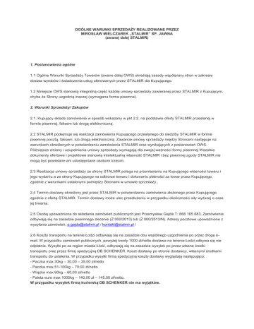 OGÓLNE WARUNKI SPRZEDAŻY REALIZOWANE PRZEZ MIROSŁAW MIELCZAREK „STALMIR” SP. JAWNA (zwanej dalej STALMIR) 1. Postanowienia ogólne 1.1 Ogólne Warunki Sprzedaży Towarów (zwane dalej OWS) określają zasady współpracy stron w zakresie dostaw wyrobów i świadczenia usług oferowanych przez STALMIR dla Kupującego. 1.2 Niniejsze OWS stanowią integralną część każdej umowy sprzedaży zawieranej przez STALMIR z Kupującym, chyba że Strony uzgodnią inaczej (wymagana forma pisemna). 2. Warunki Sprzedaży/ Zakupów 2.1. Kupujący składa zamówienie w sposób wskazany w pkt 2.2. na podstawie oferty STALMIR przesłanej w formie pisemnej, faksem lub drogą elektroniczną. 2.2 STALMIR podejmuje się realizacji zamówienia Kupującego przesłanego do siedziby STALMIR w formie pisemnej pocztą, faksem, lub drogą elektroniczną. Zawarcie umowy sprzedaży między Stronami następuje na warunkach określonych w potwierdzeniu zamówienia STALMIR oraz wynikających z postanowień OWS. Późniejsze zmiany i uzupełnienia umowy sprzedaży wymagają dla swojej ważności formy pisemnej Wszelkie dokumenty ofertowe i projektowe stanowią intelektualną własność STALMIR i bez pisemnej zgody STALMIR nie mogą być powielane ani udostępniane osobom trzecim. 2.3 Realizacja umowy sprzedaży ze strony STALMIR polega na przeniesieniu na Kupującego własności towaru i jego wydaniu a ze strony Kupującego na odbiorze towaru i dokonaniu płatności za towar przez Kupującego, zgodnie z warunkami ustalonymi pomiędzy Stronami w umowie sprzedaży.. 2.4 Termin dostawy określony jest przez STALMIR w potwierdzeniu zamówienia złożonego przez Kupującego zgodnie z ofertą STALMIR. Termin dostawy może ulec przedłużeniu w przypadku okoliczności siły wyższej o czas jej trwania. 2.5 Osobą upoważniona do składania zamówień publicznych jest Przemysław Gajda T: 668 165 683. Zamówienia odbywają się na zasadzie pisemnego zlecenie (Z 000/2013) lub (Z 000/2013/N). Adresy pocztowe upoważnione z wysyłania zamówień; [email protected] / [email protected] / 2.6 Koszty transportu na terenie Łodzi odbywają się na zasadzie obu wspólnego uzgodnienia po przez drogę email. W przypadku zamówień publicznych, powyżej kwoty 1000 zł/netto dostawa na terenie Łodzi odbywa się nie odpłatnie. Wysyłki po za region miasta Łódź, odbywają się na zasadzie wysyłek po przez własne środki transportu oraz przez firmę spedycyjną DB SCHENKER. Koszt dostawy po stronie dostawcy, własnymi środkami transportu do ustalenia. W przypadku wysyłki firmą spedycyjną koszty dostawy wyglądają następująco: - Paczka max 30kg – 30,00 – 35,00 zł/netto - Paczka max 51-100kg – 70,00 zł/netto - Wiązka max 60kg – 60,00 zł/netto - Paleta euro max 1000kg – 140,00 zł – 145,00 zł/netto. W przypadku wysyłek firmą kurierską DB SCHENKER nie ma wyjątków. 3. Cena i płatność 3.1 Cena towaru, wskazana w ofercie i zamówieniu, ustalona jest na bazie OFERTY. 3.2 Cena, powiększona o należny podatek VAT od towarów i usług płatna jest w PLN zgodnie z wystawioną przez STALMIR fakturą. 3.3 Za datę płatności uznaje się datę uznania rachunku bankowego STALMIR. 3.4 Oczywiste pomyłki, błędy drukarskie, maszynowe, rachunkowe nie są dla STALMIR wiążące i nie mogą stanowić podstawy do podnoszenia roszczeń przez Kupującego z jakiegokolwiek tytułu. 3.5 Termin płatności po stronie KUPUJĄCEGO jest oparta na Ofercie Handlowej (OH 000/2013). W przypadku zatwierdzenia OFERTY przez kupującego zgadza się na warunki płatności bez żadnych roszczeń. 3.6 W przypadku przeterminowanych dokumentów sprzedaży, firma STALMIR, wysyła wezwanie do zapłaty. Brak reakcji w ciągu 7 dni roboczych wiąże się z automatycznym przeniesieniem wierzytelności na firmę windykacją, z która to firma STALMIR ma podpisaną umowę współpracy. 3.7 W przypadku nowych klientów, pierwsze trzy dostawy/transakcje będą realizowane na zasadzie przedpłata na konto (faktura PRO-FORMA) lub gotówka przy czym łączna kwota zakupów nie może być niższa niż 3 000zł/netto. W momencie spełnienia w/w warunku, firma, która będzie chciała utrzymać termin płatności będzie weryfikowana przez firmę OBLIGO S.A – w przypadku pozytywnej weryfikacji danych, warunki handlowe będą określane w zwrotnym adresem e-mail. 4. Przejście ryzyka 4.1 Ryzyko przypadkowej utraty lub uszkodzenia towaru przechodzi z chwilą odbioru towaru na Kupującego. 4.2 Jeżeli odbiór towaru opóźnia się na skutek przyczyn, za które odpowiada Kupujący, ryzyko powyższe przechodzi na Kupującego z dniem postawienia towaru przez STALMIR do odbioru przez Kupującego w siedzibie STALMIR lub powierzenia przez STALMIR towaru przewoźnikowi trudniącemu się przewozem towaru w celu wysyłki. 5. Zastrzeżenie prawa własności 5.1 STALMIR zastrzega sobie prawo własności towaru będącego przedmiotem umowy sprzedaży do czasu uiszczenia za ten towar całkowitej zapłaty. 5.2 Prawo własności i związane z nim uprawnienie do żądania wydania towaru, nie wyłącza dochodzenia przez STALMIR roszczeń z tytułu poniesionych strat i/lub utraconych korzyści. 6. Gwarancja i rękojmia(WYKONANIE USŁUG) 6.1 Termin gwarancji wynosi 3 miesiące od daty dostawy towaru. 6.2 Gwarancja dotyczy wad powstałych w szczególności wskutek wadliwej konstrukcji, zastosowania niewłaściwych materiałów i /lub niewłaściwego wykonania. 6.3 Jeżeli w okresie gwarancji ujawnią się wady, STALMIR zobowiązane jest przystąpić do ich usunięcia w terminie 3 dni roboczych od daty otrzymania zawiadomienia o ich ujawnieniu. Odpowiedzialność STALMIR z tytułu gwarancji dotyczy obowiązku naprawy lub wymiany, przy czym wybór w tym względzie należy do STALMIR. W przypadku wymiany, okres gwarancji biegnie na nowo i wynosi 3 miesiące od dnia jej dokonania na cześć wolną od wad. 6.4. Własność wadliwych wymienionych części przysługuje STALMIR. 6