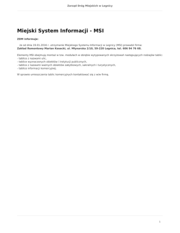 Zarząd Dróg Miejskich w Legnicy Miejski System Informacji - MSI ZDM informuje: że od dnia 19.01.2016 r. utrzymanie Miejskiego Systemu Informacji w Legnicy (MSI) prowadzi firma: Zakład Remontowy Marian Kosecki, ul. Młynarska 2/10, 59-220 Legnica, tel. 606 94 76 68. Elementy MSI obejmują montaż w tzw. modułach w obrębie wytypowanych skrzyżowań następujących rodzajów tablic: - tablice z nazwami ulic, - tablice wyznaczonych obiektów i instytucji publicznych, - tablice z nazwami ważnych obiektów zabytkowych, sakralnych i turystycznych, - tablice informacji komercyjnej. W sprawie umieszczenia tablic komercyjnych kontaktować się z w/w firmą. 1