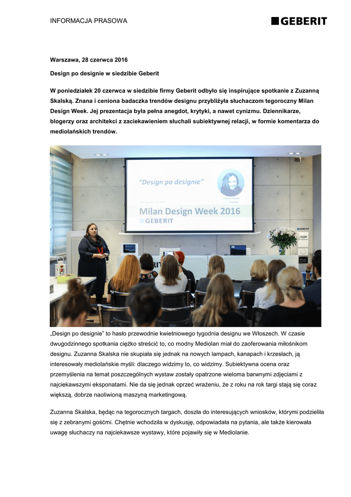 INFORMACJA PRASOWA Warszawa, 28 czerwca 2016 Design po designie w siedzibie Geberit W poniedziałek 20 czerwca w siedzibie firmy Geberit odbyło się inspirujące spotkanie z Zuzanną Skalską. Znana i ceniona badaczka trendów designu przybliżyła słuchaczom tegoroczny Milan Design Week. Jej prezentacja była pełna anegdot, krytyki, a nawet cynizmu. Dziennikarze, blogerzy oraz architekci z zaciekawieniem słuchali subiektywnej relacji, w formie komentarza do mediolańskich trendów. „Design po designie” to hasło przewodnie kwietniowego tygodnia designu we Włoszech. W czasie dwugodzinnego spotkania ciężko streścić to, co modny Mediolan miał do zaoferowania miłośnikom designu. Zuzanna Skalska nie skupiała się jednak na nowych lampach, kanapach i krzesłach, ją interesowały mediolańskie myśli: dlaczego widzimy to, co widzimy. Subiektywna ocena oraz przemyślenia na temat poszczególnych wystaw zostały opatrzone wieloma barwnymi zdjęciami z najciekawszymi eksponatami. Nie da się jednak oprzeć wrażeniu, że z roku na rok targi stają się coraz większą, dobrze naoliwioną maszyną marketingową. Zuzanna Skalska, będąc na tegorocznych targach, doszła do interesujących wniosków, którymi podzieliła się z zebranymi gośćmi. Chętnie wchodziła w dyskusję, odpowiadała na pytania, ale także kierowała uwagę słuchaczy na najciekawsze wystawy, które pojawiły się w Mediolanie. INFORMACJA PRASOWA Co wydarzyło się w Mediolanie? Po 15 latach do Mediolanu powróciła tradycja słynnego Triennale, czyli wielkiej imprezy poświęconej architekturze i designowi. XXI edycja zaskoczyła najbardziej tym, że wyszła poza muzeum sztuki nowoczesnej i tereny targowe, rozpierzchła się aż po 19 miejscach: parkach, pałacach i uczelniach. Do głębszej refleksji zwiedzających skłoniła wystawa „NeoPreistoria”. Sto słów, a każde słowo to jedna rzecz, która na przestrzeni wieków zmieniła nasze życie. I tak w gablotach znalazły się między innymi: strzała, klucz, szkło, telefon komórkowy, wózek sklepowy, rower, komputer, a nawet lekarstwa. Na uwagę zasłużyła także wystawa poświęcona kobietom we włoskim designie. Dostrzeżono fakt, że design na przestrzeni ostatnich lat stał się zdecydowanie sfeminizowany. W Mediolanie ponownie zachwyciła japońska precyzja. Pojawiła się także mocna polska propozycja, która poruszyła temat piękna i pragmatyzmu. Nowym, szokującym pomysłem okazało się wykorzystanie natury przy projektowaniu, ale w bardzo nietypowy sposób: projektowanie drzewa w czasie jego wieloletniego wzrostu tak, by po ścięciu uzyskać np. krzesło. Nie zabrakło też tematów bardzo kontrowersyjnych, jak ubrania z ludzkiej skóry, innowacyjnych, jak drukowanie 3D oraz zaskakujących, jak drewniane auta. Potężne marki też tam były Zuzanna Skalska podkreślała, że warto spojrzeć na każdą wystawę jako na całość. Obecnie ich kuratorzy dbają o to, by był to spektakl zaplanowany od początku do końca. Tydzień designu w Mediolanie to impreza masowa na światowym poziomie. Warto się tam pokazać, by zaprezentować najlepsze i najbardziej innowacyjne osiągnięcia firmy. Wielkie marki to wiedzą i organizują we Włoszech niezwykłe przestrzenie dla zwiedzających, w których pokazuję niezapomniane eksponaty. Nie zabrakło takich brandów, jak: Pepsi, Nike, Yamaha, Lexus, Toyota, Diesel, Bosch, IKEA, a także Geberit. Na minimalistycznym, eleganckim stoisku zaprezentowana została toaleta myjąca Geberit AquaClean Mera, jako innowacyjne rozwiązanie, które wkracza do naszych domów i powoli staje się standardem ułatwiającym życie. 2 INFORMACJA PRASOWA Prezentacja to nie wszystko Obszerna prezentacja pokazująca najciekawsze wystawy tegorocznego Design Week w Mediolanie, to był dopiero początek debaty o „designie po designie”. Dalsze dyskusje i wymiany poglądów toczyły się już poza salą. Z możliwości bezpośredniej rozmowy z Zuzanną Skalską chętnie skorzystali zaproszeni goście, mogli wypytać nie tylko o jej międzynarodowe doświadczenie, ale także o to, w jakim stylu urządzone jest jej prywatne mieszkanie. Również po spotkaniu do dyspozycji dziennikarzy, blogerów oraz architektów pozostali specjaliści marki Geberit, którzy oprowadzili gości po showroomie znajdującym się w siedzibie firmy. W sposób przystępny, ciekawy i szczegółowy opowiadali o produktach Geberit, których działanie można było od razu wypróbować. Informacje o Grupie Geberit Grupa Geberit to europejski lider w produkcji zaawansowanej technologii sanitarnej. Od momentu jej powstania w roku 1874 jest pionierem w tym sektorze, nieprzerwanie ustanawiając nowe trendy swoimi wszechstronnymi rozwiązaniami. Geberit posiada swoje przedstawicielstwa w ponad 40 krajach w Europie i na świecie, skupia w swoich zasobach 35 zakładów produkcyjnych. Największe zakłady znajdują się w Szwajcarii, Niemczech i Austrii. Siedziba główna znajduje się w Rapperswil-Jona w Szwajcarii, a sama firma jest notowana na Szwajcarskiej Giełdzie Papierów Wartościowych w Zurychu od 1999 r. Grupa Geberit wygenerowała sprzedaż w wysokości 2,6 mld franków szwajcarskich zatrudniając ponad 12.000 pracowników. Zakres produktów obejmuje linię systemów sanitarnych (systemy instalacyjne, spłuczki, baterie umywalkowe, systemy spłukiwania, syfony, toalety myjące), wyposażenie łazienek (ceramikę sanitarną, meble łazienkowe, kabiny i wanny) oraz systemy rurowe (systemy wodociągowe i systemy kanalizacyjne). Kontakt dla mediów 38PR & Content Communication Martyna Solińska, Tel. 502 690 101, [email protected] Agnieszka Cieślarek, Tel. 511 666 088, [email protected] 3