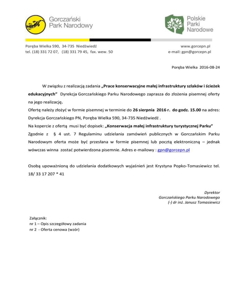 Poręba Wielka 590, 34-735 Niedźwiedź tel. (18) 331 72 07, (18) 331 79 45, fax. wew. 50 www.gorcepn.pl e-mail: [email protected] Poręba Wielka 2016-08-24 W związku z realizacją zadania „Prace konserwacyjne małej infrastruktury szlaków i ścieżek edukacyjnych” Dyrekcja Gorczańskiego Parku Narodowego zaprasza do złożenia pisemnej oferty na jego realizację. Ofertę należy złożyć w formie pisemnej w terminie do 26 sierpnia 2016 r. do godz. 15.00 na adres: Dyrekcja Gorczańskiego PN, Poręba Wielka 590, 34-735 Niedźwiedź . Na kopercie z ofertą musi być dopisek: „Konserwacja małej infrastruktury turystycznej Parku” Zgodnie z § 4 ust. 7 Regulaminu udzielania zamówień publicznych w Gorczańskim Parku Narodowym oferta może być przesłana w formie pisemnej lub pocztą elektroniczną – jednak wówczas winna zostać potwierdzona pisemnie. Adres e-mailowy : [email protected] Osobą upoważnioną do udzielania dodatkowych wyjaśnień jest Krystyna Popko-Tomasiewicz tel. 18/ 33 17 207 * 41 Dyrektor Gorczańskiego Parku Narodowego (-) dr inż. Janusz Tomasiewicz Załącznik: nr 1 – Opis szczegółowy zadania nr 2 - Oferta cenowa (wzór)
