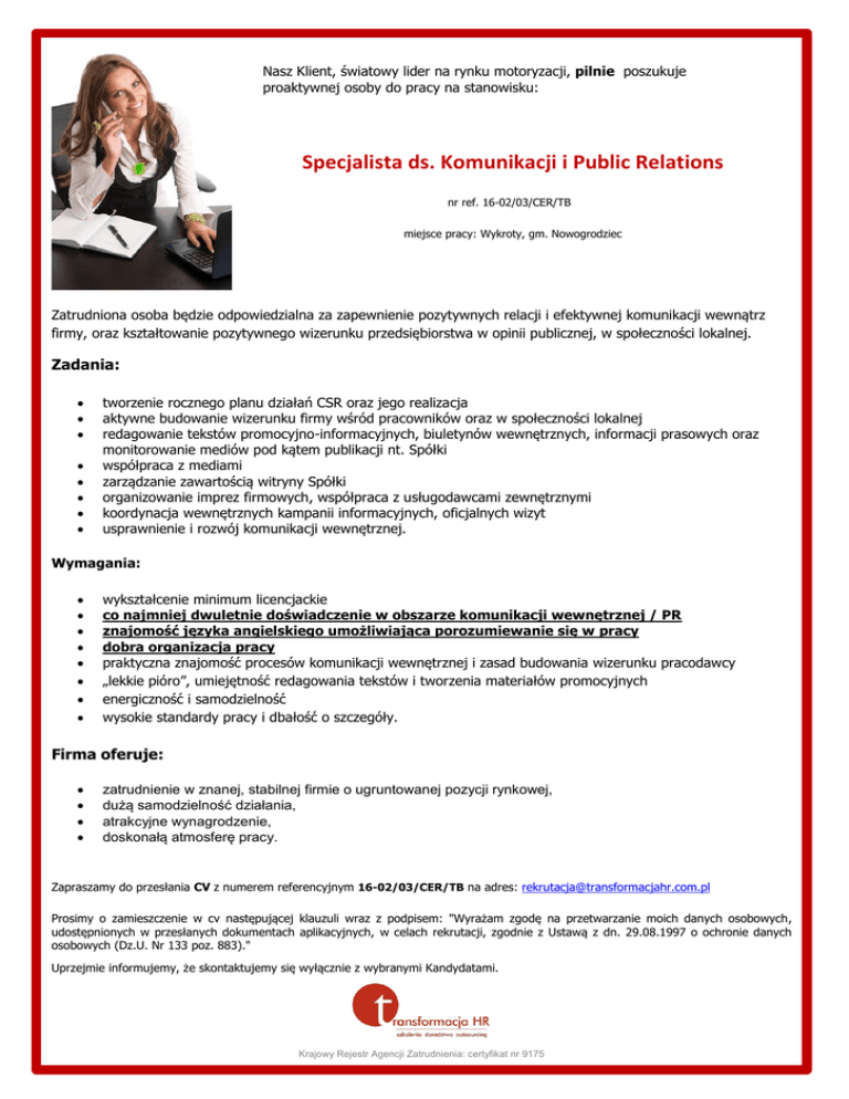 Nasz Klient, światowy lider na rynku motoryzacji, pilnie poszukuje proaktywnej osoby do pracy na stanowisku: Specjalista ds. Komunikacji i Public Relations nr ref. 16-02/03/CER/TB miejsce pracy: Wykroty, gm. Nowogrodziec Zatrudniona osoba będzie odpowiedzialna za zapewnienie pozytywnych relacji i efektywnej komunikacji wewnątrz firmy, oraz kształtowanie pozytywnego wizerunku przedsiębiorstwa w opinii publicznej, w społeczności lokalnej. Zadania: tworzenie rocznego planu działań CSR oraz jego realizacja aktywne budowanie wizerunku firmy wśród pracowników oraz w społeczności lokalnej redagowanie tekstów promocyjno-informacyjnych, biuletynów wewnętrznych, informacji prasowych oraz monitorowanie mediów pod kątem publikacji nt. Spółki współpraca z mediami zarządzanie zawartością witryny Spółki organizowanie imprez firmowych, współpraca z usługodawcami zewnętrznymi koordynacja wewnętrznych kampanii informacyjnych, oficjalnych wizyt usprawnienie i rozwój komunikacji wewnętrznej. Wymagania: wykształcenie minimum licencjackie co najmniej dwuletnie doświadczenie w obszarze komunikacji wewnętrznej / PR znajomość języka angielskiego umożliwiająca porozumiewanie się w pracy dobra organizacja pracy praktyczna znajomość procesów komunikacji wewnętrznej i zasad budowania wizerunku pracodawcy „lekkie pióro”, umiejętność redagowania tekstów i tworzenia materiałów promocyjnych energiczność i samodzielność wysokie standardy pracy i dbałość o szczegóły. Firma oferuje: zatrudnienie w znanej, stabilnej firmie o ugruntowanej pozycji rynkowej, dużą samodzielność działania, atrakcyjne wynagrodzenie, doskonałą atmosferę pracy. Zapraszamy do przesłania CV z numerem referencyjnym 16-02/03/CER/TB na adres: [email protected] Prosimy o zamieszczenie w cv następującej klauzuli wraz z podpisem: "Wyrażam zgodę na przetwarzanie moich danych osobowych, udostępnionych w przesłanych dokumentach aplikacyjnych, w celach rekrutacji, zgodnie z Ustawą z dn. 29.08.1997 o ochronie danych osobowych (Dz.U. Nr 133 poz. 883)." Uprzejmie informujemy, że skontaktujemy się wyłącznie z wybranymi Kandydatami. Krajowy Rejestr Agencji Zatrudnienia: certyfikat nr 9175