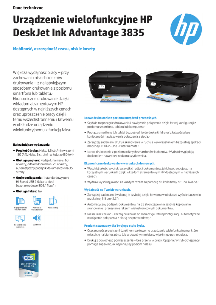 Dane techniczne Urządzenie wielofunkcyjne HP DeskJet Ink Advantage 3835 Mobilność, oszczędność czasu, niskie koszty Większa wydajność pracy – przy zachowaniu niskich kosztów drukowania – z najłatwiejszym sposobem drukowania z poziomu smartfona lub tabletu. Ekonomiczne drukowanie dzięki wkładom atramentowym HP dostępnych w najniższych cenach oraz uproszczenie pracy dzięki temu wszechstronnemu i łatwemu w obsłudze urządzeniu wielofunkcyjnemu z funkcją faksu. 1 Łatwe drukowanie z poziomu urządzeń przenośnych. ● Szybkie rozpoczęcie drukowania i nawiązanie połączenia dzięki łatwej konfiguracji z poziomu smartfona, tabletu lub komputera.2 ● Podłącz smartfona lub tablet bezpośrednio do drukarki i drukuj z łatwością bez konieczności nawiązywania połączenia z siecią.3 Najważniejsze wydarzenia ● Prędkość druku: Maks. 8,5 str./min w czerni ISO (A4); Maks. 6 str./min w kolorze ISO (A4) ● Obsługa papieru: Podajnik na maks. 60 arkuszy, odbiornik na maks. 25 arkuszy, automatyczny podajnik dokumentów na 35 strony ● Opcje podłączania: 1 standardowy port Hi-Speed USB 2.0; karta sieci bezprzewodowej 802.11b/g/n ● Obsługa faksu: Tak ● Zarządzaj zadaniami druku i skanowania w ruchu z wykorzystaniem bezpłatnej aplikacji mobilnej HP All-in-One Printer Remote.4 ● Łatwe drukowanie z poziomu różnych smartfonów i tabletów.1 Wydruki wyglądają doskonale – nawet bez nadzoru użytkownika. Ekonomiczne drukowanie w warunkach domowych. ● Wysokiej jakości wydruki wszystkich zdjęć i dokumentów, jakich potrzebujesz, na korzystnych warunkach dzięki wkładom atramentowym HP dostępnym w najniższych cenach. ● Wydruki wysokiej jakości za każdym razem za pomocą drukarki firmy nr 1 na świecie.5 Wydajność na Twoich warunkach. ● Zarządzaj zadaniami i wykonuj je szybciej dzięki łatwemu w obsłudze wyświetlaczowi o przekątnej 5,5 cm (2,2"). ● Automatyczny podajnik dokumentów na 35 stron zapewnia szybkie kopiowanie, skanowanie i przesyłanie faksem wielostronicowych dokumentów. ● Nie musisz czekać – zacznij drukować od razu dzięki łatwej konfiguracji. Automatyczne nawiązanie połączenia z siecią bezprzewodową.6 Produkt stworzony dla Twojego stylu życia. ● Oszczędność przestrzeni dzięki kompaktowemu urządzeniu wielofunkcyjnemu, które mieści się na biurku, półce lub w dowolnym miejscu, w jakim go potrzebujesz. ● Drukuj z dowolnego pomieszczenia – bez przerw w pracy. Opcjonalny tryb cichej pracy pomaga zapewnić jak najmniejszy poziom hałasu. Urządzenie wielofunkcyjne HP DeskJet Ink Advantage 3835 Dane techniczne Funkcje Drukowanie, kopiowanie, skanowanie, łączność bezprzewodowa, faks Prędkość druku Do 8,5 str./min ISO w czerni (A4); Do 6 str./min ISO w kolorze (A4) Rozdzielczość druku Rozdzielczość do 1200 x 1200 dpi W czerni; Rozdzielczość optymalizowana do 4800x1200 dpi (przy druku w kolorze z komputera na wybranych papierach fotograficznych HP, rozdzielczość wejściowa 1200 dpi) Technologia druku Technologia termiczna HP Inkjet Obszar drukowania Marginesy wydruku: Górny: 3 mm; Dolny: 3 mm; Lewy: 3 mm; Prawy: 3 mm; Maksymalny obszar zadruku: 215 x 355 mm Języki drukowania HP PCL 3 GUI; PCLm (aplikacje HP/UPD); URF (AirPrint) Możliwości drukarki Druk bez marginesów: Tak Liczba wkładów drukujących 2 (1 czarny, 1 trójkolorowy) Możliwość druku mobilnego HP ePrint; Apple AirPrint™; Wireless Direct Printing Normatywny miesięczny cykl pracy Do 1000 stron (A4); Zalecana ilość stron drukowanych miesięcznie: Od 100 do 300 Czujnik automatycznego wykrywania rodzaju papieru Tak Szybkość procesora 180 MHz Wyświetlacz Monochromatyczny wyświetlacz dotykowy o przekątnej 5,5 cm (2,2") Obsługiwana wielozadaniowość Brak Możliwość pracy bezprzewodowej Tak, wbudowany interfejs Wi-Fi 802.11b/g/n Sieci i łączność Standardowo 1 port Hi-Speed USB 2.0 Możliwości pracy w sieci Tak, przez wbudowany moduł bezprzewodowy 802.11b/g/n Pamięć Standardowo 512 MB pamięci DDR1, 128 MB pamięci Flash; maksymalnie 512 MB pamięci DDR1, 128 MB pamięci Flash Cechy inteligentnego oprogramowania drukarki Manualny druk dwustronny Ustawienia kopiarki Dopasowanie do strony/rzeczywiste/niestandardowe; Rozdzielczość kopiowania: Maks. 600x300 dpi; Rozdzielczość kopiowania, kolorowy tekst i grafika: Maks. 600x300 dpi; Skala zmiany rozmiarów w kopiarce: 25 do 400% Prędkość kopiowania Do 7 kopii/min czarny ISO (A4), Maks. 3,5 kopii/min kolorowy ISO (A4) Dane techniczne skanera Typ skanera: Skaner płaski, automatyczny podajnik dokumentów; Technologia skanowania: Czujnik Contact Image Sensor (CIS); Tryby skanowania: Skanowanie, kopiowanie i faksowanie z poziomu przedniego panelu; Wersja sterownika Twain: Wersja 1.9; Maks. format skanowania (płaski skaner, ADF): 216 x 297 mm; Rozdzielczość optyczna skanowania: Do 1200 dpi Format pliku skanowania PDF, BMP, JPG, GIF, TIF, PNG Powierzchnia skanowalna maksymalny wymiar mediów: 216 x 297 mm Głębia bitowa/poziomy skali szarości 24-bitowa/ 256 cyfrowe wysyłanie Standardowo: Skanowanie do komputera Faksowanie Tak, kolor Specyfikacje faksowania Pamięć faksu: Do 99 stron (w czerni); Rozdzielczość faksu: Standardowo: 203 x 98 dpi; Najwyższa: 203 x 196 dpi; szykość faksu: 4 sek. na stronę typy papieru Papier zwykły, papier fotograficzny, papier broszurowy, koperty i inne specjalistyczne papiery do drukarek atramentowych rozmiary nośników wspierany A4; B5; A6; Koperta DL obsługa nośników Pojemność podajników: Do 60 ark.; Do 20 arkuszy Karty; Do 20 arkuszy papier fotograficzny Pojemność wyjściowa: Do 25 ark., Do 20 kart, Do 20 arkuszy papier fotograficzny Drukowanie dwustronne: Ręczny (z obsługą przez sterownik) ADF: Standardowo 35 arkuszy Gramatura papieru wspierany: A4: Od 60 do 90 g/m²; Koperty HP: Od 75 do 90 g/m²; Karty HP: do 200 g/m²; Papier fotograficzny HP 10 x 15 cm: do 300 g/m²; Zalecane: 75 g/m² Zawartoś