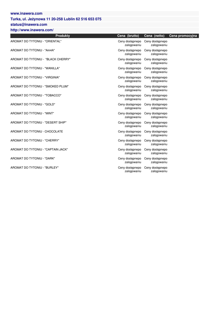 www.inawera.com Turka, ul. Jeżynowa 11 20-258 Lublin 62 516 653 075 [email protected] http://www.inawera.com/ Cena (brutto) Cena (netto) AROMAT DO TYTONIU - "ORIENTAL" Produkty Ceny dostępnepo zalogowaniu Ceny dostępnepo zalogowaniu AROMAT DO TYTONIU - "Am4A" Ceny dostępnepo zalogowaniu Ceny dostępnepo zalogowaniu AROMAT DO TYTONIU - "BLACK CHERRY" Ceny dostępnepo zalogowaniu Ceny dostępnepo zalogowaniu AROMAT DO TYTONIU - "WANILLA" Ceny dostępnepo zalogowaniu Ceny dostępnepo zalogowaniu AROMAT DO TYTONIU - "VIRGINIA" Ceny dostępnepo zalogowaniu Ceny dostępnepo zalogowaniu AROMAT DO TYTONIU - "SMOKED PLUM" Ceny dostępnepo zalogowaniu Ceny dostępnepo zalogowaniu AROMAT DO TYTONIU - "TOBACCO" Ceny dostępnepo zalogowaniu Ceny dostępnepo zalogowaniu AROMAT DO TYTONIU - "GOLD" Ceny dostępnepo zalogowaniu Ceny dostępnepo zalogowaniu AROMAT DO TYTONIU - "MINT" Ceny dostępnepo zalogowaniu Ceny dostępnepo zalogowaniu AROMAT DO TYTONIU - "DESERT SHIP" Ceny dostępnepo zalogowaniu Ceny dostępnepo zalogowaniu AROMAT DO TYTONIU - CHOCOLATE Ceny dostępnepo zalogowaniu Ceny dostępnepo zalogowaniu AROMAT DO TYTONIU - "CHERRY" Ceny dostępnepo zalogowaniu Ceny dostępnepo zalogowaniu AROMAT DO TYTONIU - "CAPTAIN JACK" Ceny dostępnepo zalogowaniu Ceny dostępnepo zalogowaniu AROMAT DO TYTONIU - "DARK" Ceny dostępnepo zalogowaniu Ceny dostępnepo zalogowaniu AROMAT DO TYTONIU - "BURLEY" Ceny dostępnepo zalogowaniu Ceny dostępnepo zalogowaniu Cena promocyjna