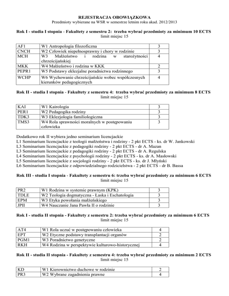 REJESTRACJA OBOWIĄZKOWA Przedmioty wybierane na WSR w semestrze letnim roku akad. 2012/2013 Rok I - studia I stopnia - Fakultety z semestru 2: trzeba wybrać przedmioty za minimum 10 ECTS limit miejsc 15 AF1 CNCH MCH MKK PEPR1 WCHP W1 Antropologia filozoficzna W2 Człowiek niepełnosprawny i chory w rodzinie W3 MałŜeństwo i rodzina w staroŜytności chrześcijańskiej W4 MałŜeństwo i rodzina w KKK W5 Podstawy eklezjalne poradnictwa rodzinnego W6 Wychowanie chrześcijańskie wobec współczesnych kierunków pedagogicznych 3 3 4 2 3 4 Rok II - studia I stopnia - Fakultety z semestru 4: trzeba wybrać przedmioty za minimum 8 ECTS limit miejsc 15 KAI PER1 TDK3 TMS3 W1 Kairologia W2 Pedagogika rodziny W3 Eklezjologia familiologiczna W4 Rola sprawności moralnych w postępowaniu człowieka 3 3 3 3 Dodatkowo rok II wybiera jedno seminarium licencjackie L1 Seminarium licencjackie z teologii małŜeństwa i rodziny - 2 pkt ECTS - ks. dr W. Jankowski L3 Seminarium licencjackie z pedagogiki rodziny - 2 pkt ECTS - dr A. Mazan L3 Seminarium licencjackie z pedagogiki rodziny - 2 pkt ECTS - dr A. Regulska L4 Seminarium licencjackie z psychologii rodziny - 2 pkt ECTS - ks. dr A. Masłowski L5 Seminarium licencjackie z socjologii rodziny - 2 pkt ECTS - ks. dr J. Młyński L6 Seminarium licencjackie z odpowiedzialnego rodzicielstwa - 2 pkt ECTS - dr B. Bassa Rok III - studia I stopnia - Fakultety z semestru 6: trzeba wybrać przedmioty za minimum 6 ECTS limit miejsc 15 PR2 TDLE EPM JPII W1 Rodzina w systemie prawnym (KPK) W2 Teologia dogmatyczna - Łaska i Eschatologia W3 Etyka powołania małŜeńskiego W4 Nauczanie Jana Pawła II o rodzinie 3 3 3 3 Rok I - studia II stopnia - Fakultety z semestru 2: trzeba wybrać przedmioty za minimum 6 ECTS limit miejsc 15 AT4 EPT PGM1 RKH W1 Rola uczuć w postępowaniu człowieka W2 Etyczne podstawy transplantacji organów W3 Poradnictwo genetyczne W4 Rodzina w perspektywie kulturowo-historycznej 4 2 2 4 Rok II - studia II stopnia - Fakultety z semestru 4: trzeba wybrać przedmioty za minimum 2 ECTS limit miejsc 15 KD PR3 W1 Kierownictwo duchowe w rodzinie W2 Wybrane zagadnienia prawne 2 4