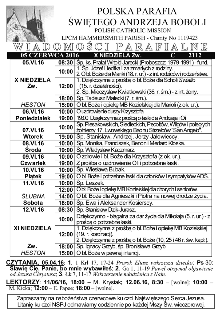 POLSKA PARAFIA ŚWIĘTEGO ANDRZEJA BOBOLI POLISH CATHOLIC MISSION LPCM HAMMERSMITH PARISH - Charity No 1119423 05 CZERWCA 2016 05.VI.16 X NIEDZIELA Zw. HESTON 06.VI.16 Poniedziałek 07.VI.16 Wtorek 08.VI.16 Środa 09.VI.16 Czwartek 10.VI.16 Piątek 11.VI.16 ŚLUBNA Sobota 12.VI.16 XI NIEDZIELA Zw. HESTON X NIEDZIELA Zw. C 2112 08:30 Śp. ks. Prałat Witold Jarecki (Proboszcz: 1979-1991) - fund. 1. Śp. Józef Liedtka i za zmarłych z rodziny. 10:00 2. O bł. Boże dla Mariki (18. r. ur.) - z int. rodziców i rodzeństwa. 1. Dziękczynna z prośbą o bł. Boże dla Scholi Światło 12:00 (15. r. działalności). 2. Śp. Mieczysław Kwiatkowski (36. r. śm.) - z int. żony. 18:00 Śp. Tadeusz Malecki (7. r. śm.). 15:00 O bł. Boże i opiekę MB Kozielskiej dla Marioli (z ok. ur.). 10:00 O uzdrowienie duszy Krzysztofa 19:00 19:00 Dziękczynna z prośbą o łaski dla Andrzeja i Oli Śp. Piesakowskich, Siedleckich, Pecoltów, Wilgów i poległych 10:00 żołnierzy 17. Lwowskiego Baonu Strzelców "San Angelo". 19:00 Śp. Stanisław, Andrzej, Jerzy Jałowieccy. 10:00 Śp. Monika, Franciszek, Benon i Medard Kloska. 19:00 Śp. Władysław Kaczmarz. 10:00 O zdrowie i bł. Boże dla Krzysztofa (z ok. ur.). 19:00 Z prośba o uzdrowienie Oli i potrzebne łaski. 10:00 Śp. Wiesława Bubak. 19:00 O bł. Boże i potrzebne łaski dla członków i sympatyków ADŚ. 10:00 Śp. Leszek. 12:00 O bł. Boże i opiekę MB Kozielskiej dla chorych i seniorów. 14:00 O bł. Boże dla Agnieszki i Piotra na nowej drodze życia. 18:00 Śp. Ewa i Aleksander Kosierscy. 08:30 Śp. Stanisław Dzik-Jurasz. - błagalna za dar życia dla Mikołaja (5. r. ur.) - z 10:00 Dziękczynno prośbą o potrzebne łaski. 1. Dziękczynna z prośbą o bł. Boże i opiekę MB Kozielskiej 12:00 (19. r. koronacji). 2. Dziękczynna z prośbą o bł. Boże (10, 25 i 46 r. św. kapł.). 18:00 Śp. Ignacy Grzyb, śp. Bronisława Grzyb 15:00 O bł. Boże w pewnej intencji. CZYTANIA, 05.04.16: 1. 1 Krl 17, 17-24 Prorok Eliasz wskrzesza dziecko; Ps 30: Sławię Cię, Panie, bo mnie wybawiłeś; 2. Ga 1, 11-19 Paweł otrzymał objawienie od Jezusa Chrystusa; 3. Łk 7, 11-17 Wskrzeszenie młodzieńca z Nain. LEKTORZY: 11/06/16, 18:00 – M. Krysiak; 12.06.16, 8:30 – [wolne]; 10:00 – M. Kicka; 12:00 – E. Papee; 18:00 – [wolne]. Zapraszamy na nabożeństwa czerwcowe ku czci Najświętszego Serca Jezusa. Litanię ku czci NSPJ odmawiamy codziennie po każdej Mszy Św. wieczorowej. NIEDZIELA 05 CZERWCA 2016 - I Niedziela M-ca 09:00-13:30: Zapraszamy do kawiarni. 11:00 i 13:15, kaplica MB: zmiana tajemnic różańcowych 12:00, kościół: Msza i rozpoczęcie obchodów 15-Lecia działalności Scholi „Światło”. Rodzice Scholowi zapraszają do kawiarni. 17:30, kościół: nabożeństwo czerwcowe. PONIEDZIAŁEK 06 CZERWCA 2016 20:00, sala św. Józefa: Spotkanie Mężczyzn św. Józefa. WTOREK 07 CZERWCA 2016 12:00, sala św. Józefa: „Złote Rybki” czyli spotkanie mam/opiekunów i małych dzieci. 20:00, salka: Spotkanie polskiej grupy AA (Basement, 18 Greenside Road, W12). ŚRODA 08 CZERWCA 2016 11:00, kawiarnia: Spotkanie Klubu Brydżowego. 18:30, sala św. Józefa: próba Scholi ŚWIATŁO CZWARTEK 09 CZERWCA 2016 12:00, sala św. Józefa: „Złote Rybki” czyli spotkanie mam/opiekunów i małych dzieci. 12:00-16:00, kościół: spotkanie kapłanów dekanatu Londyn Płn 18:30, kościół, Różaniec misyjny (zaprasza Gr. Misyjna). 20:00-21:00, kościół: adoracja Najśw. Sakramentu. 20:00: Spotkanie WŻCh (salka) i Spotkanie GALILEI kawiarnia): PIĄTEK 10 CZERWCA 2016 10:30, kaplica B.Mił.: Koronka do Miłosierdzia Bożego. 18:00, sala św. Józefa: zbiórka młodszych ministrantów. 18:30, kaplica MB: różaniec, Msza i katecheza dla ADŚ. 20:00, kawiarnia: Grupa Wielbienia. SOBOTA 11 CZERWCA 2016 12.00-15.00, kościół + kawiarnia: Spotkanie chorych i Seniorów parafii. 17.00, kaplica MB: katecheza chrzcielna dla rodziców na sierpień 2015. 19:00, sala św. Józefa: zbiórka starszych ministrantów. 20:30, kawiarnia: Eucharystia dla Neokatechumenatu. NIEDZIELA 12 CZERWCA 2016 09:00-13:30: Zapraszamy do kawiarni. 12:00, kościół: Msza i obchody 19 rocznicy Koronacji Obrazu MB Kozielskiej, oraz 10, 25 i 46 rocznica święceń kapłańskich. 13:15, kościół: koncert zespołu TURLIKI z Zakopanego „Ku czci Maryi” 17:30, kościół: nabożeństwo czerwcowe. 13.06.16, kawiarnia, 20.00: Spotkanie Lektorów. 14, 16, 21, 23 i 28.06.16, 10:00 – 12:00, sala św. Józefa: „Złote Rybki” czyli spotkanie mam/opiekunów i małych dzieci. 14, 21 i 28.06.16, 20:00, salka (Basement, 18 Greenside Road, W12): Spotkanie polskiej grupy AA. 15, 22 i 29.06.16, 11:00, kawiarnia: Spotkanie Klubu Brydżowego. 15 i 22 i 29.06.16, 18:30sala św. Józefa: próba Scholi ŚWIATŁO. 16, 23 i 30.06.16, 20:00, salka: Spotkania WŻCh. 16, 23 i 30.06.16, 20:00, kawiarnia: Spotkania GALILEI. 16, 23 i 30.06.16, 19:30-21:00, kaplica MB: adoracja Najśw. Sakramentu. 16.06.16, 18:30, kaplica MB, Różaniec za kapłanów. 17.06.16, 20.00: Spotkanie RCS dla młodzieży (konferencyjna) i dorosłych (salka). 17 i 24.06.16, 10:30, kościół: Koronka do Miłosierdzia Bożego. 17 i 24.06.16, 20:00, kawiarnia: Grupa Wielbienia. 18.06.16, 17.00-22:00, kościół: X FESTIWAL PIOSENKI RELIGIJNEJ. 18 i 25.06.16, 20:30, kawiarnia: Eucharystia dla Neokatechumenatu. 19 i 26.06.16, 10:15, sala św. Józefa + kościół: próba Scholi ”Światło” i udział we Mszy. 19.06.16, 14:00-19:00, kościół: I FESTIWAL WIELBIENIA (zob. FESTIWALE). 20.06.16, sala św. Józefa, 20.00: Spotkanie Mężczyzn św. Józefa. 20.06.16, 20:00, „PATIO”: Spotkanie Rady Administracyjnej. 21.06-26.07.16: ks. Marek na urlopie. 23.06.16, 18:30, kościół, Różaniec misyjny (zaprasza Gr. Misyjna). 24.06.16, 20:00, salka: spotkanie dla członków Spotkań Małżeńskich. 24.06.16: UR. NARODZENIA ŚW. JANA CHRZCICIELA. 25.06.16, 19:00, kawiarnia: Spotkanie dla SINGLI. 26.06.16, kościół: os