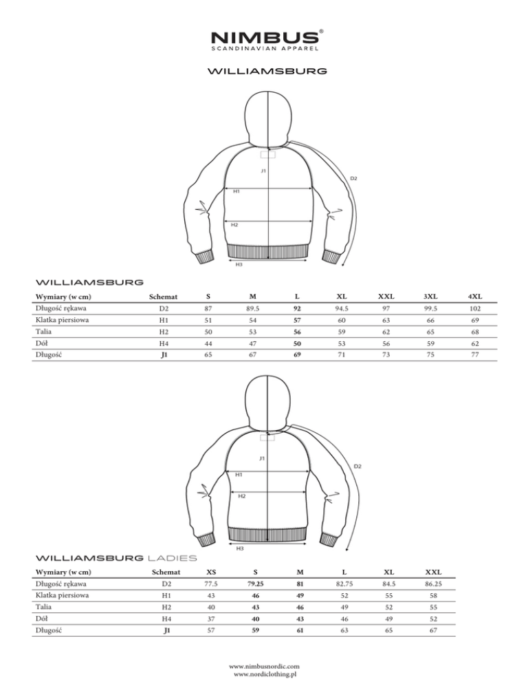 Williamsburg Williamsburg Wymiary (w cm) Schemat S Długość rękawa D2 87 M 89.5 Klatka piersiowa H1 51 54 Talia H2 50 53 Dół H4 44 47 Długość J1 65 67 L XL XXL 3XL 94.5 60 63 66 69 56 59 62 65 68 57 50 69 97 99.5 Schemat XS Długość rękawa D2 77.5 Klatka piersiowa H1 43 Talia H2 40 Dół H4 37 Długość J1 57 S 79.25 M 56 59 62 71 73 75 77 XL XXL L 81 82.75 84.5 86.25 52 55 58 43 46 49 52 55 46 49 52 59 61 63 65 67 46 40 49 43 www.nimbusnordic.com www.nordiclothing.pl 102 53 Williamsburg Ladies Wymiary (w cm) 4XL 92