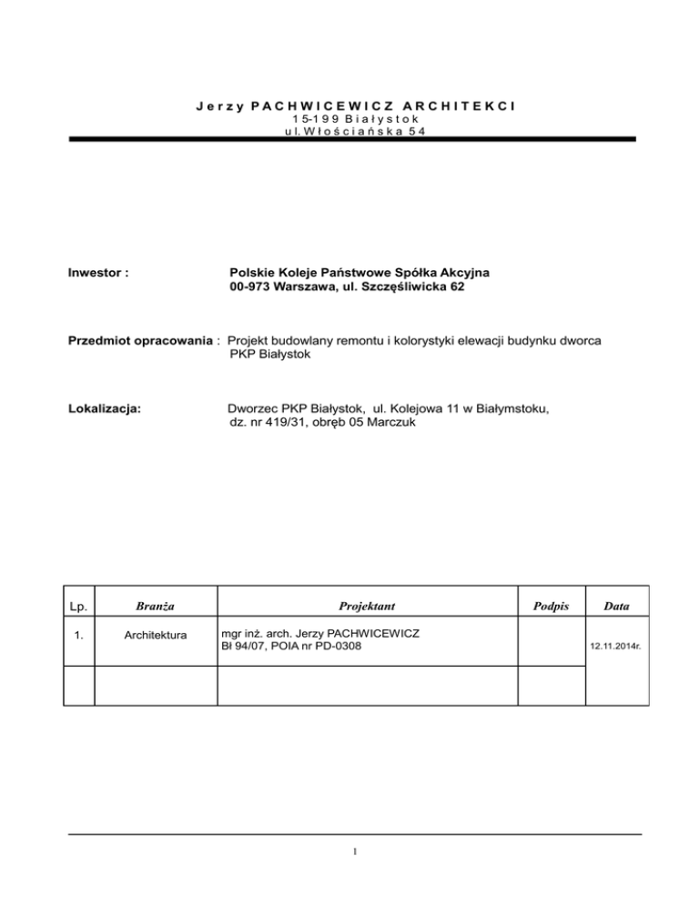 J er zy PAC H WICE WIC Z AR CH IT EK C I 1 5-1 9 9 B i a ł y s t o k u l. W ł o ś c i a ń s k a 5 4 Inwestor : Polskie Koleje Państwowe Spółka Akcyjna 00-973 Warszawa, ul. Szczęśliwicka 62 Przedmiot opracowania : Projekt budowlany remontu i kolorystyki elewacji budynku dworca PKP Białystok Lokalizacja: Lp. Branża 1. Architektura Dworzec PKP Białystok, ul. Kolejowa 11 w Białymstoku, dz. nr 419/31, obręb 05 Marczuk Projektant mgr inż. arch. Jerzy PACHWICEWICZ Bł 94/07, POIA nr PD-0308 1 Podpis Data 12.11.2014r. ZAWARTOŚĆ OPRACOWANIA Zał. 1. Zalecenia konserwatorskie znak ZN-II.5183.44.2014 z dnia 08.09.2014r.……............................str. 2a Zał. 2. Zaświadczenie z Izby Samorządu Zawodowego ……………………...........….............................str. 2b Zał. 3. Oświadczenie o zgodności dokumentacji z przepisami i zasadami wiedzy techniczne…..............str. 2c OPIS TECHNICZNY do projektu architektoniczno- budowlanego…………………….........…..str. 3-10 1. 2. 3. 4. 5. 6. 7. 8. 9. 10. 11. 12. 13. 14. Dane ogólne Przedmiot opracowania Podstawa opracowania Lokalizacja Charakterystyka stanu istniejącego Przyjęte rozwiązania techniczne Wpływ projektowanej inwestycji na środowisko Dane o rejestrze zabytków Ochrona przeciwpożarowa Media Dostosowanie do potrzeb osób niepełnosprawnych Charakterystyka energetyczna Uwagi końcowe Informacja BIOZ……………………………………………………………….…….…........str. 21-23 CZĘŚĆ GRAFICZNA do projektu architektoniczno- budowlanego............................................str. 11-20 Nr rys. 1 2 3 4 5 6 7 8 9 10 Tytuł Sytuacja 1:750 Inwentaryzacja - elewacja północno – zachodnia Inwentaryzacja - elewacja południowo -wschodnia Inwentaryzacja - elewacja północno -wschodnia Inwentaryzacja - elewacja południowo -zachodnia Elewacja północno – zachodnia 1:100 Elewacja południowo -wschodnia 1:100 Elewacja północno -wschodnia 1:100 Elewacja południowo -zachodnia 1:100 Detal kolorystyki 1:50 1:150 1:150 1:150 1:150 Dokumentacja fotograficzna i karty katalogowe.............................................................................str. 24-34 2 OPIS TECHNICZNY DO PROJEKTU ARCHITEKTONICZNO - BUDOWLANEGO 1. DANE OGÓLNE Inwestor: Polskie Koleje Państwowe Spółka Akcyjna, 00-973 Warszawa, ul. Szczęśliwicka 62. Lokalizacja: dworzec PKP Białystok przy ul. Kolejowej 11 w Białymstoku, dz. nr 419/31,obręb 05 Marczuk. 2. PRZEDMIOT OPRACOWANIA Przedmiotem opracowania jest remont i kolorystyka elewacji budynku dworca PKP Białystok przy ul. Kolejowa 11 w Białymstoku. Projekt dotyczy elewacji budynku oznaczonych roboczo jako segmenty: A, B, C, D, E i F dla pierzei dworca. 3. PODSTAWA OPRACOWANIA • Umowa z inwestorem • Zalecenia konserwatorskie znak ZN-II.5183.44.2014 z dnia 08.09.2014r. • Mapa do sytuacyjna w skali 1:750 • Wizja lokalna oraz uzgodnienia z przedstawicielami Inwestora • Inwentaryzacja elewacji wykonana przez autora projektu • Dokumentacja fotograficzna • Archiwalny projekt modernizacji i rozbudowy budynku dworca PKP Białystok Centralny z maja 1989r. wykonany przez Centralne Biuro Projektowo-Badawcze Budownictwa Kolejowego „KolProjekt”, autor mgr inż. arch. Leszek Jaromski • Archiwalna ekspertyza techniczna dotycząca fundamentów i ścian budynku dworca PKP w Białymstoku z dnia 18.12.1996 r., wykonana przez mgr inż. Ryszarda Dobrowolskiego • Archiwalna opinia techniczna fragmentów ścian i fundamentów budynku dworca w Białymstoku, wykonana przez mgr inż. Jana K. Grochowskiego • Archiwalny projekt budowlany modernizacji dworca PKP w Białymstoku ze stycznia 1999r. wykonany przez Spółdzielcze Biuro Projektów „Projekt” Spółdzielnia Pracy w Białymstoku, autor mgr inż. arch. Marek Tekień • Archiwalny projekt kolorystyki elewacji z marca 2003r. wykonany przez Spółdzielcze Biuro Projektów „Projekt” Spółdzielnia Pracy w Białymstoku, autor mgr inż. arch. Marek Tekień • Zdjęcia historyczne budynku dworca PKP Białystok • Prawo budowlane oraz normy i przepisy obowiązujące w budownictwie. 4. LOKALIZACJA Przedmiotowy budynek dworca PKP Białystok zlokalizowany jest przy ul. Kolejowa 11 w Białymstoku, dz. nr 419/31, obręb 05 Marczuk. Obiekt usytuowany jest między peronem dworca a placem przydworcowym przylegającym do ulicy Kolejowej i Zwycięstwa. 5. CHARAKTERYSTYKA STANU ISTNIEJĄCEGO 5.1. PARAMETRY TECHNICZNE Wymiary: długość elewacji frontowej – północno-zachodniej 153,98 m długość elewacji od strony peronów – południowo-wschodniej 153,98 m długość elewacji szczytowa – północno-wschodniej 20,77 m długość elewacji szczytowa – południowo-zachodniej 20,77 m wysokość budynku do kalenicy dachu 11,90 m ilość kondygnacji – 2 kondygnacje nadziemne, budynek częściowo podpiwniczony. Powierzchnia zabudowy: 2 118,78 m2 Kubatura: 16 858 m3 5.2. RYS HISTORYCZNY Budowa dworca kolejowego w Białymstoku wiąże się z przeprowadzeniem linii kolejowej Warszawa- 3 Petersburg, której odcinek białostocki ukończony został w 1862 r. i tą też datę należy uważać za datę ukończenia budowy dworca. Po tym okresie dworzec przechodził trzy fazy budowy. Podczas I wojny światowej budynek został zbombardowany i wypalony. Jak wykazują zdjęcia sprzed I wojny światowej peron od strony dworca był zadaszony, co zupełnie zmieniało wygląd elewacji budynku. Zadaszenie zniszczone było w czasie I wojny światowej i nigdy nie zostało odtworzone, budynek odbudowano w 1915 r. Podczas II wojny dworzec był wielokrotnie bombardowany przez lotnictwo w rezultacie tych zniszczeń utracony został pierwotny, bardzo bogaty wystrój wnętrz, udokumentowany na zachowanych zdjęciach z przełomu XIX i XX wieku. Po wojnie budynek został odbudowany bez zachowania pierwotnego wystroju wnętrz. Przez szereg lat nie remontowany. Remont kapitalny wraz z dobudową kolejnych aneksów do