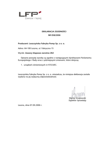 DEKLARACJA ZGODNOŚCI NR 058/2006 Producent: Leszczyńska Fabryka Pomp Sp. z o. o. Adres: 64-100 Leszno, ul. Fabryczna 15 Wyrób: Zawory klapowe zwrotne ZKZ Opisane powyżej wyroby są zgodne z następującymi dyrektywami Parlamentu Europejskiego i Rady wraz z późniejszymi zmianami, które dotyczą: 1. urządzeń ciśnieniowych nr 97/23/EC. Leszczyńska Fabryka Pomp Sp. z o. o. oświadcza, że niniejsza deklaracja została wydana na jej wyłączną odpowiedzialność. Maciej Strojkowski Dyrektor Sprzedaży Leszno, dnia 07.09.2006 r.