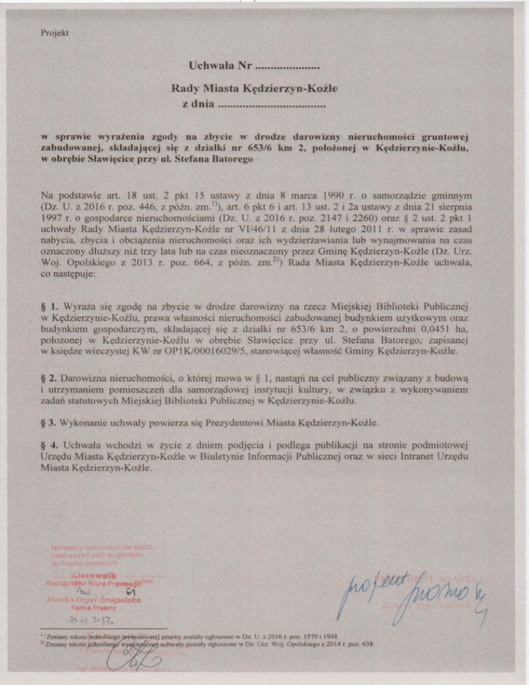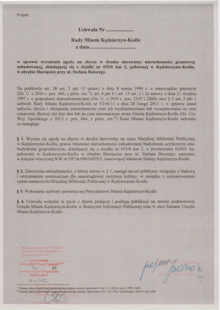 Projekt Uchwala Nr ..................... Rady Miasta Kędzierzyn-Koźle z dnia ................................. .. w sprawie wyrażenia zgody nn zbycie w drodze darowizny nieruchomości gruntowej zabudowanej, skladającej się z dzialki nr 653/6 km 2, polożoncj w Kędzierąnie-Koźlu, w obrębie Slawięcicc przy ul. Sterana Batorego Na podstawie art. 18 ust. 2 pkt 15 ustawy z dnia 8 marca 1990 r. o samorządzie gminnym (Dz. U. z 2016 r. poz. 446, z późno zm.!), art. 6 pkt 6 i arl. 13 ust. 2 i 2a usta\Ą')' z dnia 21 sierpnia 1997 r. o gospodarce nieruchomościami (Dz. U. z 2016 r. poz. 2147 i 2260) oraz § 2 usL 2 pkt I uchwały Rady Miasta Kędzierzyn-Koźle nr Vl/46/J I z dnia 28 lutego 2011 r. w sprawie zasad nabycia. Lbycia i obcią~enia nieruchomo ści oraz ich wydziertawiania lub wynajmowania na czas oznaczony dlużSzy nit trzy lala lub na czas nieoznaczony przez Gminę Kędzierzyn-Koźle (Dz. Urz. Woj. Opolskiego z 2013 r. poz. 664, z późno zm?») Rada Miasta Kędzierzyn-Koźle uchwala. co następuje : § I. Wyraża się zgodę na zbycie w drodze darowizny na rzecz Miejskiej Biblioteki Publicznej prav.'a własności nieruchomości zabudowanej budynkiem użytkowym oraz budynkiem gospodarczym, składającej się z działki nr 653/6 km 2, o powierzchni 0,0451 ha, położonej w Kędzierzynie-Koźlu w obrębie Sławięcice przy u!' Stefana Batorego: zapisanej w księdze wieczystej KW nr OPI KlOOOI6029/5. stanow iącej własność Gminy K~dzierzyn-Koźle . w Kędzierqnie-Koźlu, nieruchomości, o której mowa w § I. nastąpi na cel publiczny związany z budową i utrzymaniem pomieszczell dla samorządowej instytucji kultury, w związku z wykonywaniem zadaó statutowych Miejskiej Biblioteki Publicznej w Kędzierzynie-Koźlu. § 2. Darowizna § 3. Wykonanie uchwały powierza Urzędu Prezydentowi Miasta Kędzierzyn~Kożle. z dnicm podjęcia i podlega publikacji na stronic podmiotowej Miasla Kędzicrzyn-Koźle w Biuletynie Informacji Publiczncj oraz w sieci Intranel Urzędu § 4. Uchwala wchodzi w Miasta się życie Kędzierzyn-Koźle. t Iffi/II/I/L/~ ~ L'l rman \ I(ksu,. JedftoIile&Q )'ZmlAll) lekslu.I'alnollle w \I~'I1loncj liSIO .... )' ~osl~ly ogloslonc .... Dl U l 2016 r pQl 1579 I 19.18 ,e , uch .... aly ~OsI8ł)' Oj;IOSlont .... Dl Urt Woj. OpOlskiego l2014 r P-O/_ 638 Uzasa dnienie Rud) Miusla " s pnł\,i e " y rażenia ,god y na Lbycie " drodze daro\\izn) nieruchomośc i grun to\\ ej za budowanej, s kl ada j ącej s i ę l. dL iłtlki nr 653/6 km 2, polożon ej " Kędzi e n) ni t- K oź lu ,~, ob rę b ie S l a wi ęc i cc prl.y ul. Slda na Il a ło rcgo do projektu uch~ul ) Nieruchomość 7..abudowana budynkiem uzytkowym oraz budynkiem gospodarczym, nr 653/6 o powierzchni 0,0451 ha, połozona lA KędzierzYOIe-Kozlu w ob ręb i e S l awlęcice prl)' ul. Stefana Batorego 32 stanowi \.\:łasność Gminy Kędzierzyn-Koźle. W ww, budynku u»:ytkowym mieści się między mnymi lilia nr 8 Miejskiej Biblioteki Pub li cznej w Kędz i erzynie-Koźlu, natomiast budynek gospodarczy wykor/ystywany .lest prlcz Miejską B i bliotckę Pub l iczną w Kędzier.lynie-Koźlu (zwanej dalej Biblioteką) z przeznaczemem na pomieszczenie gospodarcze. Dyrektor Miejskiego Biblioteki Publicznej w Kędzierl.ynie-KolJu zwróci la się do Prezydenta Miasta Kędzierzyn-Koźle z wnioskiem dotyczącym uregulowania stanu prawnego ww. ni eruchomości. ObecnIt.: lilia nr 8 Biblioteki runkcjonuje w przedmiotowym budynku bez tytu lu prawnego, co zgodnie z uzasadnieniem do ww. wniosku, powoduje utrudnicnia w zarządz..aniu Bib li oteką oraz komplikuje sprawy dotyczące remontów i poszukiwania fu nduszy pozabud1:etowych na dzialalność Biblioteki. Mając na u\.... udzc powyższe, wszczęta zostala procedura dotycząca przckaz..mia \... drodze daro\.\.izny, pra\\u wlasnosci prLcdmiOlowej nieruchomości na rzecz' Biblioteki Nieruchomość ta zgodme z ustaleniami miejscowego planu l.agospodaro\'v'ama przestrzennego polozona jest na terenie o plleznaczaniu runkcjonalnym II MN/U. określo n ym jako teren zabudo\\.'} mleszkaniO\.\.ej jednorodzinnej 7 usługami. Waność rynkowa przedmiotowej nieruchomość określona zasiała na podstawie operutu szacunkowcgo spor.lądzoncgo pr.lCZ rzcczozl1awcli; mUJątko\.\cgo no kWO I ~ 407 800,00 d nellO. Ze względu na fakt, li. loka le zlokalizowane na piętr/e budynku st a n owiącego siedzibę liii. nr 8 Bibl ioteki. zajmowane są prlez Samorząd Mieszkańców OS lcdla Sławięcice, Polski Związek Emerytów, Rencistów i Inwalidów Kędzierzyn-Koź l e Grupę Te renową Sla\',.:ięcicc oraz Towarzystwo Społeczno-Kul t uralnego Niemców na Śląsku Opo lskim Ko lo S lawięcice, Dyrektor MIejskiej l3 iblioteki Publicznej w Kędzierzynic-Ko7.1u oświadczyła. IC po dokonan iu darowizny nieruc ho m ości, Bib li oteka udostęp n iać będlie te lokale na rzccz ww. podm iotów nieodplatnie. \.\' formie umowy użyczenia, z obowiązkiem zwrotu poniesionych kosztów eksploatacj i. Zgodnie z zapisami art. 13 ust. 2 ustawy z dnia 2 J sierpnia 1997 r. o gospodarce ni eruchomośc i ami darowizna może zoslać udzielona na cele publiczne. Darowizna pr/cdmiotowej nieruchomości, nastąpi na ceł publiczny okreś l ony w ano 6 pk t 6 ustawy o gospodarce nieruchomościami tj. budowa i utrz) manie pomieszc/cń dla samorządO\.V)lch instytucji kultury", rozumieniU przcpisów ustawy o organizowaniu i prowadzeniU działalnOŚCI kulturalnej. Zgodnie z art. 9 ustawy z dnia 25 paźdZiernika 1991 r. o orgamzowul11u I pro\.~ad..lel1lu d7iałalności kulturalnej jednostki samorządu terytorialnego organizują działalność kultura l ną, tv,:orząc samor..lądowe instytucje kultury. dla których prowadzenie takiej dzm l alności jest podsul\.\owym celem slatutO\\o,m. Prowadlcnie działalności kulturalnej jcst zadaniem własnym jednostek samorządu terytoria lnego o charakterze obowiązkowym. Zgodnie z art. 2 tejże usta ....'Y formami organizacyjnymi dzia ł a l ności ku lt uralnej są m. in. b