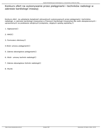 Szpital Rehabilitacyjno-Kardiologiczny w Kowanówku k/Obornik Wlkp. Konkurs ofert na wykonywanie przez pielęgniarki i techników radiologi w zakresie kardiologii inwazyj Konkurs ofert na udzielanie świadczeń zdrowotnych wykonywanych przez pielęgniarki i techników radialogii, w zakresie kardiologii inwazyjnej w Pracowni Kardiologii Inwazyjnej dla osób ubezpieczonych i uprawnionych na podstawie odrębnych przepisów, objętych opieką szpitalną. 1. Ogłoszenie 2. WKO 3. Formularz ofertowy 4.Wzór umowy pielęgniarki 5. Zakres obowiązkow pielęgniarki 6. Wzór umowy technik radiologii 7. Zakres obowiązkow ttchnik radiologii 8. Wynik http://www.kowanowko.com.pl Kreator PDF Utworzono 23 March, 2016, 22:55