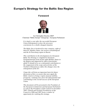 Europe's Strategy for the Baltic Sea Region Foreword by Christopher Beazley MEP Chairman "Baltic Europe" Intergroup - European Parliament It is timely a year after the successful European Union Enlargement to draw the necessary conclusions in a wholly changed situation. The Baltic Sea is bordered by nine countries, eight of them EU Member States, the enclave of Kaliningrad and the St Petersburg region in Russia. This contribution to the development of a European Baltic Sea Strategy is compiled by European Parliamentarians from all the eight Member States in the Region and supported by others from further afield. It should serve as a substantial contribution to the reappraisal of the scope and activities of the Northern Dimension to reflect the changes since the enlargement of the EU. I hope this will form an important basis for future discussion of how we assure that once again the Baltic returns to being a region of great stability, prosperity, realizing once more her full potential and contributing to the overall success of the European Union. This document will be presented to the Presidents of the European Commission and European Parliament as well as the Presidency of the Council in November 2005. Finnish and German Presidencies of the Council in 2006 and 2007 form a window of opportunity for realising the strategy. 1 Introduction by Toomas Hendrik Ilves MEP Chairman of the Baltic Strategy Working Group of the "Baltic Europe" Intergroup As of 1 May 2004 the Baltic Sea has, for all intents and purposes, turned into a European Union lake. All but a small section of the Baltic littoral is limned by EU members, sharing not only a common waterway, once again free for movement of people, goods and services but sharing in large part a common cultural heritage as well as legislation. This provides us with a unique opportunity to develop within the EU, regional programmes and policies that take into account the specific issues faced by all the EU countries bordering the Baltic Sea. It has also provided us with the opportunity to think further on the Northern Dimension. The ideas developed by members of the Baltic Intergroup of the European Parliament are now formulated in the Baltic Strategy Paper. Broadly, we focused on four areas the members considered most important: environment, economy, culture and education as well as security. This paper has been written by Baltic Strategy Working Group of 7 MEPs; Christopher Beazley, Michael Gahler, Satu Hassi, Toomas Hendrik Ilves, Ģirts Valdis Kristovskis, Henrik Lax and Alexander Stubb. 2 Foreword.......................................................................................................................1 Introduction..................................................................................................................2 I Environment ..............................................................................................................4 II Economics .................................................................................................................4 III Culture and Education...........................................................................................5 IV Security....................................................................................................................5 Background for the Baltic Sea Strategy.....................................................................6 I Environment ..............................................................................................................7 1. Eutrophication....................................................................................................7 2. Persistent harmful substances ............................................................................9 3. Oil discharges and oil transport .........................................................................9 4. Nuclear safety ..................................................................................................11 5. Biodiversity......................................................................................................11 II Economy: Achieving the Lisbon goals regionally ...............................................13 Winning the Lisbon Challenges together.............................................................13 Free movement of Labour, Capital, Goods and Services ....................................14 Improving the cross border infrastructure............................................................14 Ensuring the supply of safe and clean energy......................................................15 The innovative region of Europe .........................................................................16 Piloting the Common Economic Space with Russia............................................17 III Culture and Education.........................................................................................18 Education .............................................................................................................18 Culture..................................................................................................................19 Image and Identity ...............................................................................................19 Tourism and sports...............................................................................................20 IV Security..................................................................................................................21 3 I Environment • The Baltic Sea is one of the most polluted seas in the world. The EU needs a coherent action plan to protect the Baltic Sea. • The load of eutrophicating nutrients to the Baltic Sea must be drastically reduced via new activities in the EU agricultural policy. Also co-operation between EU, Russia, Belarus and Ukraine is needed. • Protecting Baltic Sea should be taken into account in developing the tra