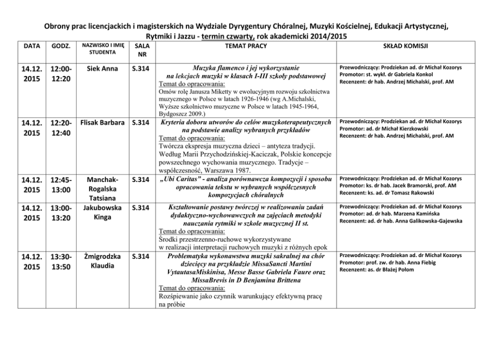 Obrony prac licencjackich i magisterskich na Wydziale Dyrygentury Chóralnej, Muzyki Kościelnej, Edukacji Artystycznej, Rytmiki i Jazzu - termin czwarty, rok akademicki 2014/2015 DATA GODZ. 14.12. 12:002015 12:20 NAZWISKO I IMIĘ STUDENTA SALA NR Siek Anna S.314 TEMAT PRACY Muzyka flamenco i jej wykorzystanie na lekcjach muzyki w klasach I-III szkoły podstawowej Temat do opracowania: SKŁAD KOMISJI Przewodniczący: Prodziekan ad. dr Michał Kozorys Promotor: st. wykł. dr Gabriela Konkol Recenzent: dr hab. Andrzej Michalski, prof. AM Omów rolę Janusza Miketty w ewolucyjnym rozwoju szkolnictwa muzycznego w Polsce w latach 1926-1946 (wg A.Michalski, Wyższe szkolnictwo muzyczne w Polsce w latach 1945-1964, Bydgoszcz 2009.) 14.12. 12:202015 12:40 Flisak Barbara S.314 S.314 14.12. 13:002015 13:20 ManchakRogalska Tatsiana Jakubowska Kinga 14.12. 13:302015 13:50 Żmigrodzka Klaudia S.314 14.12. 12:452015 13:00 S.314 Kryteria doboru utworów do celów muzykoterapeutycznych na podstawie analizy wybranych przykładów Temat do opracowania: Twórcza ekspresja muzyczna dzieci – antyteza tradycji. Według Marii Przychodzińskiej-Kaciczak, Polskie koncepcje powszechnego wychowania muzycznego. Tradycje – współczesność, Warszawa 1987. „Ubi Caritas” - analiza porównawcza kompozycji i sposobu opracowania tekstu w wybranych współczesnych kompozycjach chóralnych Przewodniczący: Prodziekan ad. dr Michał Kozorys Promotor: ad. dr Michał Kierzkowski Recenzent: dr hab. Andrzej Michalski, prof. AM Kształtowanie postawy twórczej w realizowaniu zadań dydaktyczno-wychowawczych na zajęciach metodyki nauczania rytmiki w szkole muzycznej II st. Temat do opracowania: Środki przestrzenno-ruchowe wykorzystywane w realizacji interpretacji ruchowych muzyki z różnych epok Problematyka wykonawstwa muzyki sakralnej na chór dziecięcy na przykładzie MissaSancti Martini VytautasaMiskinisa, Messe Basse Gabriela Faure oraz MissaBrevis in D Benjamina Brittena Temat do opracowania: Rozśpiewanie jako czynnik warunkujący efektywną pracę na próbie Przewodniczący: Prodziekan ad. dr Michał Kozorys Promotor: ad. dr hab. Marzena Kamioska Recenzent: ad. dr hab. Anna Galikowska-Gajewska Przewodniczący: Prodziekan ad. dr Michał Kozorys Promotor: ks. dr hab. Jacek Bramorski, prof. AM Recenzent: ks. ad. dr Tomasz Rakowski Przewodniczący: Prodziekan ad. dr Michał Kozorys Promotor: prof. zw. dr hab. Anna Fiebig Recenzent: as. dr Błażej Połom 14.12. 13:502015 14:10 Kowalski Mariusz S.314 14.12. 14:152015 14:35 Zalesioska Maja S.314 14.12. 14:352015 14:55 Godlewska Anna S.314 14.12. 15:052015 15:25 Rogalski Marek S.314 Analiza wybranych utworów Ola Gjeilo, MortenaLauridsena i EricaWhitacre`a w kontekście amerykańskiej chóralistyki Temat do opracowania: Praca dyrygenta nad partyturą. Praca dyrygenta z zespołem opracowanie nowego utworu Sposoby kształtowania tekstu oraz jego oddziaływanie na strukturę oblicza dźwiękowego utworu chóralnego na przykładzie wybranych dzieł kompozytorów polskich XX i XXI wieku Temat do opracowania: Główne zadania dyrygenta. Osobowość i uzdolnienia 30–lecie działalności Chóru Mieszanego ‘CantoresVeiherovienses’ Temat do opracowania: Rola i znaczenie amatorskiego zespołu chóralnego w kształtowaniu i rozwijaniu kultury muzycznej w społeczeństwie – cele zadania Super fluminaBabylonis –Psalm 137, jako źródło kompozytorskiego i wykonawczego natchnienia w wybranych opracowaniach chóralnych Temat do opracowania: Dyrygowanie. Najważniejsze problemy techniki manualnej w dyrygowaniu Przewodniczący: Prodziekan ad. dr Michał Kozorys Promotor: ad. dr Anna Wilczewska Recenzent: ad. dr hab. Beata Wróblewska Przewodniczący: Prodziekan ad. dr Michał Kozorys Promotor: prof. zw. dr hab. Marcin Tomczak Recenzent: ad. dr Anna Wilczewska Przewodniczący: Prodziekan ad. dr Michał Kozorys Promotor: prof. zw. dr hab. Marek Rocławski Recenzent: ad. dr hab. Aleksandra Grucza-Rogalska Przewodniczący: Prodziekan ad. dr Michał Kozorys Promotor: ad. dr hab. Aleksandra Grucza-Rogalska Recenzent: ad. dr Sławomir Bronk
