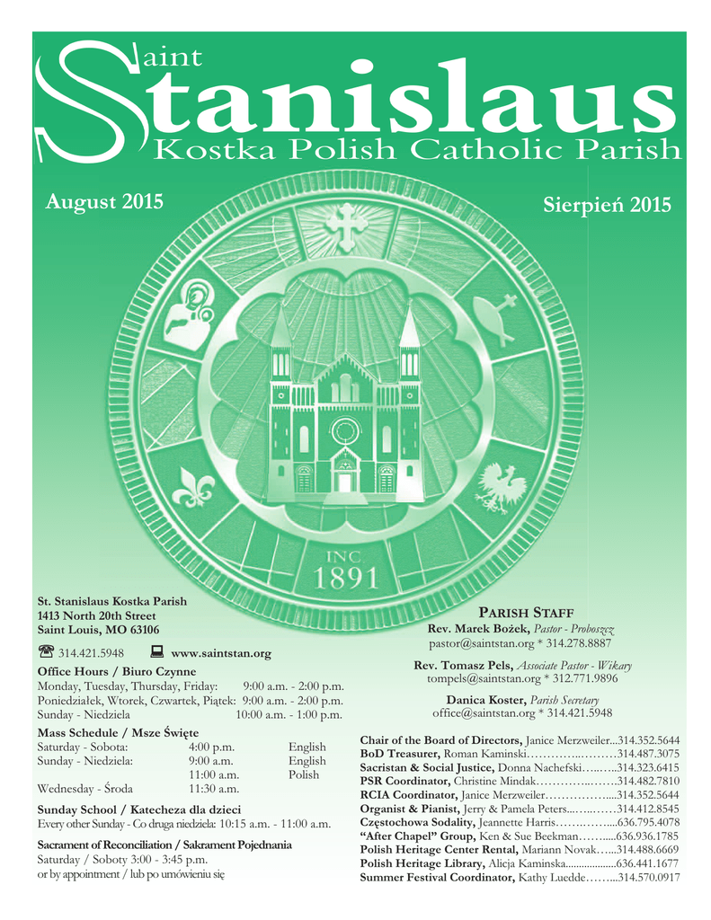 August 2015 St. Stanislaus Kostka Parish 1413 North 20th Street Saint Louis, MO 63106 ! 314.421.5948 ! www.saintstan.org Office Hours / Biuro Czynne Monday, Tuesday, Thursday, Friday: 9:00 a.m. - 2:00 p.m. Poniedziałek, Wtorek, Czwartek, Piątek: 9:00 a.m. - 2:00 p.m. Sunday - Niedziela 10:00 a.m. - 1:00 p.m. Mass Schedule / Msze Święte Saturday - Sobota: 4:00 p.m. English Sunday - Niedziela: 9:00 a.m. English 11:00 a.m. Polish Wednesday - Środa 11:30 a.m. Sunday School / Katecheza dla dzieci Every other Sunday - Co druga niedziela: 10:15 a.m. - 11:00 a.m. Sacrament of Reconciliation / Sakrament Pojednania Saturday / Soboty 3:00 - 3:45 p.m. or by appointment / lub po umówieniu się Sierpień 2015 PARISH STAFF Rev. Marek Bożek, Pastor - Proboszcz [email protected] * 314.278.8887 Rev. Tomasz Pels, Associate Pastor - Wikary [email protected] * 312.771.9896 Danica Koster, Parish Secretary [email protected] * 314.421.5948 Chair of the Board of Directors, Janice Merzweiler...314.352.5644 BoD Treasurer, Roman Kaminski…………..………314.487.3075 Sacristan & Social Justice, Donna Nachefski…..…..314.323.6415 PSR Coordinator, Christine Mindak…………..…….314.482.7810 RCIA Coordinator, Janice Merzweiler……………....314.352.5644 Organist & Pianist, Jerry & Pamela Peters...…..……314.412.8545 Częstochowa Sodality, Jeannette Harris…….……....636.795.4078 “After Chapel” Group, Ken & Sue Beekman…….....636.936.1785 Polish Heritage Center Rental, Mariann Novak…...314.488.6669 Polish Heritage Library, Alicja Kaminska...................636.441.1677 Summer Festival Coordinator, Kathy Luedde……...314.570.0917 St. Stanislaus® Kostka August * Sierpień 2015 St. Stanislaus Kostka Parish Welcomes You! All baptized Christians who believe that Jesus Christ is truly present in the Eucharistic bread and wine are invited to join us in receiving Holy Communion. August 1 4:00 p.m. August 2 9:00 a.m. Wszyscy ochrzczeni wyznający wiarę w prawdziwą obecność Pana Jezusa w Eucharystii są zaproszeni do przyjęcia komunii świętej w naszym kościele. 11:00 a.m. (Polish) August 8 4:00 p.m. GLUTTEN-FREE OPTION Please let us know if you would like to receive holy communion with a gluten-free bread, as such an option is available at our church. Kindly visit the sacristy prior to Mass to make your request. August 9 9:00 a.m. WE USE THE VATICAN II MISSAL WE SAY * AND ALSO WITH YOU * August 16 9:00 a.m. At St. Stanislaus we continue to pray the originally authorized English translation of the Vatican II Catholic Liturgy. It is slightly different from the Mass prayers currently used in the Roman Catholic parishes. If you are unsure about the texts we use, please feel free to follow “The Order of the Mass” as it appears in readily available Saint Joseph Sunday Missals. 11:00 a.m. (Polish) August 22 4:00 p.m. COFFEE AND DOUGHNUTS are served after Sunday Masses in the Polish Heritage Center. All are welcome! Zapraszamy wszystkich na KAWĘ i CIASTO po Mszy niedzielnej w Domu Dziedzictwa Polskiego. WEDNESDAY BIBLE STUDY Our Bible Study takes place every Wednesday at 10am. It is based on the Lectionary Scripture selections read on Sunday Mass. This program helps make the Scriptures easier to understand, explain historical and cultural background and encourage the participants to apply these texts to their daily lives. FREE HEALTH SCREENING Thanks to the generous parishioners donating their time and skills, every first Sunday of the month, from 10:15 a.m. until 12:45 p.m. there are two nurses (one English speaking, one Polish) offering invaluable healthy lifestyle advice as well as free blood pressure testing. August 15 4:00 p.m. August 23 9:00 a.m. 11:00 a.m. (Polish) August 29 4:00 p.m. August 30 9:00 a.m. 11:00 a.m. (Polish) 2 Vigil of the Eighteenth Ordinary Sunday † Lorraine Jankowski Intention of Dolores Vierling Eighteenth Sunday in Ordinary Time † Joseph Kirkiewicz Intention of Adam & Leona Kaminski † Julia Slesinska Intencja Our Lady of Czestochowa Rosary Sodality Vigil of the Nineteenth Ordinary Sunday † Marie Bialczak Intention of The Family Nineteenth Sunday in Ordinary Time † Joseph Kirkiewicz Intention of Adam & Leona Kaminski Vigil of the Twentieth Ordinary Sunday The Galkowski Family - 50th Anniversary Intention of Joe & Ginnie Galkowski Twentieth Sunday in Ordinary Time † Gene Czerniewski Intention of The Family † Maria Baran Intencja Elizbieta Swietlicki Vigil of the Twenty-First Ordinary Sunday The Bialczak & Rudawski Families Intention of The Bialczak Family Twenty-First Sunday in Ordinary Time † Albert Woloncewicz Intention of Bernice Woloncewicz † Janine Walas Intencja Zdzistaw Walas Vigil of the Twenty-Second Ordinary Sunday Kenneth Larkin & Bob Dahm Intention of Matthew & Donald Mahan Twenty-Second Sunday in Ordinary Time † Joseph Kirkiewicz Intention of Adam & Leona Kaminski † Antoni Kirkiewicz Intencja Donna Nachefski MASS INTENTIONS INTENCJE MSZALNE Please call the rectory, or visit on Sunday, to schedule a Mass for your loved ones, living or deceased. * Intencje Mszalne można zamawiać przez telefon w biurze parafialnym, lub po niedzielnej Mszy Świętej. St. Stanislaus® Kostka 3 August * Sierpień 2015 Antoni Kirkiewicz passed away on Tuesday July 21, 2015 at the age of 70 years. He is survived by his mother Helena Kirkiewicz, wife Martha and daughters Michelle, Sherry, and Melissa along with grandchildren, one brother and two sisters. Funeral Services were held at Baue Funeral Home. THERE IS A PROMISE OF MARRIAGE BETWEEN: BETTY HUGHES AND STEVE TORRETTA ON AUGUST 1, 2015 AT 11:00 A.M. LISA RIEK AND MEGAN PETRA ON AUGUST 14, 2015 AT 6:00 P.M. JEANNE LACHMILLER AND KEVIN WALK ON AUGUST 22, 2015 AT. 2:00 P.M. AJA PALMER AND PAUL WASHINGTON II ON SEPTEMBER 6, 2015 AT 3:00 P.M. RACHEL FREEMAN AND TONY DENISZCZUK ON SEPTEMBER 19, 2015 AT 2:00 P.M. NICOLE POSLUSZNY AND CARL EARLS ON SEPTEMBER 26, 2015 AT 1:00 P.M. CHRISTOPHER COR