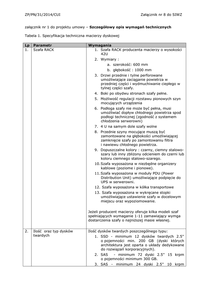 ZP/PN/31/2014/CUI Załącznik nr 8 do SIWZ załącznik nr 1 do projektu umowy – Szczegółowy opis wymagań technicznych Tabela 1. Specyfikacja techniczna macierzy dyskowej Lp 1. Parametr Szafa RACK Wymagania 1. Szafa RACK producenta macierzy o wysokości 42U 2. Wymiary : a. szerokość: 600 mm b. głębokość : 1000 mm 3. Drzwi przednie i tylne perforowane umożliwiające zaciąganie powietrza w przedniej części i wydmuchiwanie ciepłego w tylnej części szafy. 4. Boki po obydwu stronach szafy pełne. 5. Możliwość regulacji rozstawu pionowych szyn mocujących urządzenia 6. Podłoga szafy nie może być pełna, musi umożliwiać dopływ chłodnego powietrza spod podłogi technicznej (zgodność z systemem chłodzenia serwerowni) 7. 4 U na samym dole szafy wolne 8. Przednie szyny mocujące muszą być zamontowane na głębokości umożliwiającej zamknięcie szafy po zamontowaniu filtra i nawiewu chłodnego powietrza. 9. Dopuszczalne kolory : czarny, ciemny stalowoszary lub inny zbliżony odcieniem do czerni lub koloru ciemnego stalowo-szarego. 10. Szafa wyposażona w niezbędne organizery kablowe (poziome i pionowe). 11. Szafa wyposażona w moduły PDU (Power Distribution Unit) umożliwiające podpięcie do UPS w serwerowni. 12. Szafa wyposażona w kółka transportowe 13. Szafa wyposażona w wykręcane stopki umożliwiające ustawienie szafy w docelowym miejscu oraz wypoziomowanie. Jeżeli producent macierzy oferuje kilka modeli szaf spełniających wymaganie 1-11 zamawiający wymga dostarczenia szafy o najniższej masie własnej. 2. Ilość oraz typ dysków twardych Ilość dysków twardych poszczególnego typu: 1. SSD - minimum 12 dysków twardych 2.5'' o pojemności min. 200 GB (dyski których architektura jest oparta o układy dedykowane do rozwiązań korporacyjnych). 2. SAS - minimum 72 dyski 2.5'' 15 krpm o pojemności minimum 300 GB. 3. SAS - minimum 24 dyski 2.5'' 10 krpm ZP/PN/31/2014/CUI Załącznik nr 8 do SIWZ o pojemności min. 1.2 TB 3. Obsługa dysków twardych Macierz musi mieć możliwość obsługi dysków twardych 2,5'' oraz 3,5''. Musi umożliwiać montaż różnych typów dysków twardych (SSD, SAS) w obrębie jednej półki dyskowej obsługującej dany format dysków (2,5'' lub 3,5'') 4. 5. Ilość półek dyskowych Ilość obsługiwanych dysków twardych minimum 5 półek dyskowych Maksymalna ilość dysków twardych obsługiwanych, przez max. dwa kontrolery pracujące w trybie active - active większa bądź równa 480 sztuk. 6. Rozlokowanie dysków twardych 7. Bezpieczeństwo danych 8. Obsługiwane protokoły 9. Aktywowane protokoły 10. Wymagana ilość i prędkość portów Fiber Channel w pojedynczym kontrolerze 11. Typy obsługiwanych portów 12. Możliwość instalacji portów 10 Gbps Poprzez możliwość obsługi 480 dysków twardych zamawiający rozumie możliwość rozbudowy macierzy wyłącznie o kolejne półki dyskowe oraz dyski twarde bez konieczności wymiany, klastrowania lub dokupienia dodatkowych kontrolerów dyskowych. Mówiąc o obsłudze 480 dysków twardych zamawiający nie dopuszcza wirtualizowania za pomocą mechanizmów macierzy innych zewnętrznych zasobów dyskowych Rozlokowanie dysków pomiędzy półkami zgodne z zaleceniami producenta dla uzyskania jak największej wydajności macierzy Wszystkie krytyczne komponenty macierzy, których awaria może mieć wpływ na stabilność pracy, dostęp do danych i wydajność macierzy dyskowej, takie jak: kontrolery dyskowe, pamięć cache, baterie w kontrolerach dyskowych, zasilacze, wentylatory muszą być redundantne, tak, aby awaria pojedynczego elementu nie przerywała funkcjonowania pracy całej macierzy. Komponenty te muszą być wymienialne w trakcie pracy macierzy (Hot-Swap). Macierz oraz półki dyskowe muszą mieć możliwość jednoczesnego zasilania z dwóch niezależnych źródeł prądu. Zanik jednego z nich nie może powodować przerwy w pracy urządzenia ani zmniejszenia jego wydajności lub utraty danych. Macierz musi mieć możliwość obsługi następujących protokołów: 1. FC 2. iSCSI (dopuszczalne jako opcja) 3. FCOE (dopuszczalne jako opcja) Zamawiający dopuszcza rozwiązania obsługujące dodatkowe protokoły (np. CIFS, NFS i inne). Zamawiający wymaga aktywowania minimum protokołu FC (Fibre Channel). Minimum 6 portów FC, o prędkości minimum 8Gbps (gotowych do pracy i podłączenia do sieci SAN). Zamawiający wymaga aby oprócz obsługi portów FC, macierz posiadała możliwość obsługi portów : 1 oraz 10 Gbps iSCSI/FCoE, 1 oraz 10 Gbps Ethernet Minimum 8 portów. Zamawiający nie wymaga instalacji portów 10Gbps. ZP/PN/31/2014/CUI 13. Ilość kontrolerów dyskowych 14. Ilość pamięci cache w pojedynczym kontrolerze 15. Kopie migawkowe (snapshot) 16. Spójne kopie migawkowe 17. Możliwość wykonywania kopii zasobów w obrębie macierzy dyskowej 18. Rozmiar wolumenów 19. Przenoszenie danych w obrębie macierzy dyskowej Załącznik nr 8 do SIWZ Minimum dwa kontrolery dyskowe działające w trybie active-active. Awaria jednego z kontrolerów nie może wpłynąć na spójność danych. W przypadku awarii jednego z kontrolerów macierz musi nadal zapewniać dostęp do danych udostępnionych serwerom (przy założeniu że serwer obsługuje minimum dwie różne ścieżki FC do zasobów z macierzy) Minimum 16GB wewnętrznej pamięci w każdym kontrolerze, podtrzymywanej bateryjnie bądź kopiowanej na pamięć nieulotną typu flash w przypadku awarii. W przypadku awarii jednego z kontrolerów nie może dojść do utraty danych zgromadzonych w pamięci cache kontrolera (dotyczy min. danych zapisywanych na macierz dyskową przez serwery). Macierz musi być wyposażona w wewnętrzny (aktywny) system kopii migawkowych, dostępny dla wszystkich rodzajów danych przechowywanych w macierzy. Ilość kopii migawkowych nie może być ograniczona licencyjnie. Zamawiający wymaga aby oferowana macierz posiadała możliwość wykonywania spójnych (pod kątem spójnoś